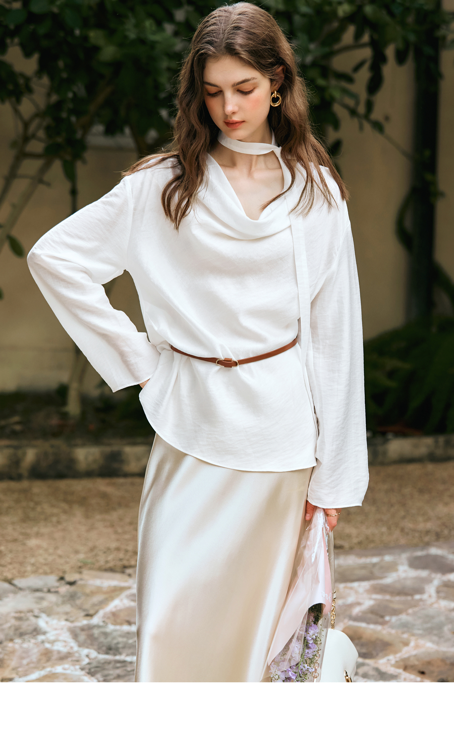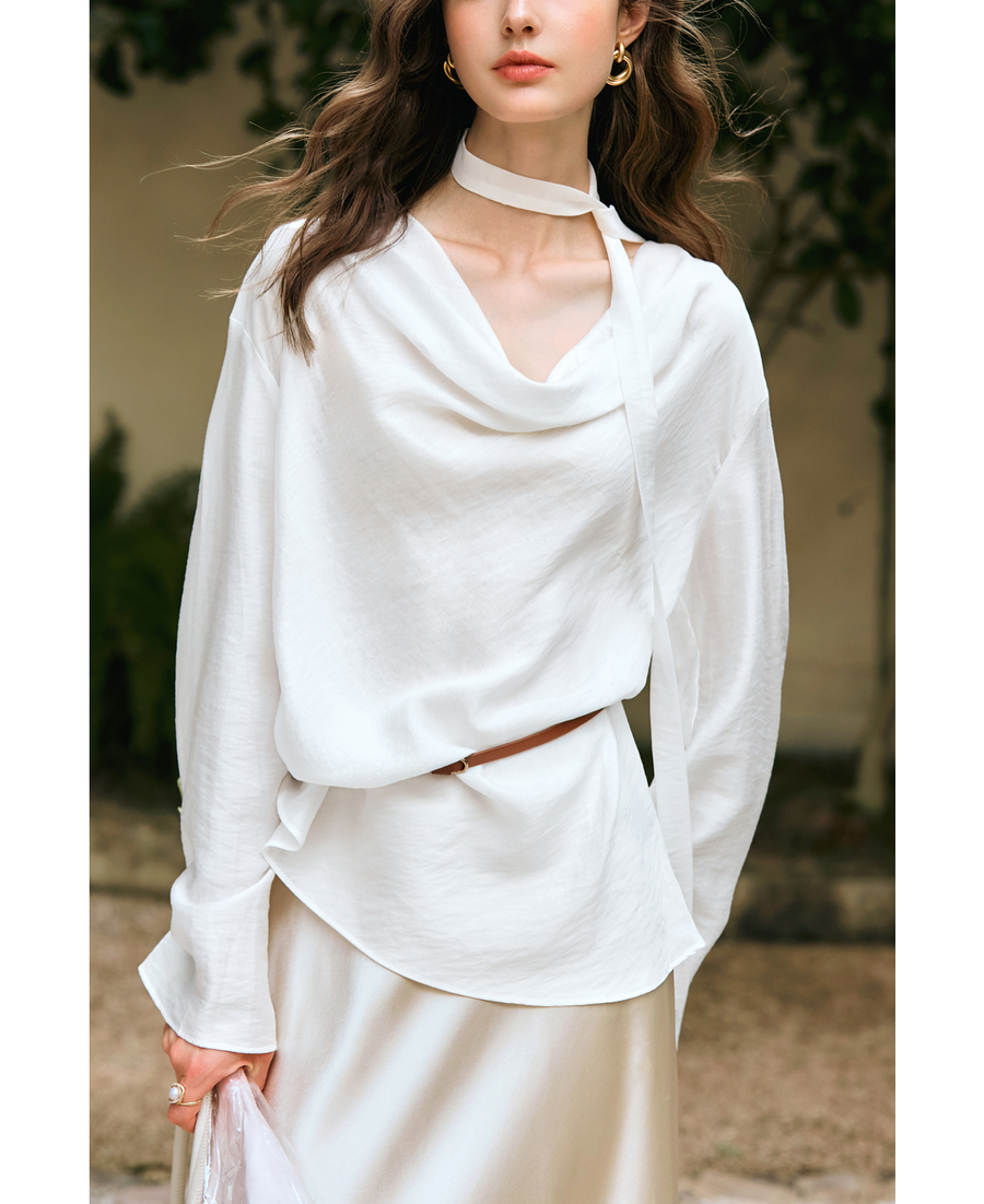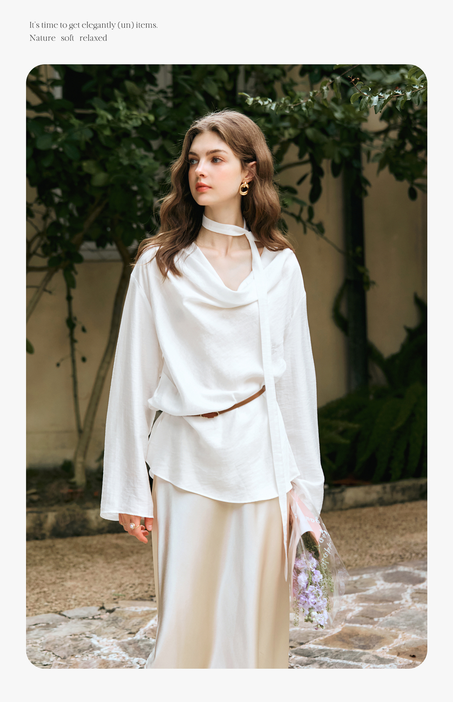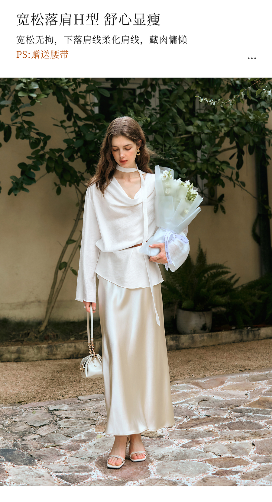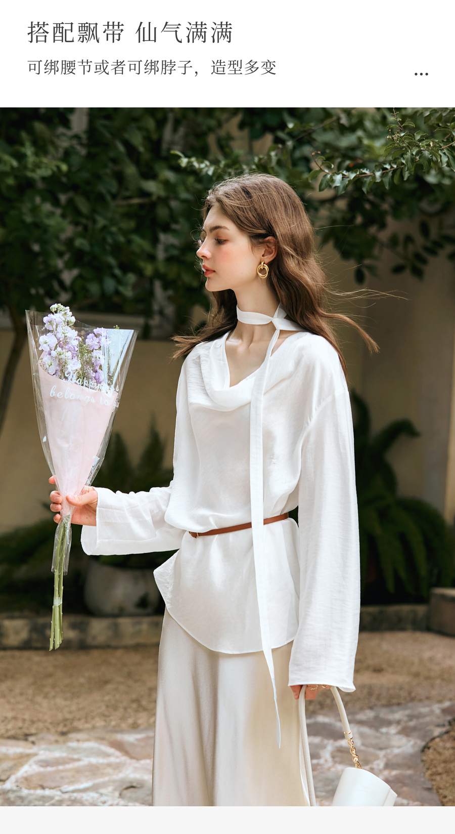 OLrain欧芮儿法式白色雪纺衫女冬季2024年新款慵懒风荡领飘带上衣