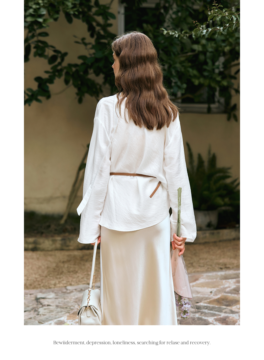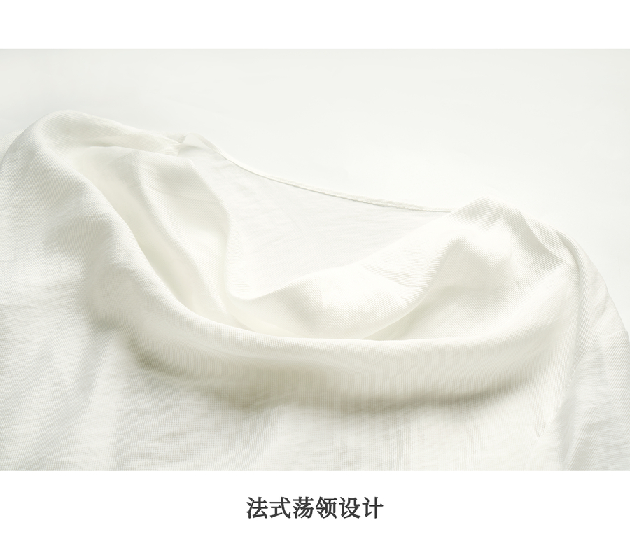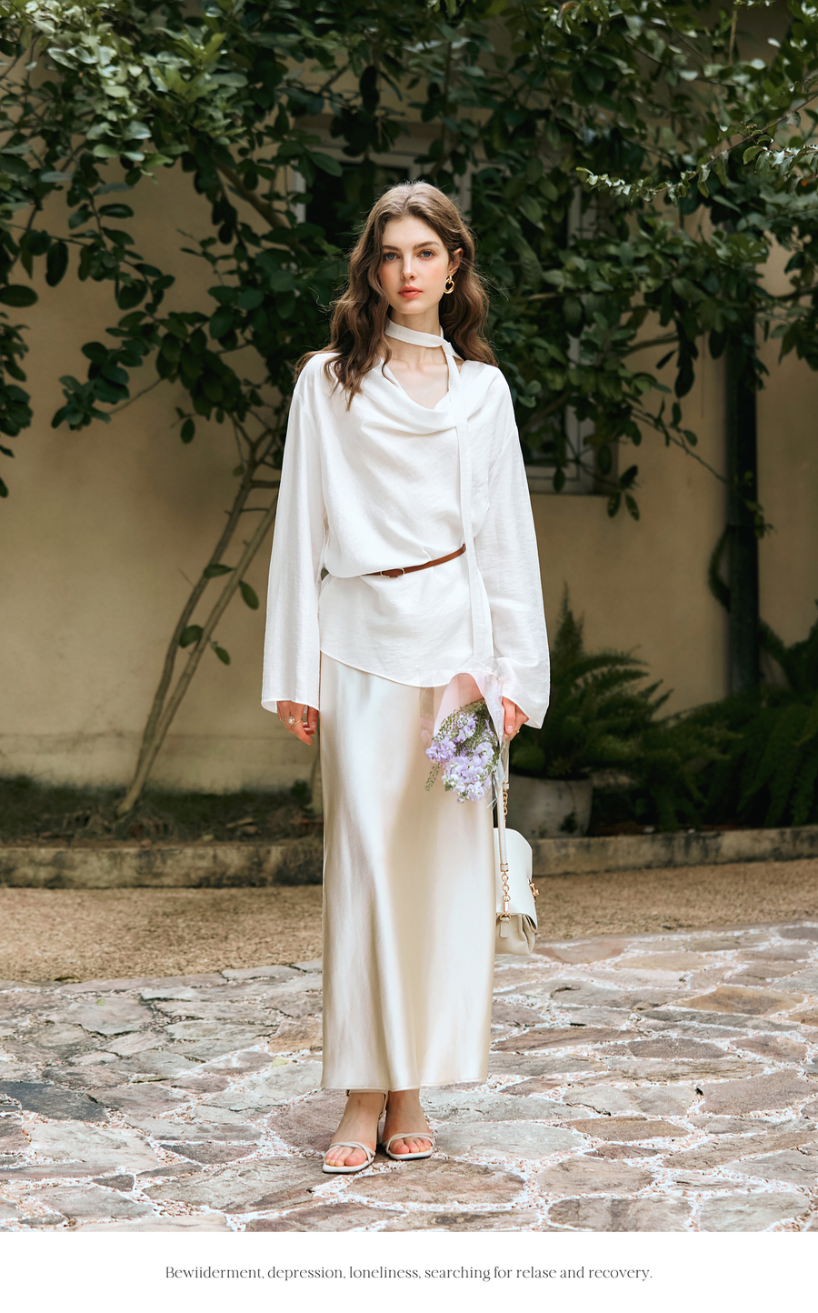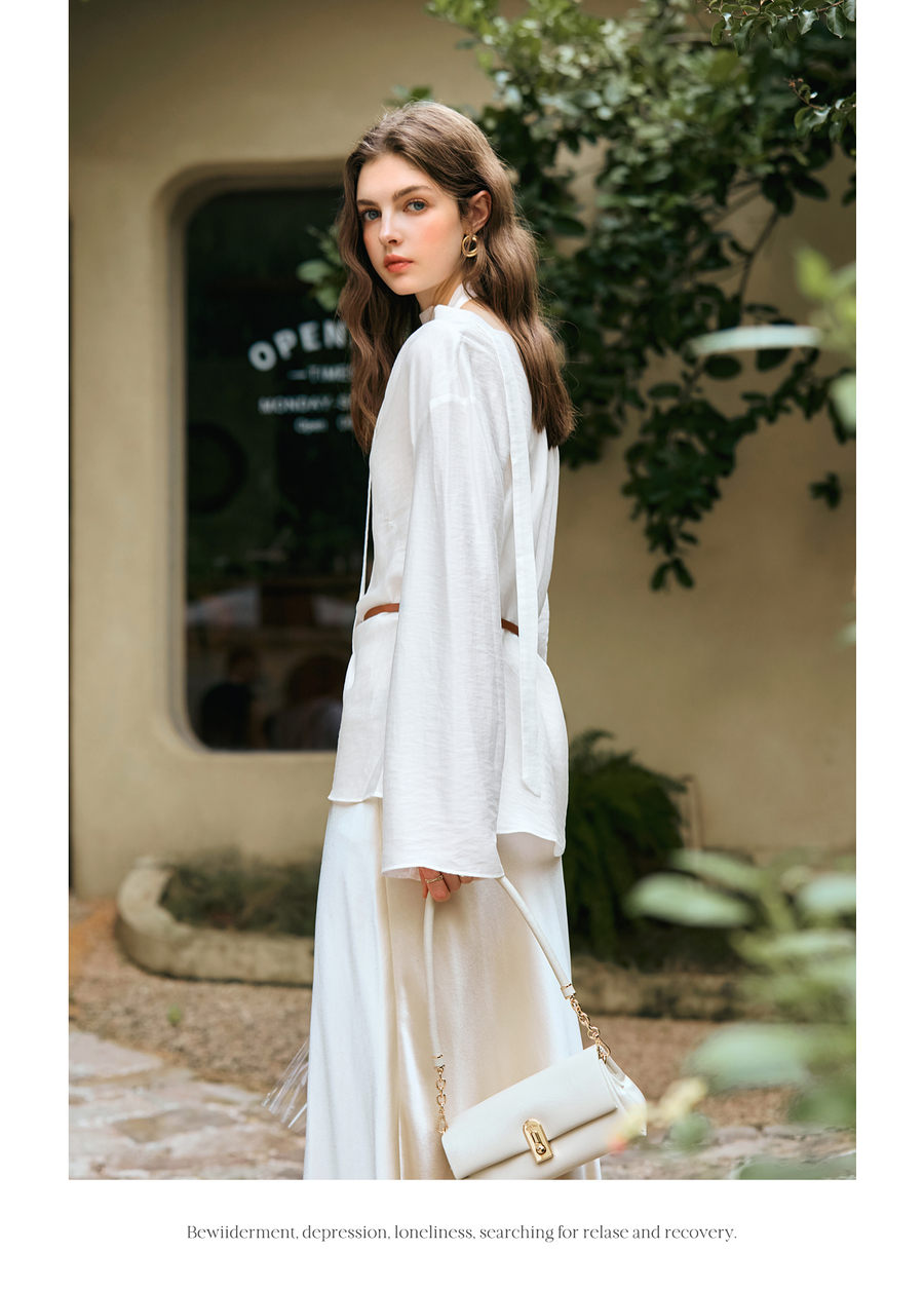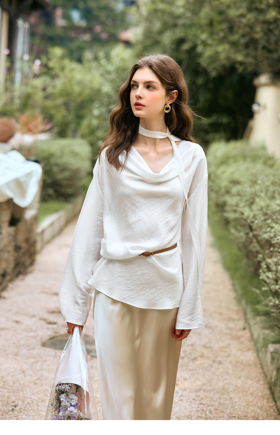 OLrain欧芮儿法式白色雪纺衫女冬季2024年新款慵懒风荡领飘带上衣