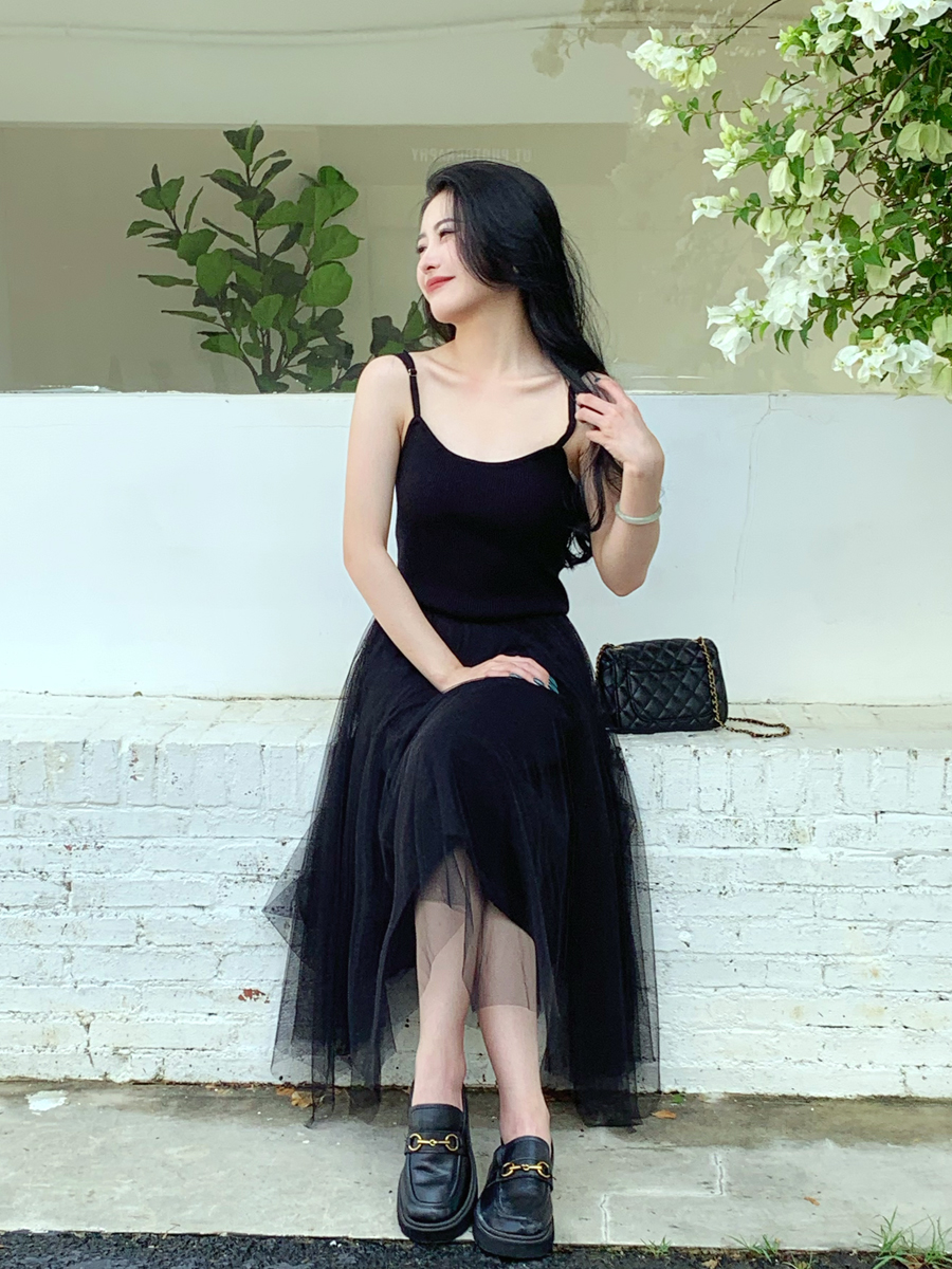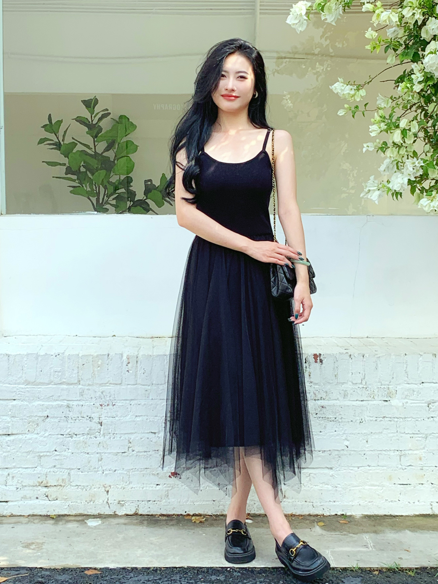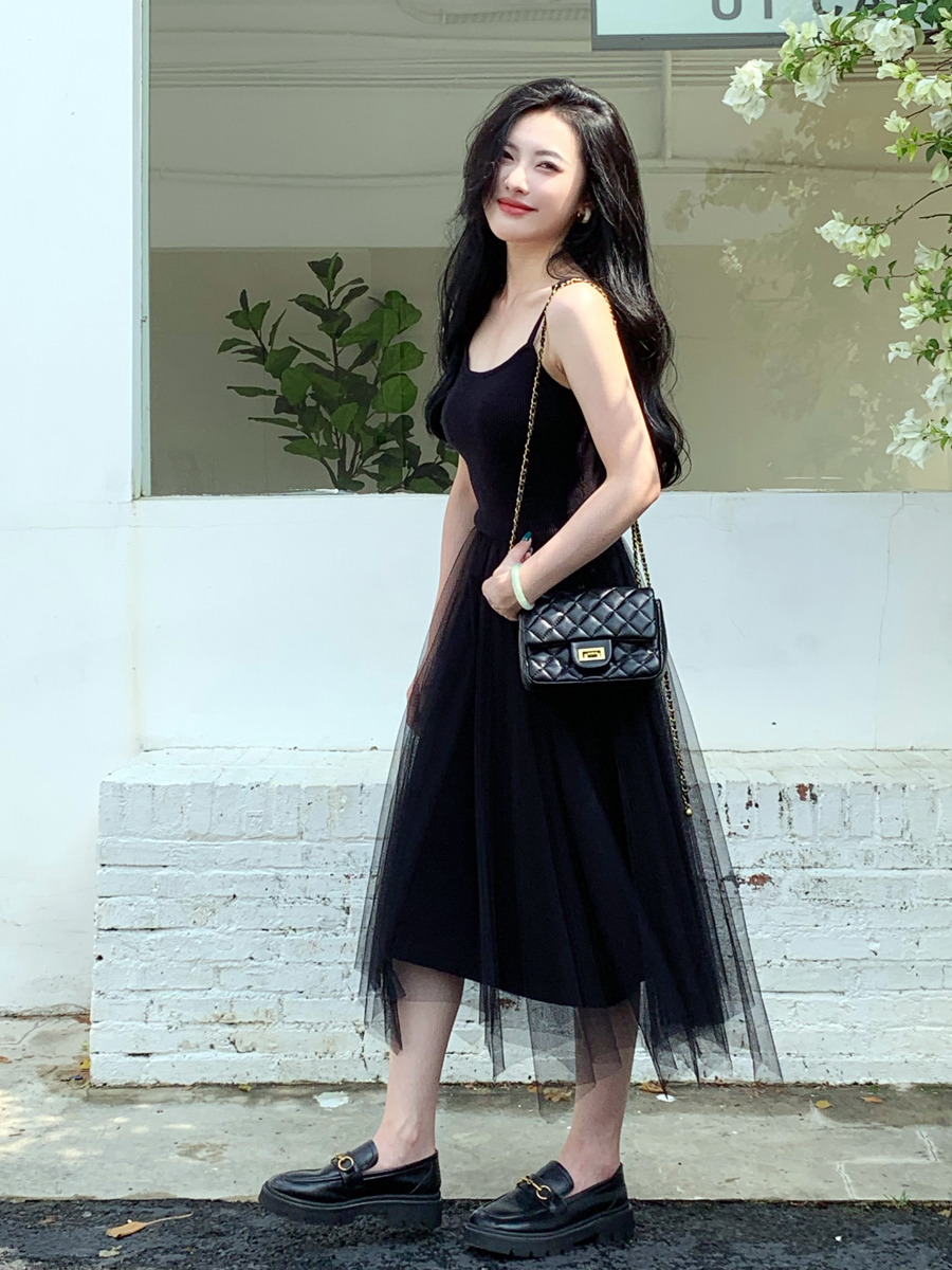 【百图lulu定制】【假日吊带网纱裙】上衣弹力坑条 不规则网纱裙摆 拼接 肩带可调节吊带连衣裙