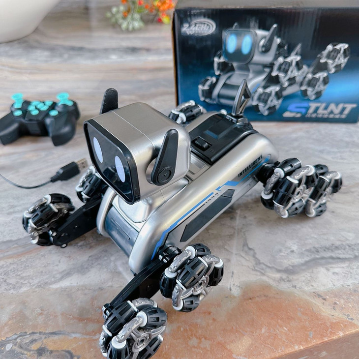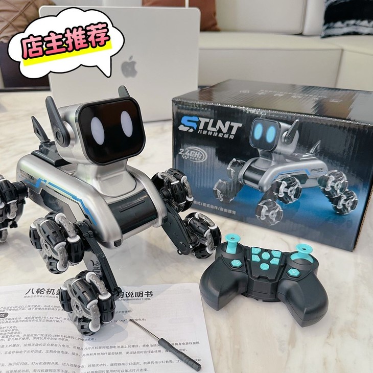 ✨2.4G无线超远距离遥控 ✨8个耐磨灵活的麦克纳姆轮,抗撞抗摔! 无论是在沙地、越野、凹凸路面都能稳稳越过,操控性能以及脱困能力max ❗ ❗ 🉑支持多台机械特技狗同台竞技,2.4G高性能遥控,不会互相干扰 简直就是遥控车里的王者 车身配套充电电池 遥控器适配普通5号电池2节,需自备