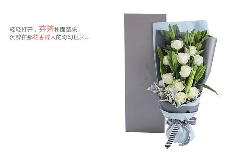 爱是唯一雪山白玫瑰11枝、白百合3枝、银叶菊0.5扎、栀子叶2枝 蓝灰色绝色纸1张,灰色雾面纸1张,白蓝细纹罗文带1米、60#大号魔力铁山灰包装盒