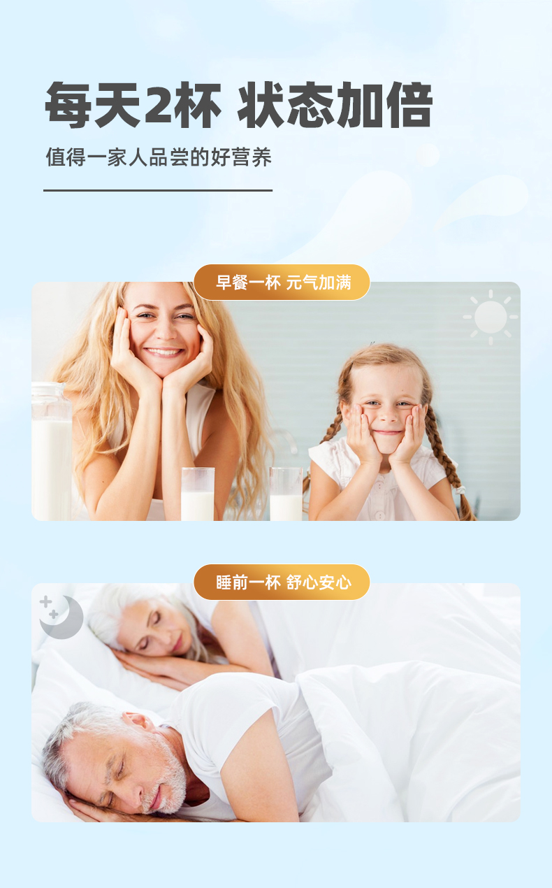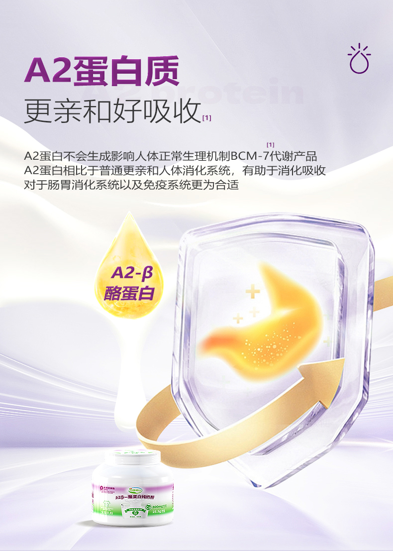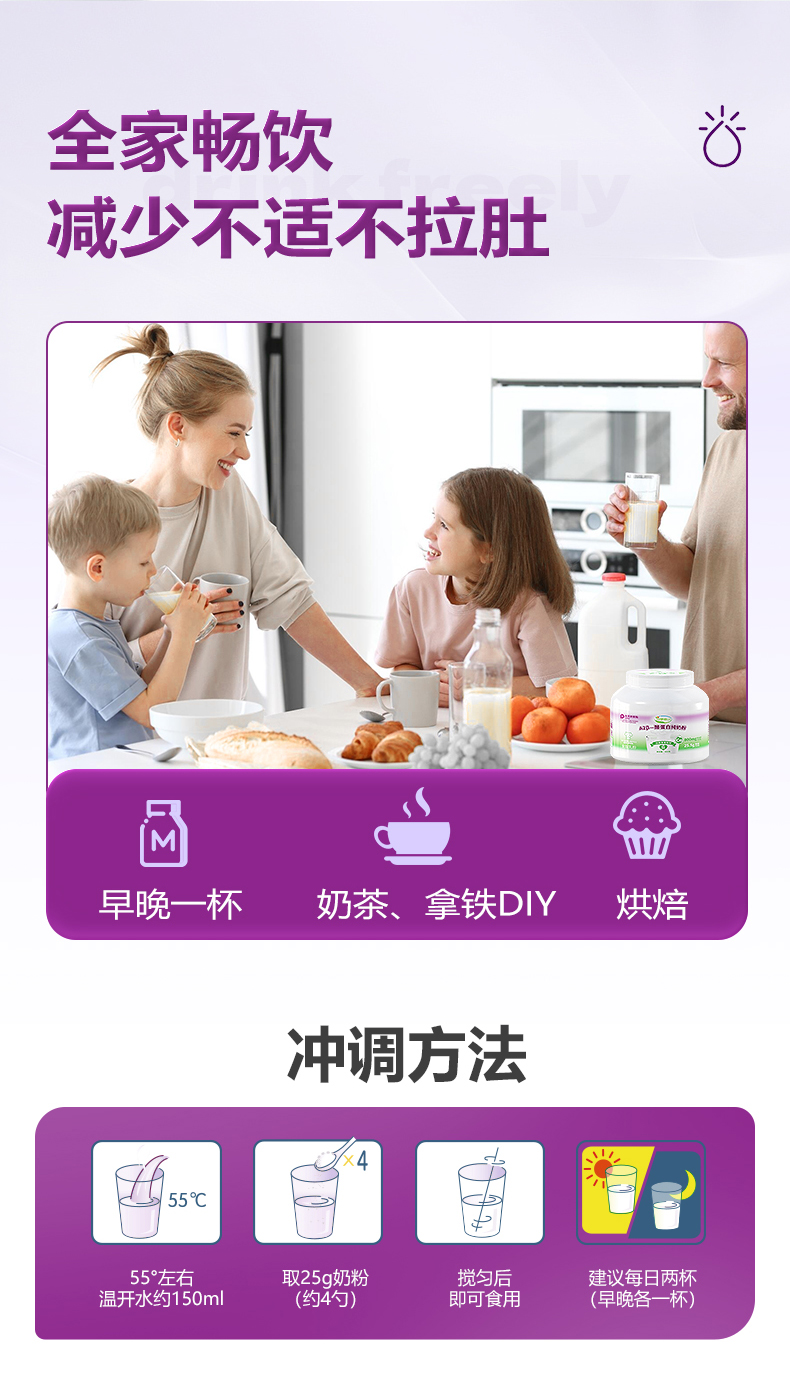 A2-β酪蛋白纯牛奶乳粉:建议每天两杯,150ml温水加入25g奶粉冲泡
