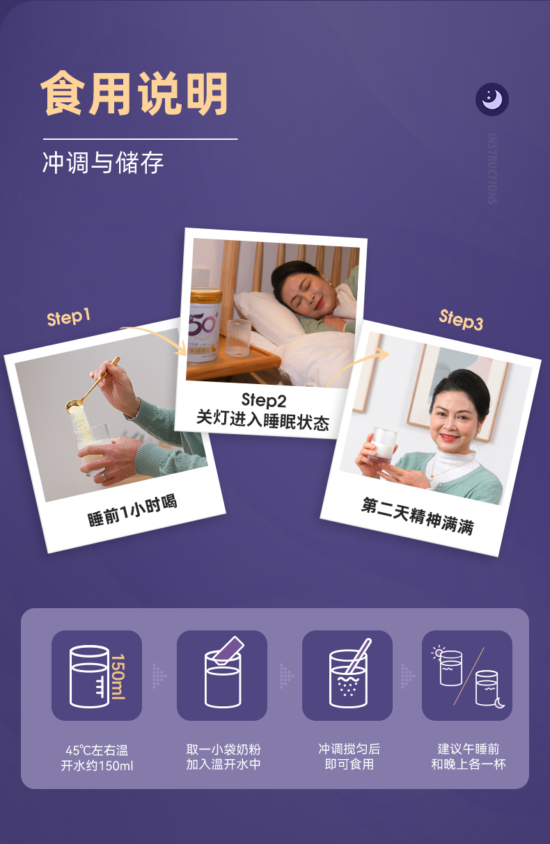 菁眠:建议每天两杯,150ml温水加入1条奶粉冲泡