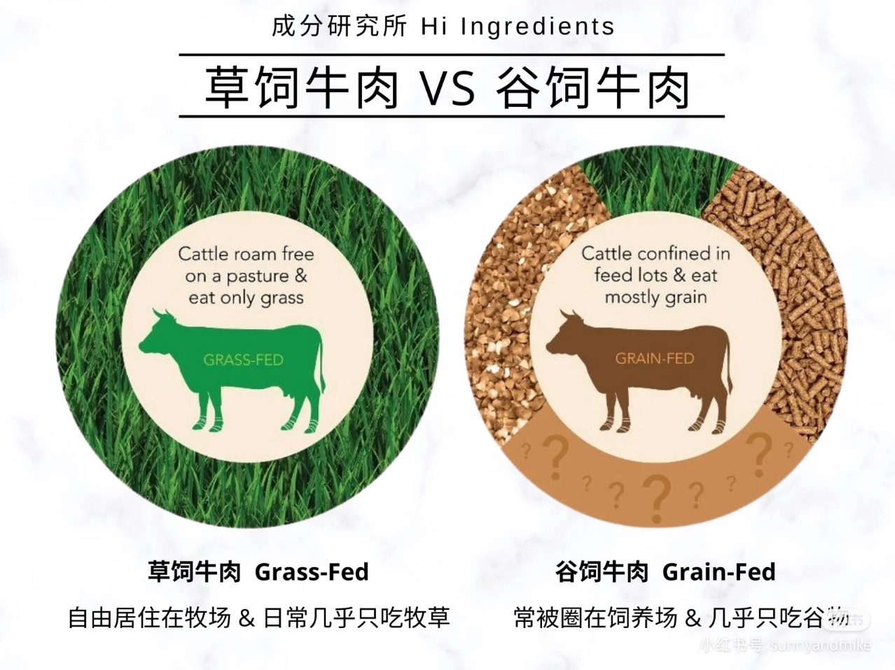 因为牛平常吃什么会极大程度地影响其牛肉的营养成分,虽然谷物和草饲牛肉都是极好的营养产品,但草饲牛肉比谷饲牛肉会含有更多的 Omega -3脂肪酸,维生素B6,类胡萝ト素(所以草饲牛肉上的脂肪会偏黄色),共轭亚油酸 CLA 等营养素。