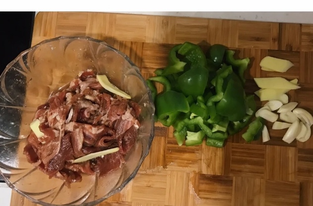 1.热锅下油,放入牛上脑片煎出焦褐感;