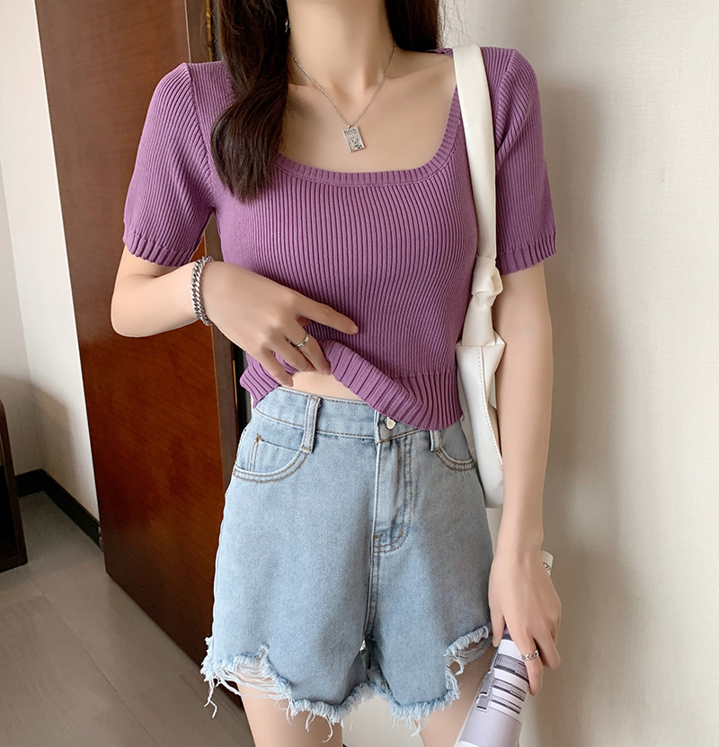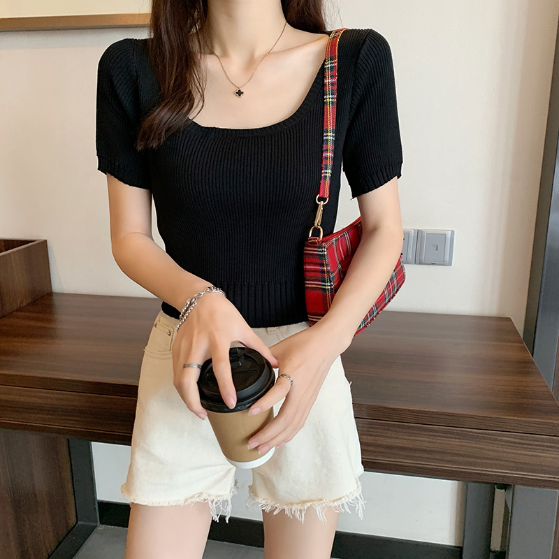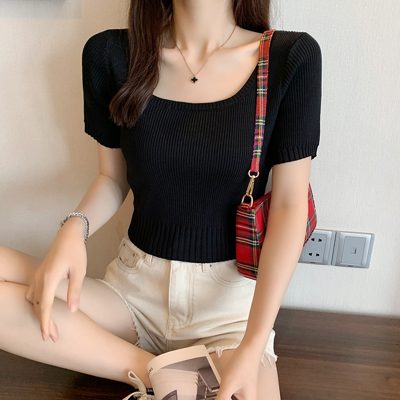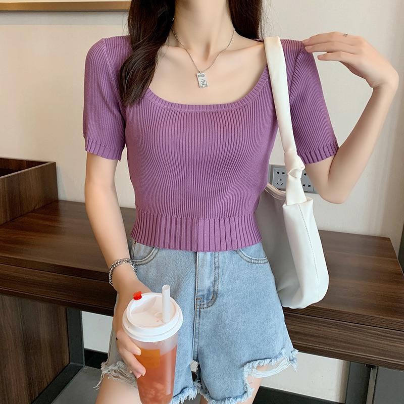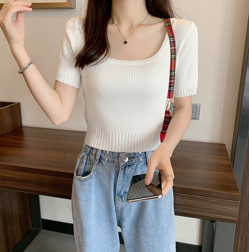 SSEMMY【洋气显瘦,1件穿3季!】超显质感冰丝针织衫,只需1秒,穿出女人味!修身百搭上衣短袖T恤,春夏季超显气质纯色打底衫,ins爆款超热卖