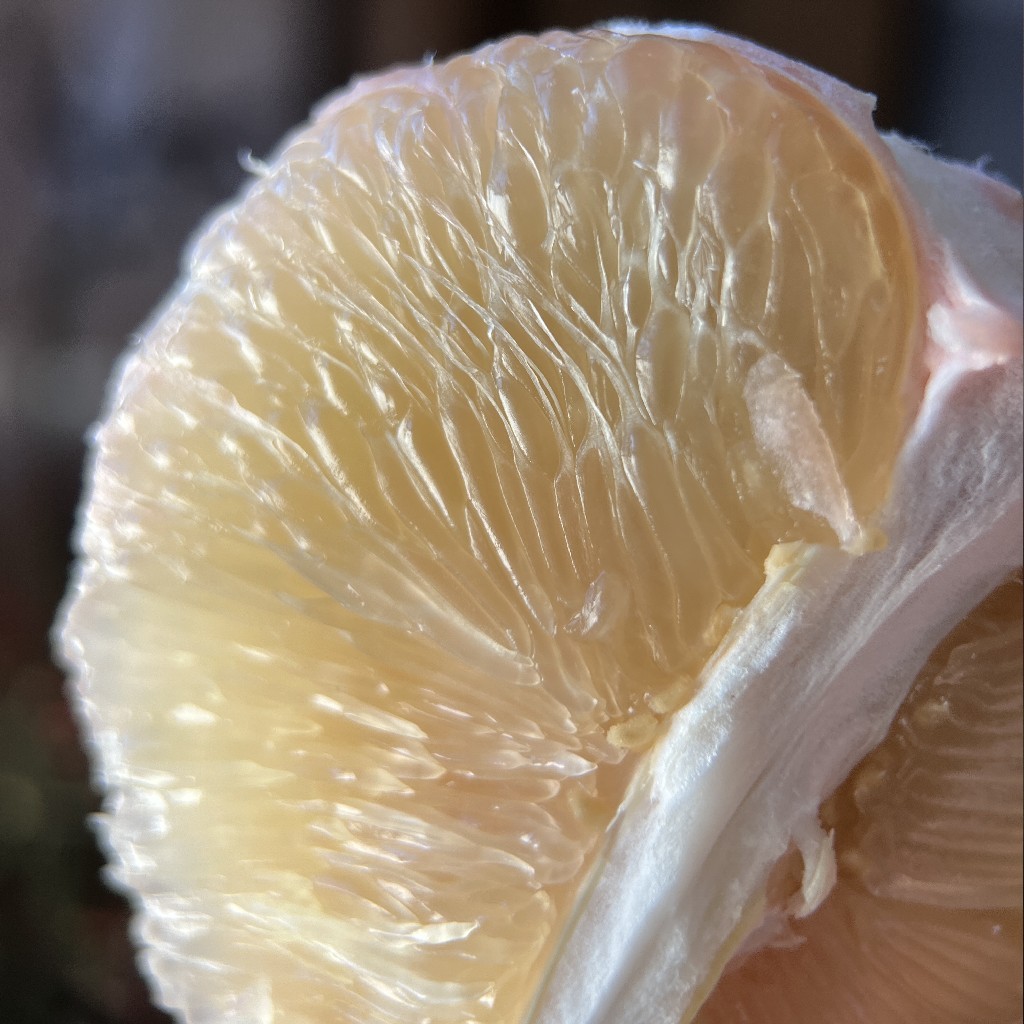 文旦柚的放置一段时间后表皮变黄,样丑干瘪,外表如皱皮老太,但是果肉的甜度仍在持续升高。剥开波波的果皮之下,仍然似婷婷少女,经络清晰,果肉丝丝分明,晶莹细腻,香甜回甘。