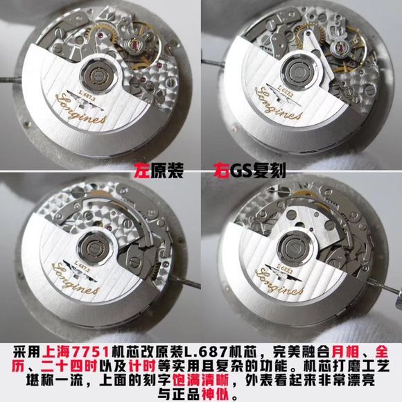 GS再攀复刻高峰【计时探月 精妙万千】GS精心打造浪琴名匠月相2018最新款L2.773.4.78.6腕表——万千精妙,汇于一盘,布局精巧,观感绝佳!【表壳】腕表尺寸40mmX14.5mm 表壳由品质出众的316L精钢精磨细造,光泽明亮,呈现原装柔和优美的线条。直立式表耳与表壳一体成型,佩戴贴手,极为舒适【机芯】采用上海7751机芯改原装L.687型机芯,所有功能同步原版。【精彩细节】1.机芯功能与原装吻合——完美融合月相、全历、二十四小时以及计时等多种实用功能 2.八只高温淬火锻造而成的蓝钢指针,深邃有致,熠熠生辉。3.市场独家——自动陀与原装同步,升级2018年浪琴官方最新版本GS匠心之作,有请各路表友倾心来品!
