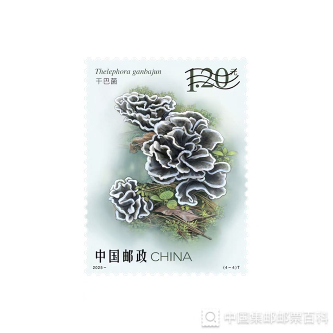 第四枚“干巴菌”,又称“干巴革菌”,隶属革菌科,为中国特有种。其丛生状如珊瑚,枝杈交错,色泽介于灰白与灰黑之间。邮票以精细入微的线条勾勒干巴菌丛生分枝的复杂结构,辅以简洁柔和的背景突出主体,再现了其鲜活之态。