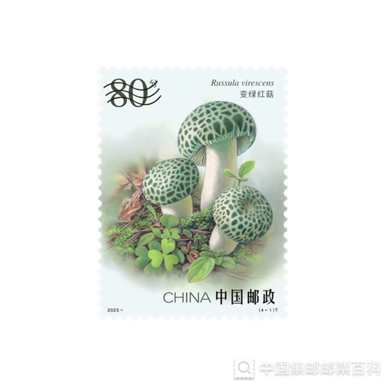 第一枚“变绿红菇”,俗称“青头菌”,隶属红菇科。菌盖较硬,呈青绿色,表面有青褐色的鳞片。其分布广泛,鲜美的口感深受人们喜爱。邮票设计突出其青翠欲滴的色泽,并融入森林生态背景,使整体形象兼具自然野趣与美学韵味。