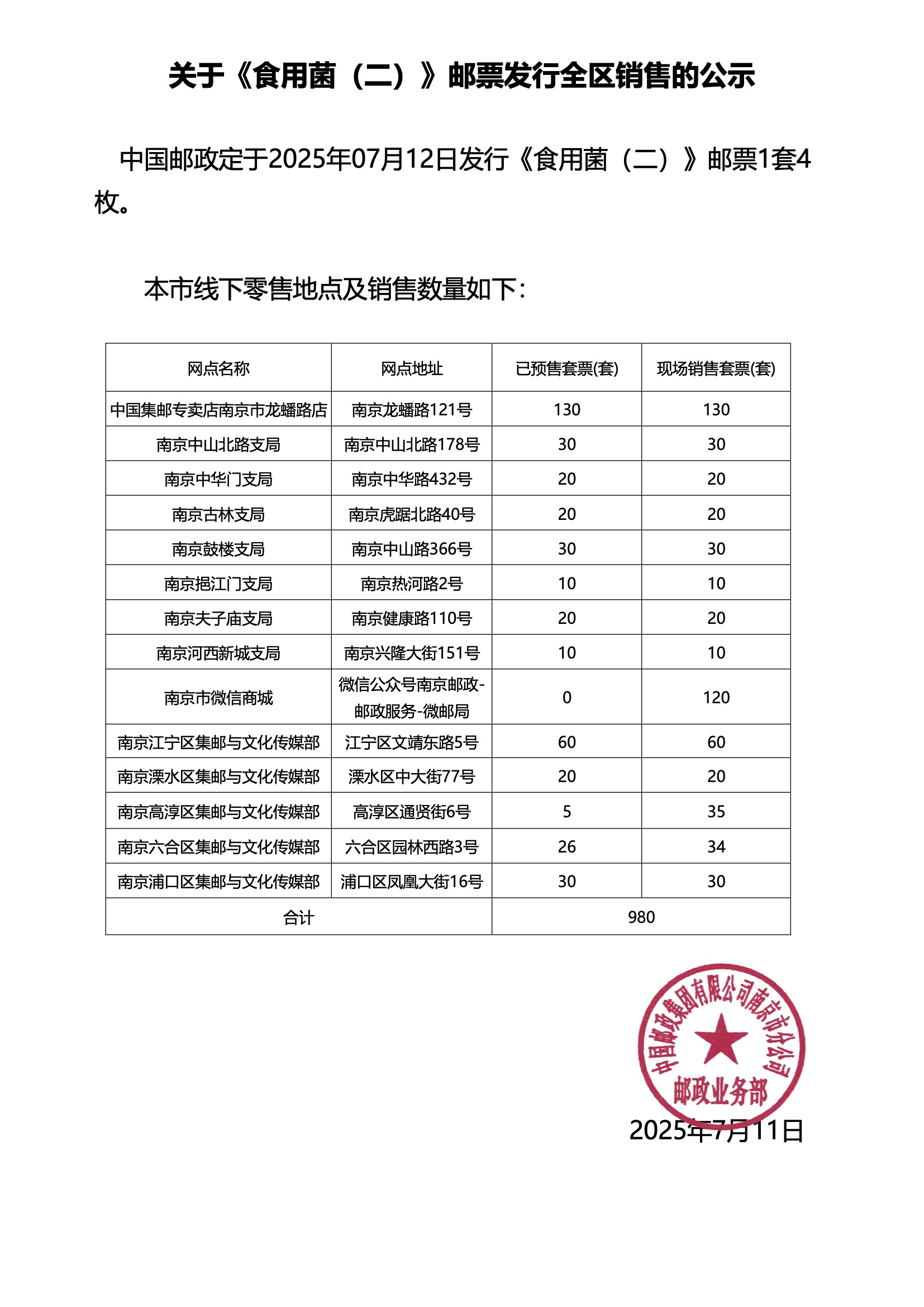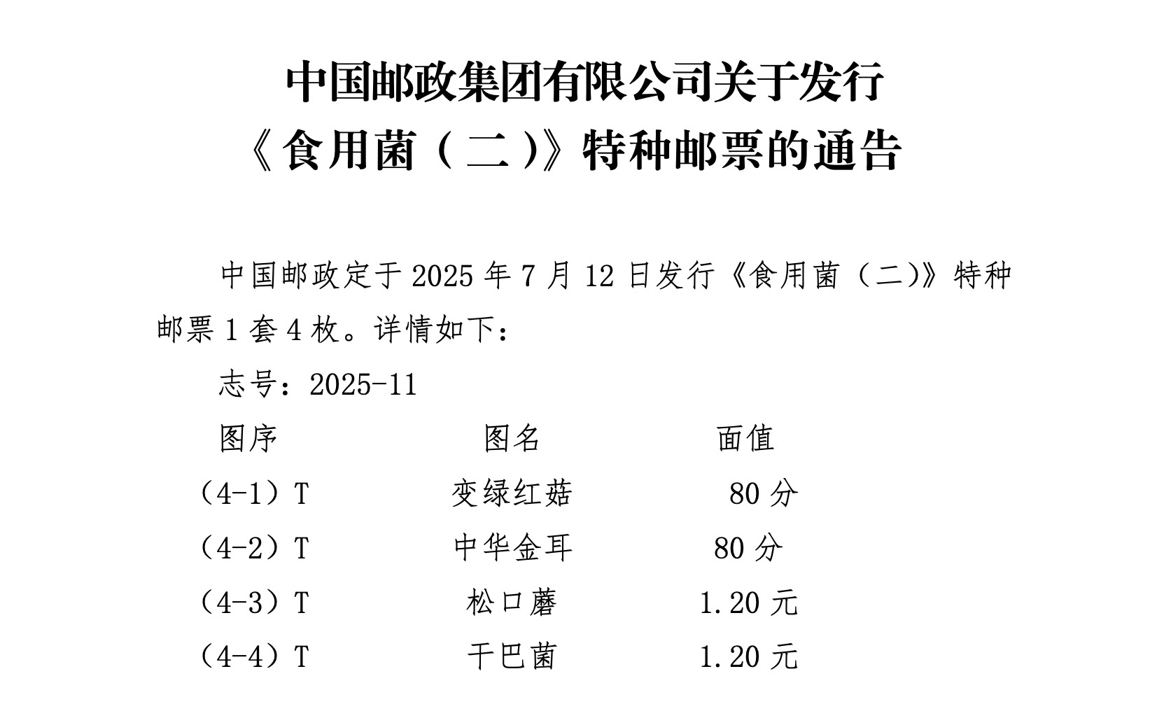 中国邮政拟定于2025年7月12日发行《食用菌(二)》特种邮票1套4枚。