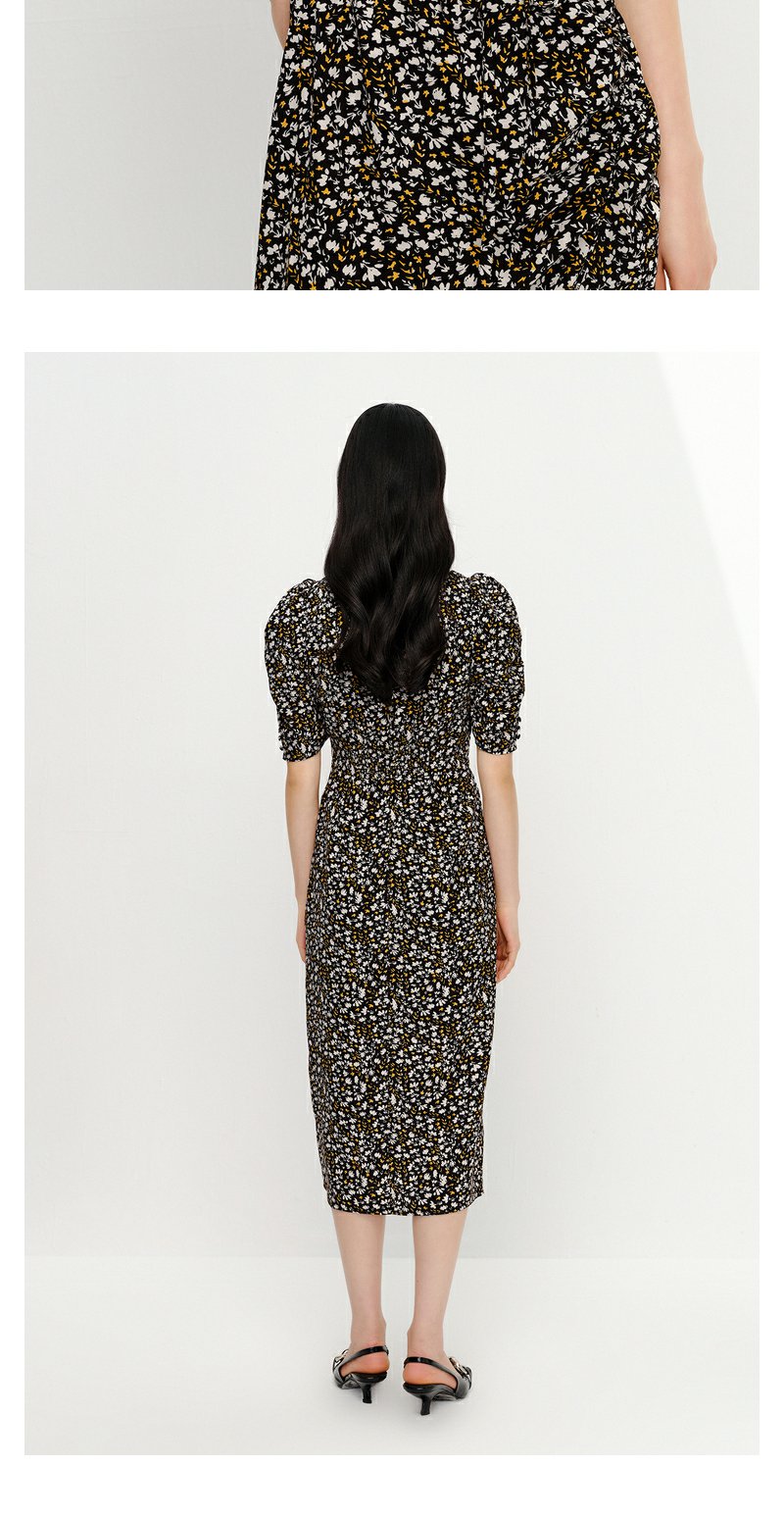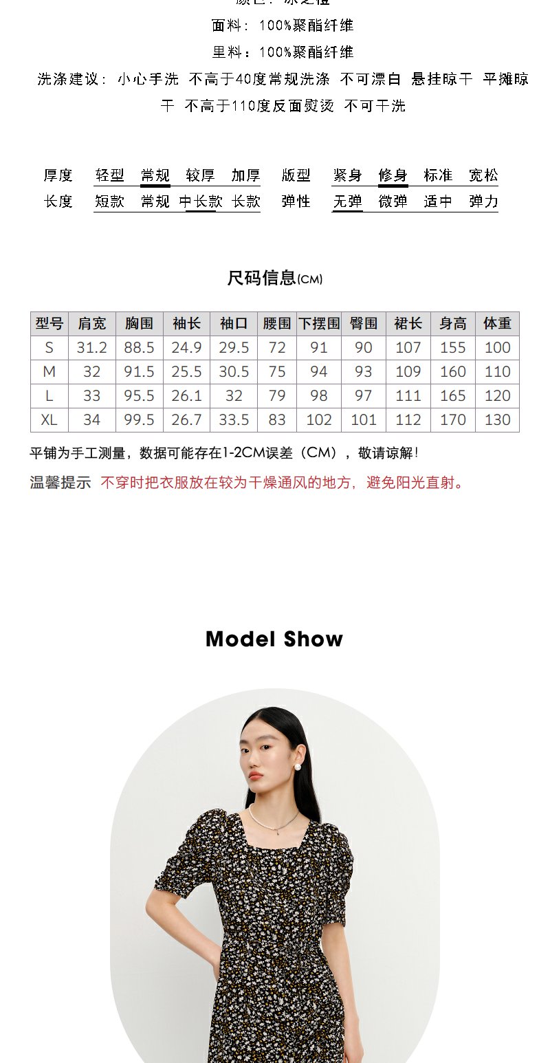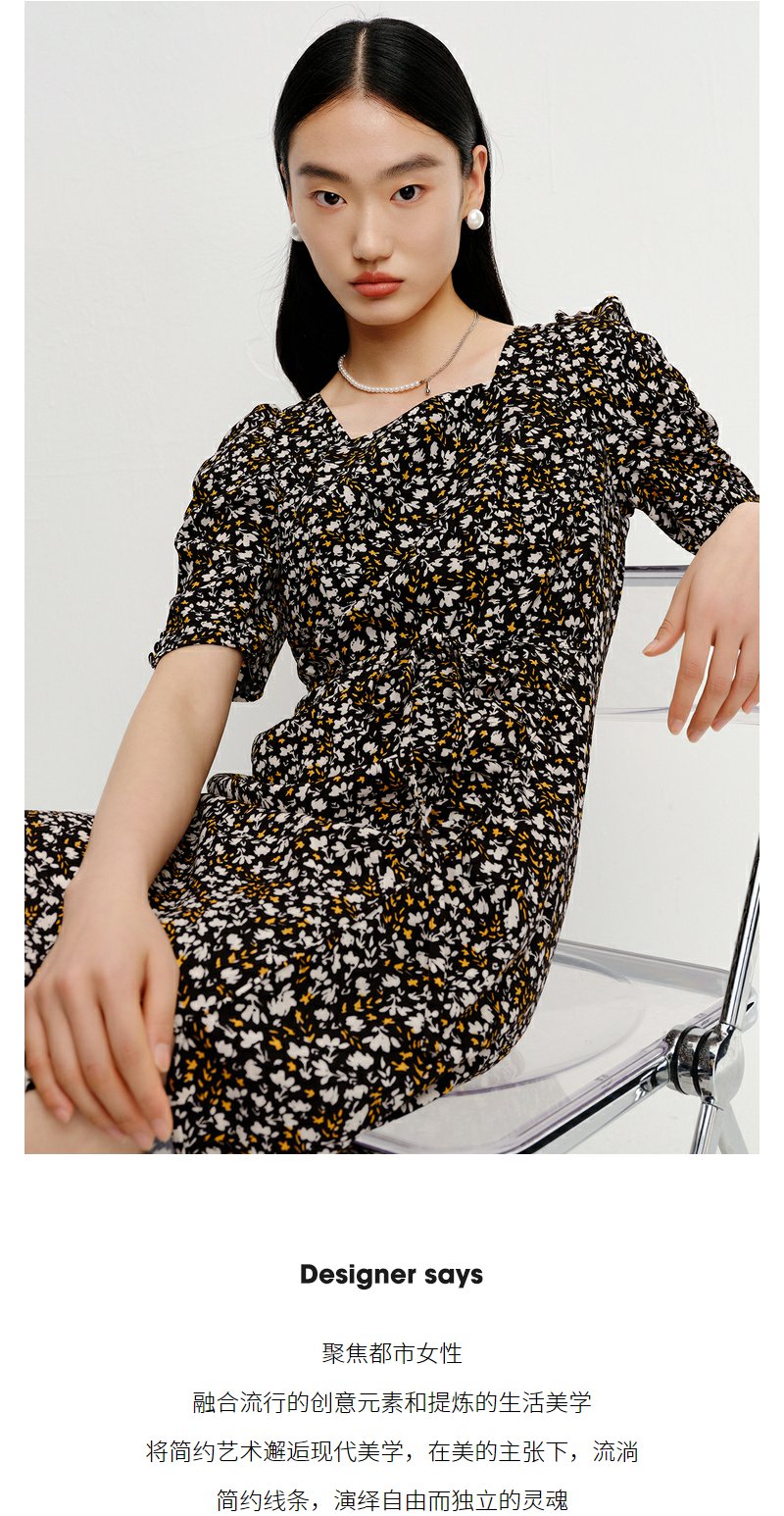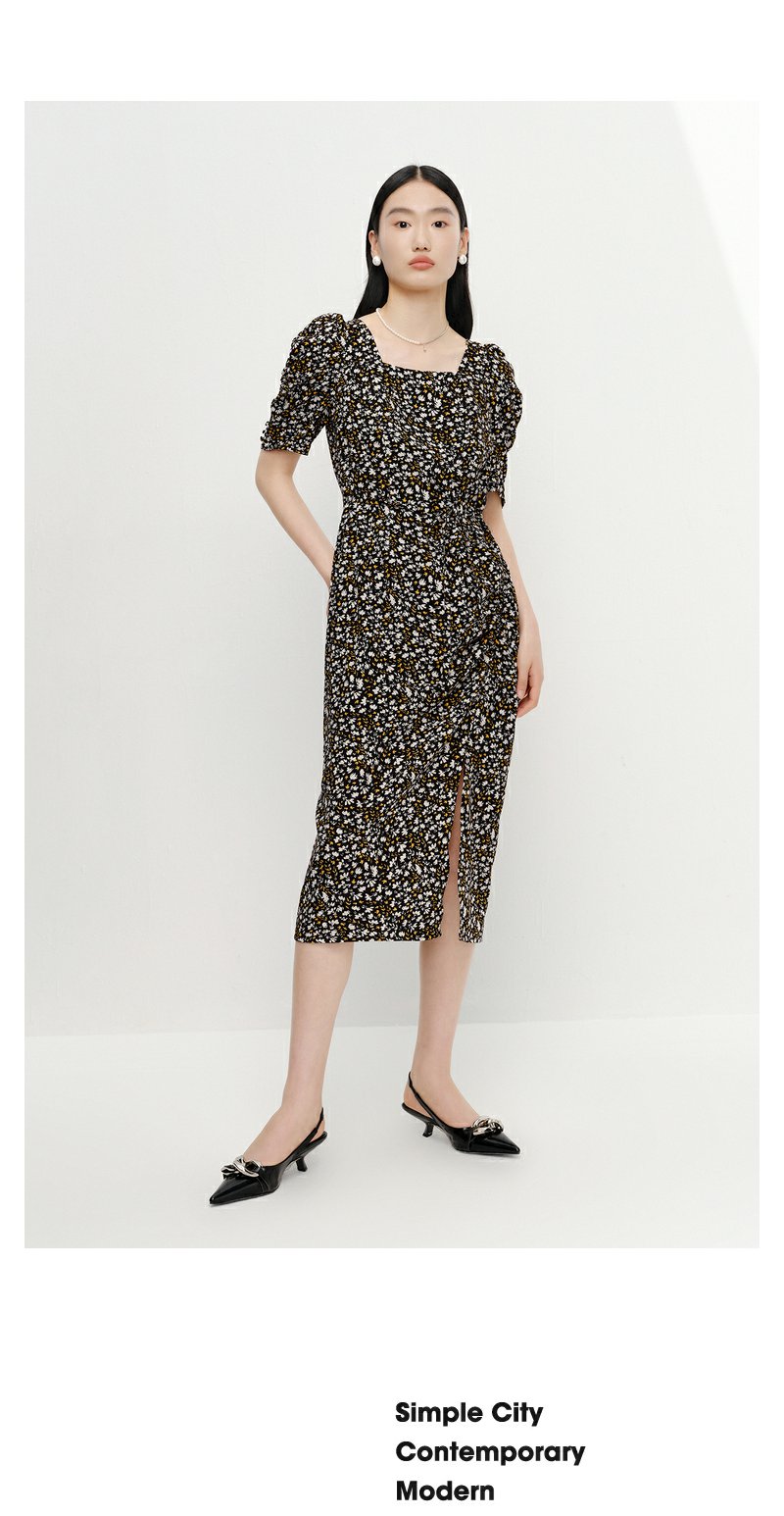 NEELLY纳俪商场同款夏季碎花连衣裙女方领显瘦收腰A字裙下开叉裙N23042Y01