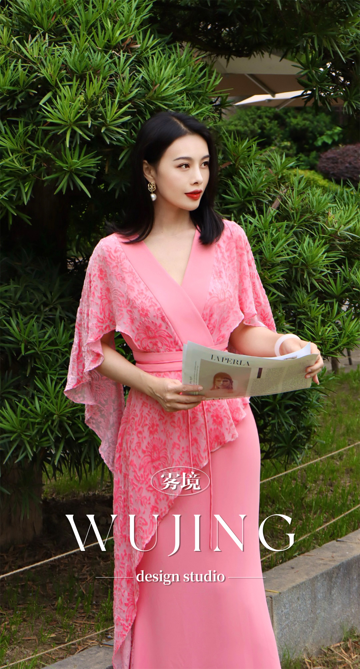 3205059 樱樱桃夭 重磅印花植绒料/进口纹理蜂窝缎连衣裙 雾境