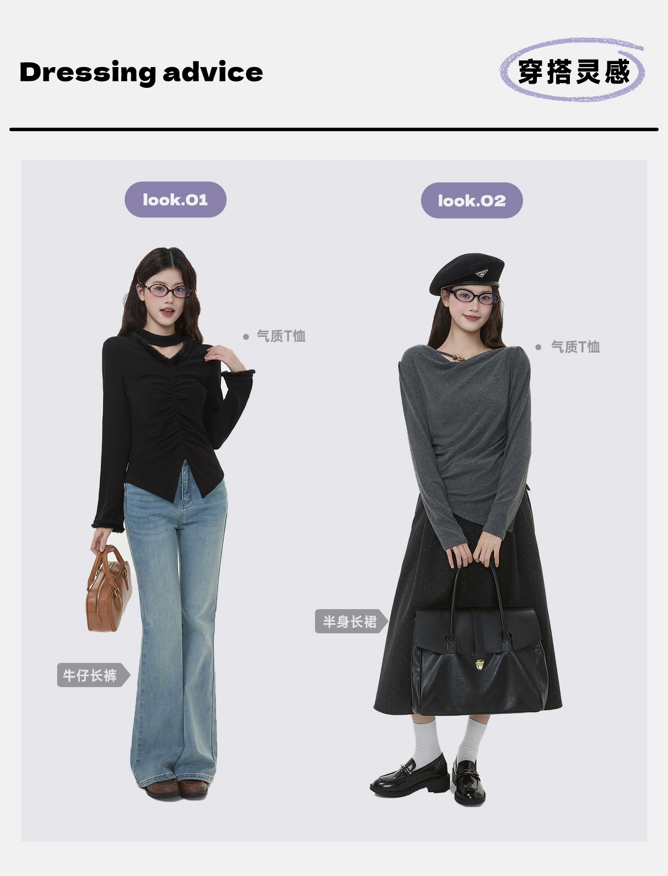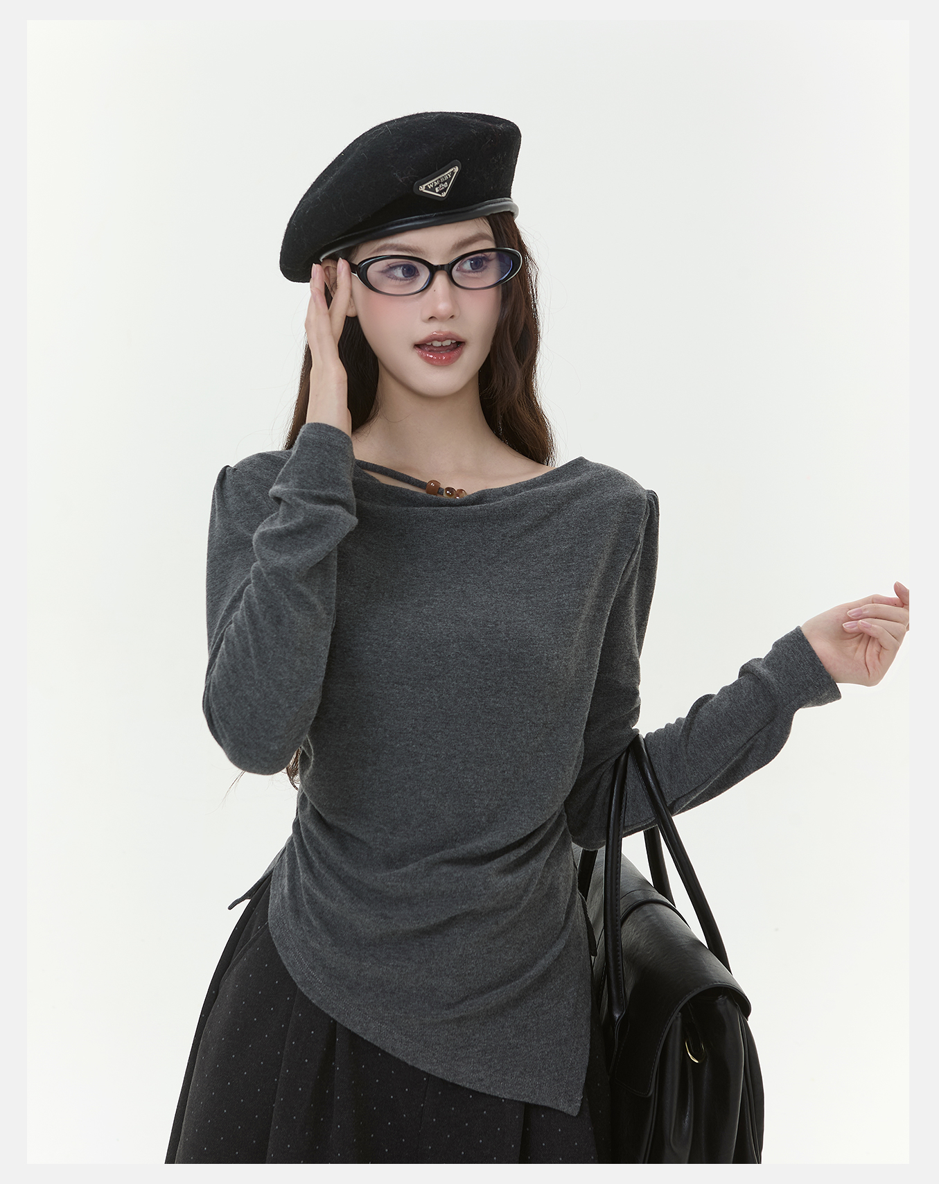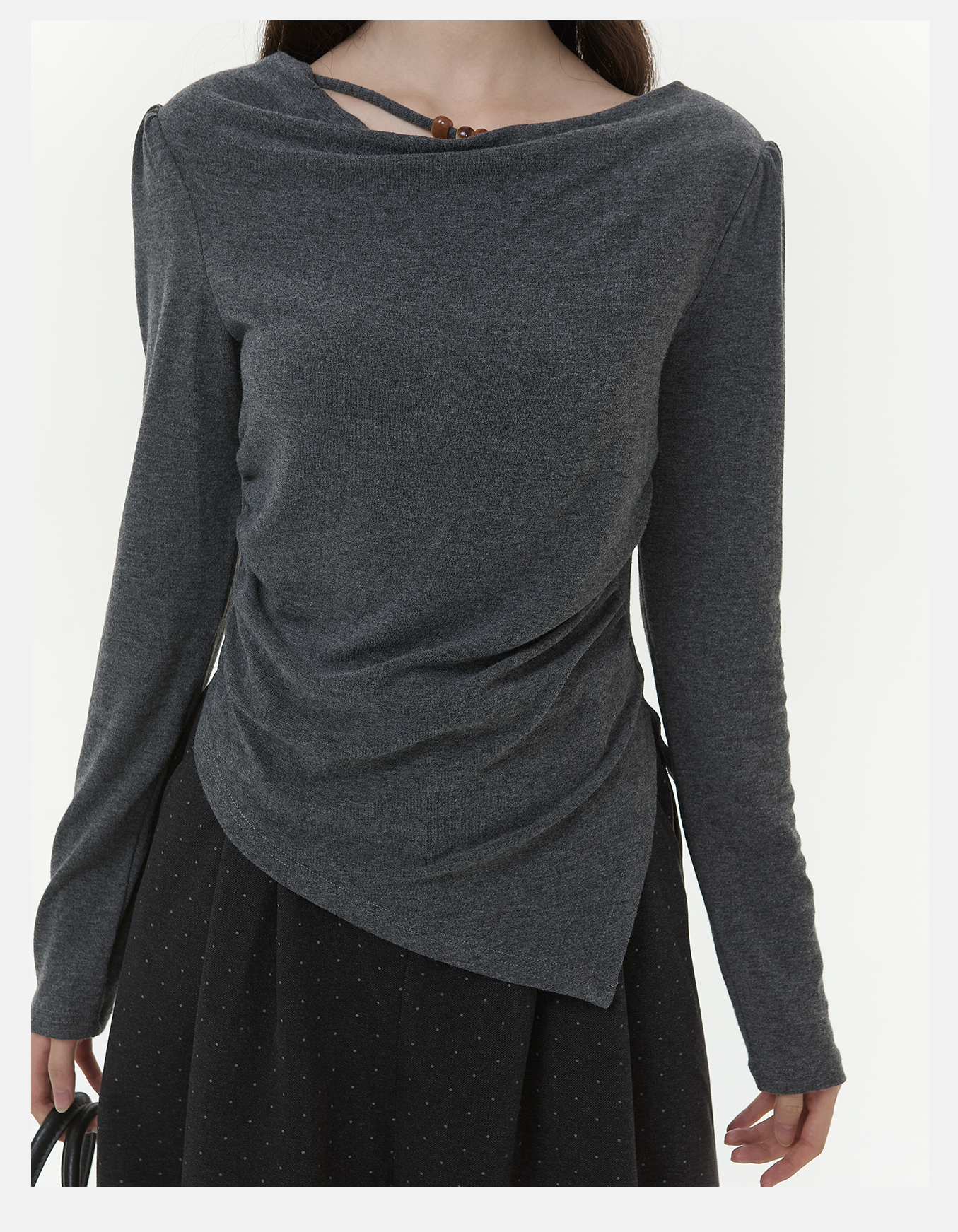P&X设计师女装2025冬季褶皱修身长袖荡领短款T恤825402095 灰色