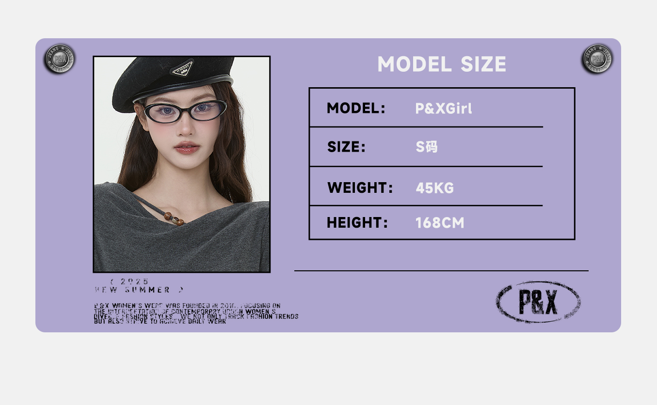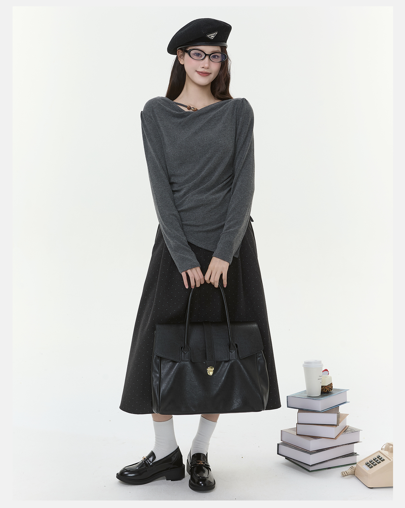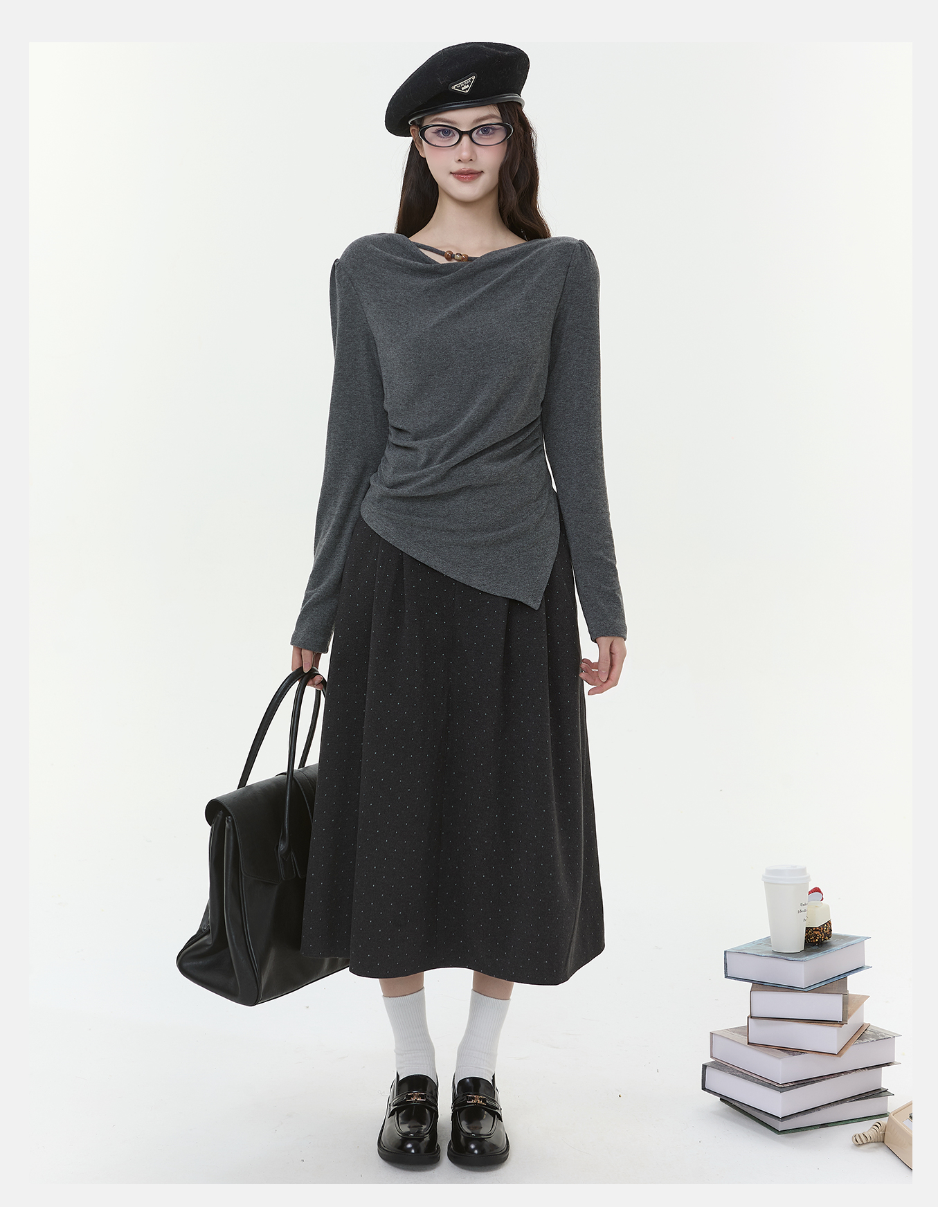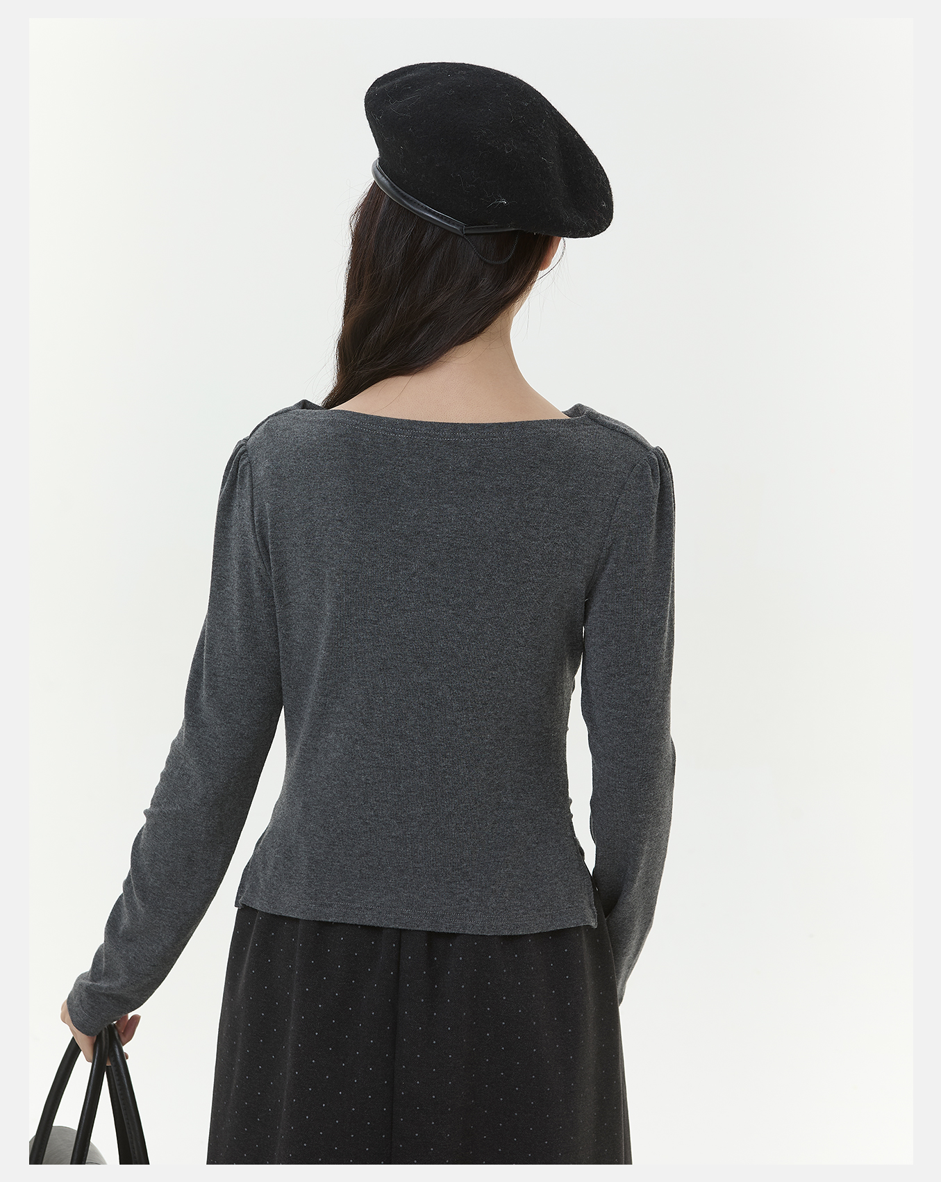 P&X设计师女装2025冬季褶皱修身长袖荡领短款T恤825402095 灰色