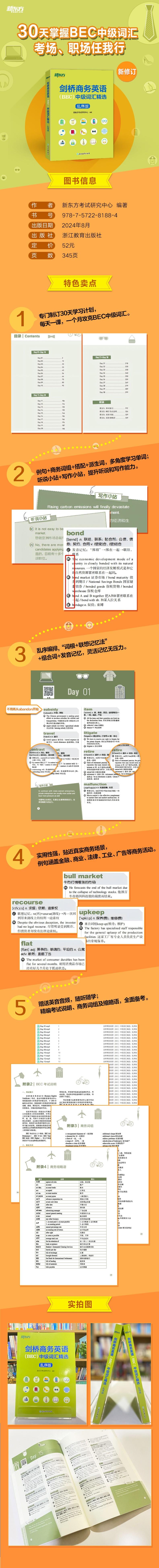 选词严谨,释义精准:精心挑选BEC真题高频词汇,给出商务释义及常用释义 实例丰富,应用广泛:例句、词组、搭配、派生词,助力考生全面掌握单词 学以致用,全面备考:特别设置听说小站和写作小站,提升听说和写作能力 乱序编排,灵活记忆:摆脱记忆单词的枯燥感和挫败感,自由灵活地记忆单词 多管齐下,效果加倍:配套英音录音,赠送精编考试说明、商务词组及缩略语等备考资料