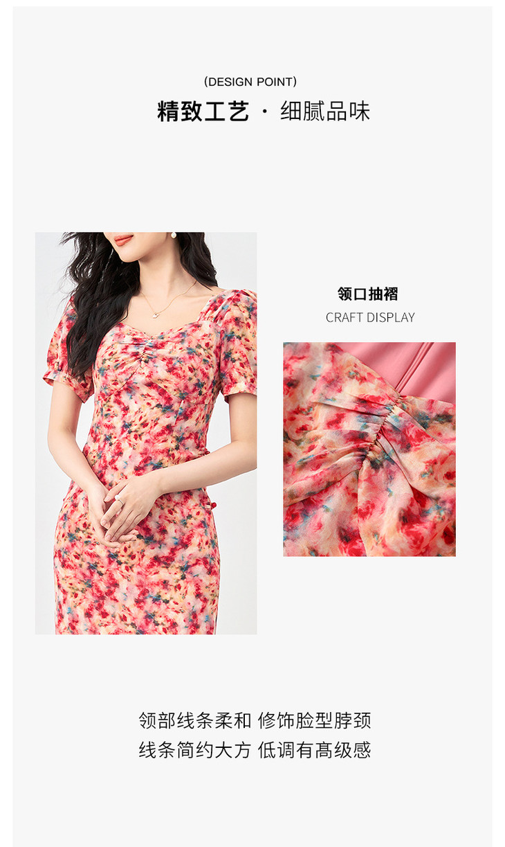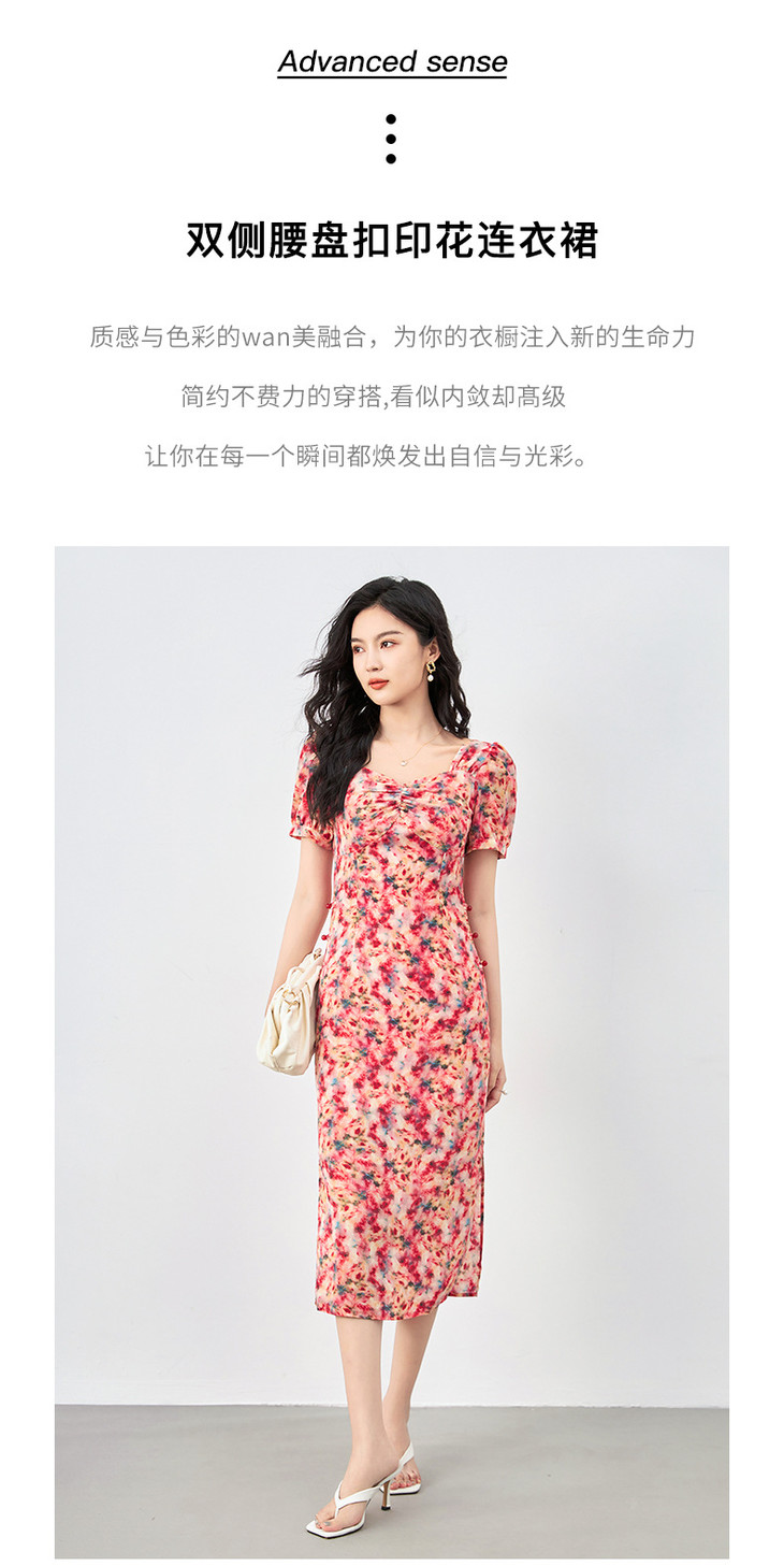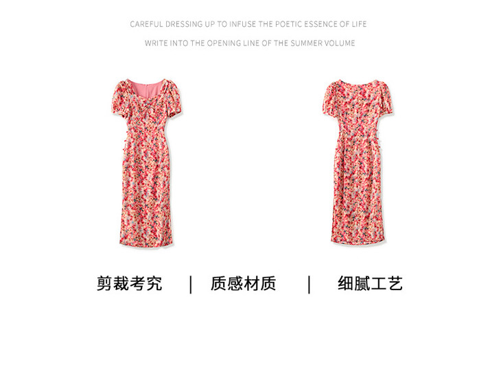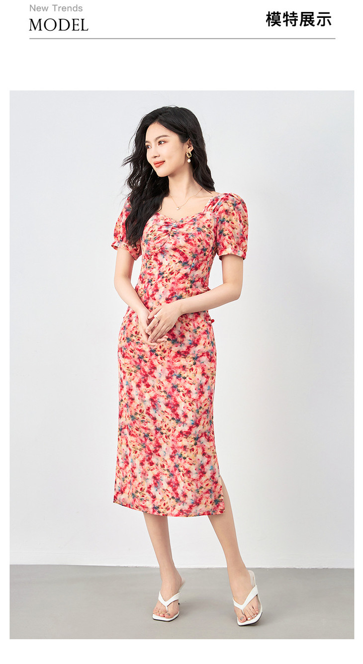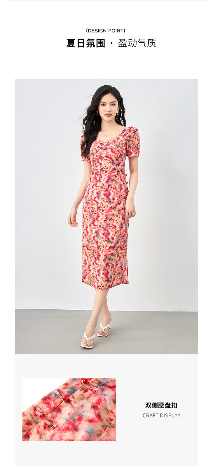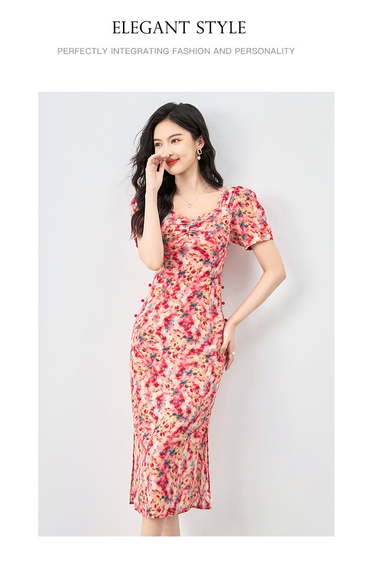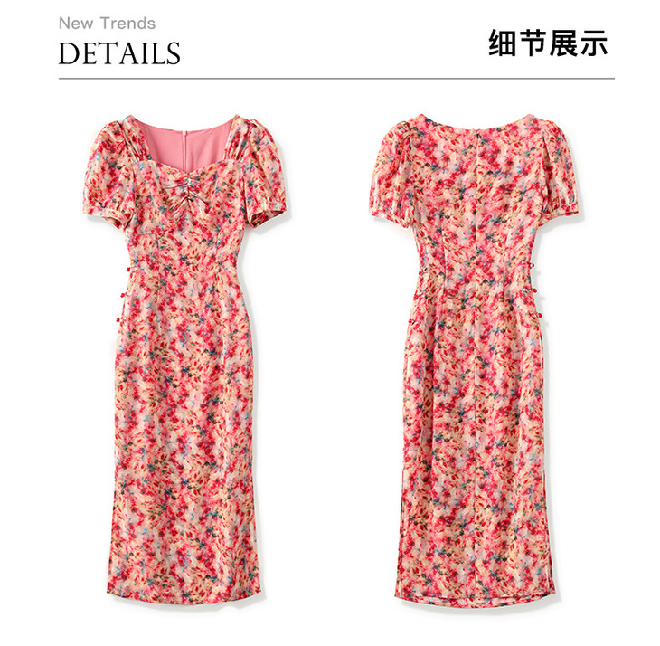 法式茶歇优雅气质印花连衣裙,侧边中式盘扣名媛碎花WLZD2419504