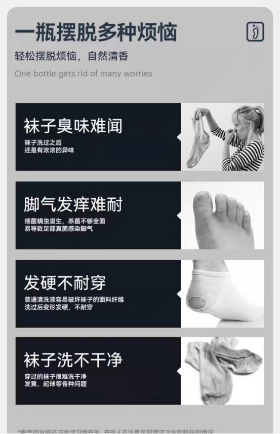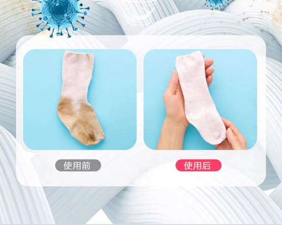 让每一双袜子都像「刚拆封」般清爽 “脱下鞋再也不用屏住呼吸——倒1泵分解汗臭分子,臭味变白茶香” “同事借穿拖鞋时不再脚趾抠地:抑菌率99%*,穿过的袜子24小时干爽无异味” 🌿 “给孩子的袜子:无荧光剂/磷,搓洗不伤手,妈妈安心之选” “职场人的体面:重要会议前,袜口白边亮得能反光”