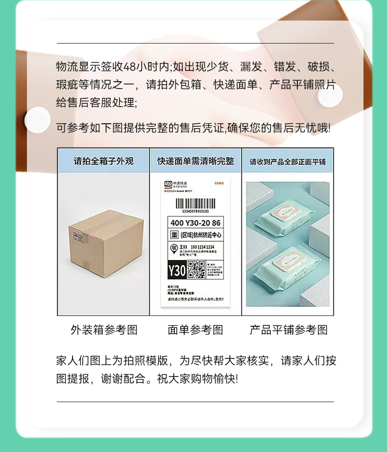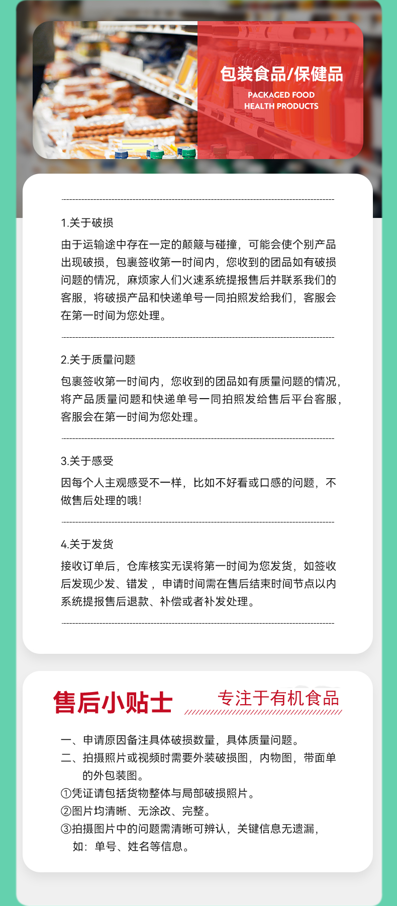 【关于售后】如有发霉、涨袋、漏气、发酸、有异物的不要食用、箱体破损少棒以上情况与快递面单一起拍照给按比例售后,如有其他情况或需求可及时反馈。(客户签收应检查外包装是否有破损,包装无破损的拒签不能售后,包装有破损要当面拍照拒签,并提供图片进行售后)。