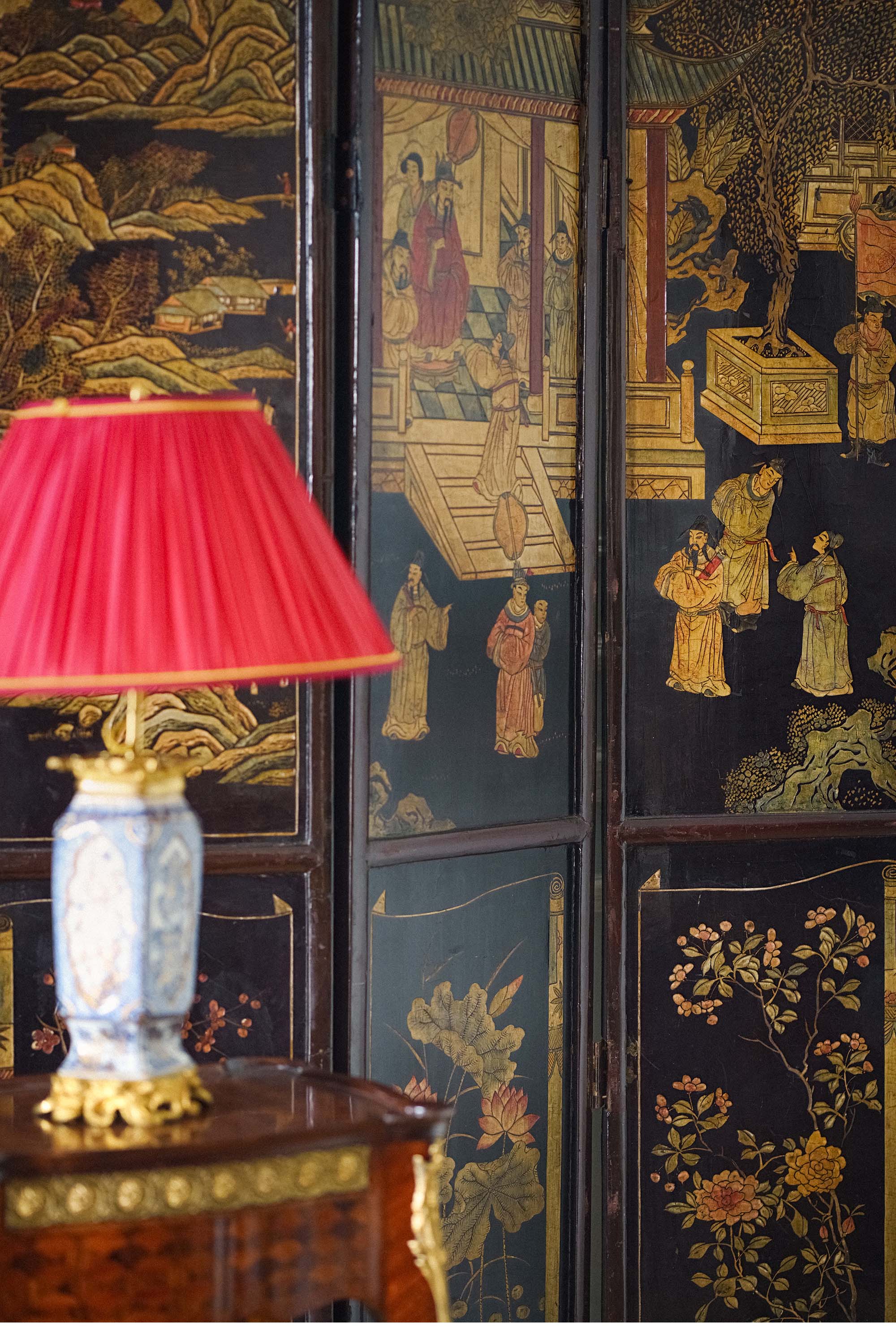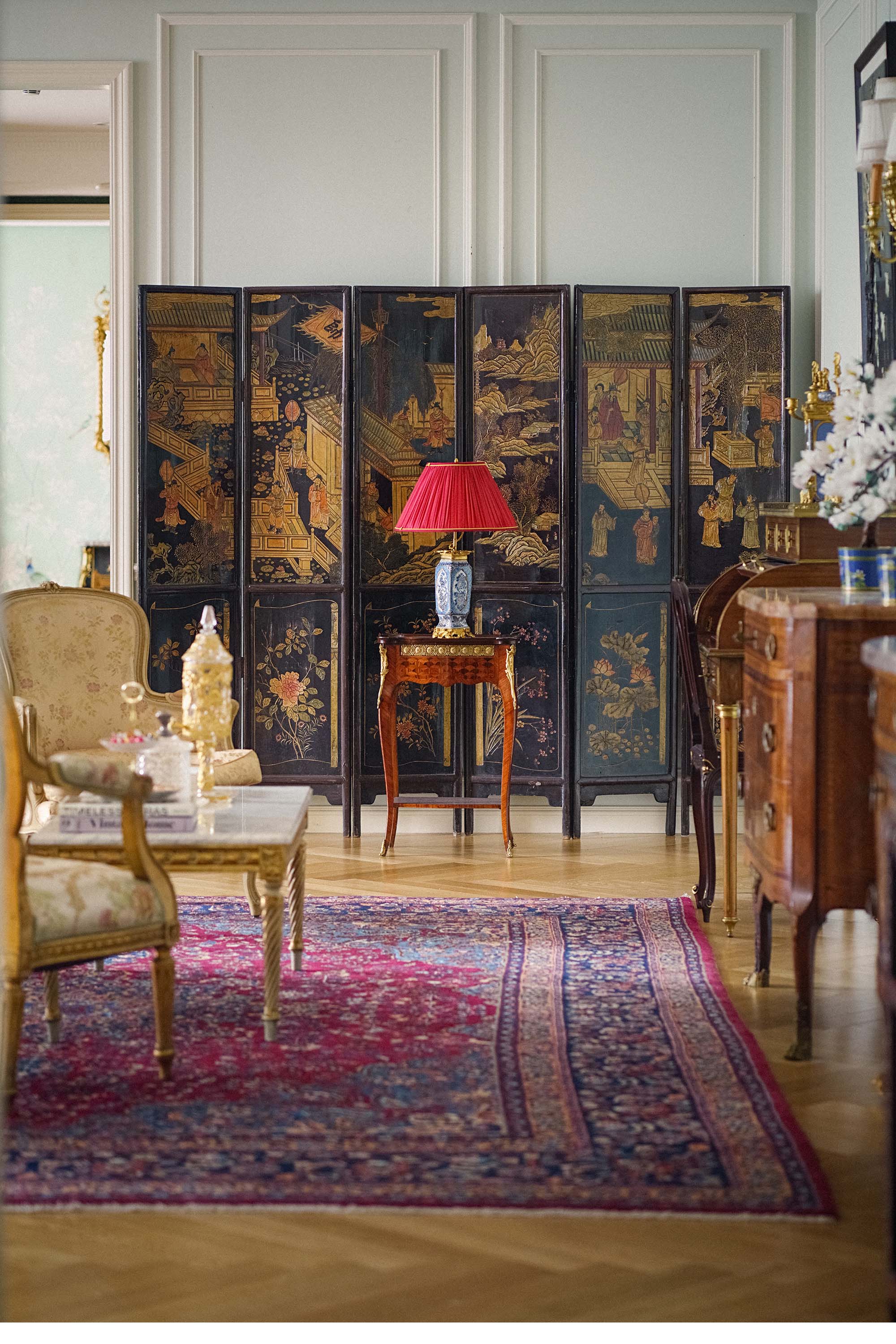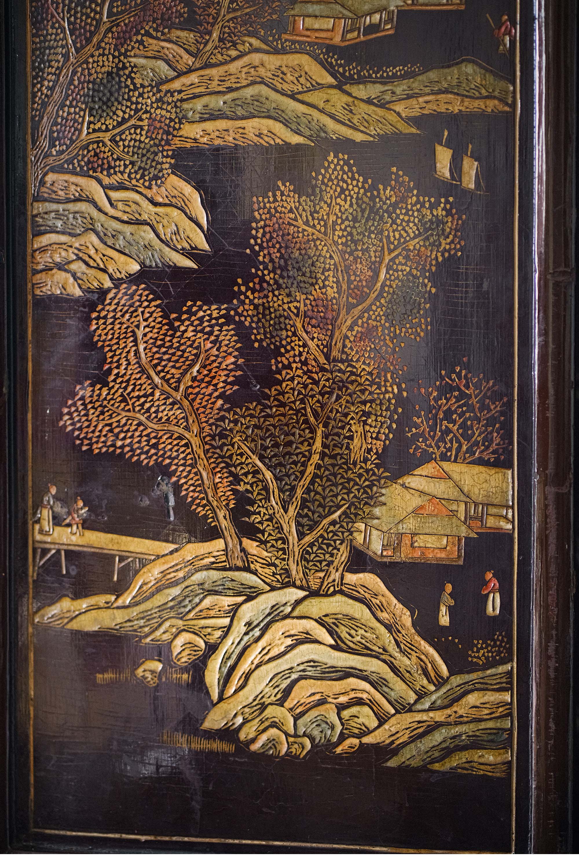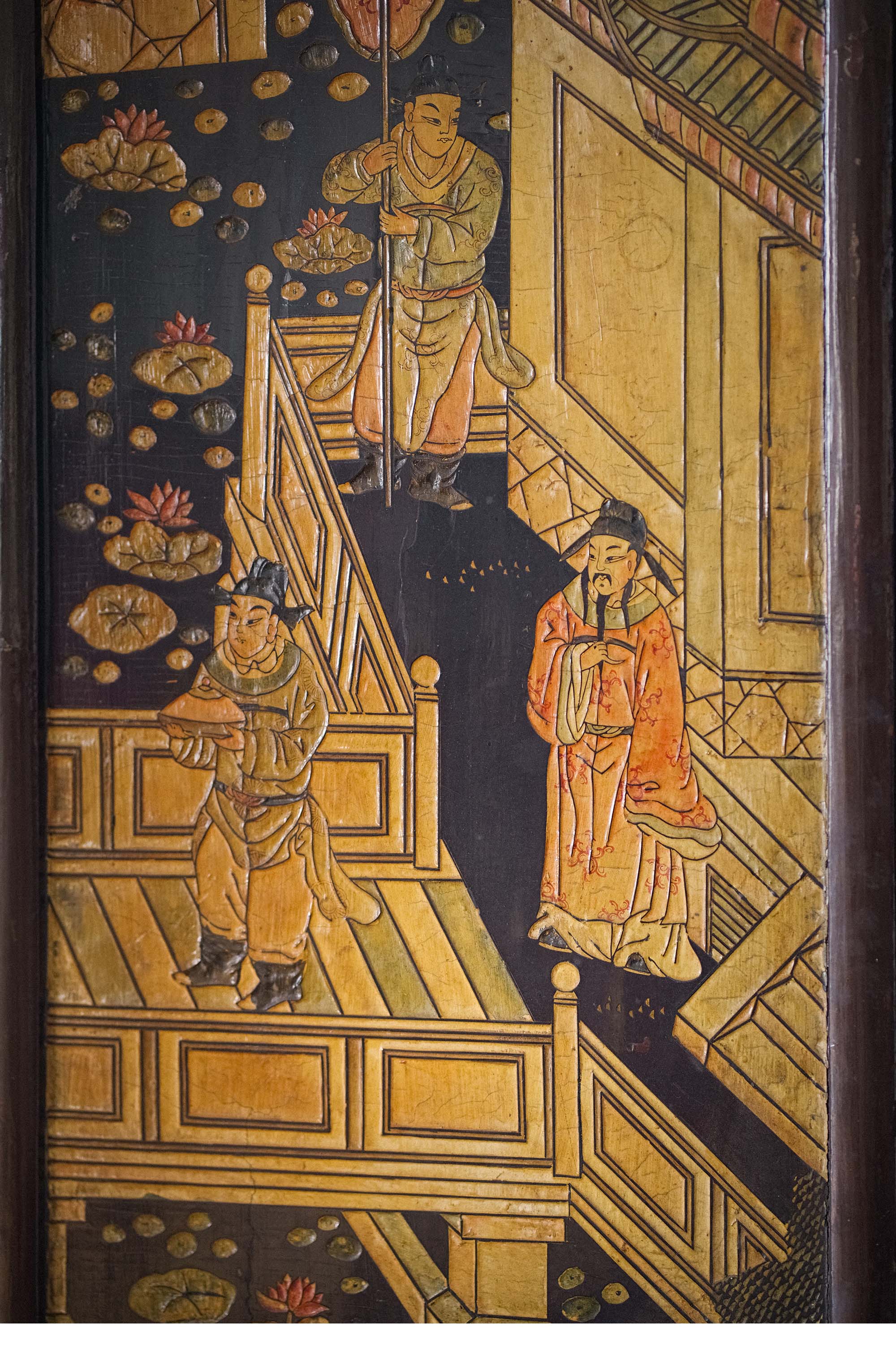 19世纪末中国出品「郭子仪祝寿图」主题黑漆地款彩双面六曲屏风