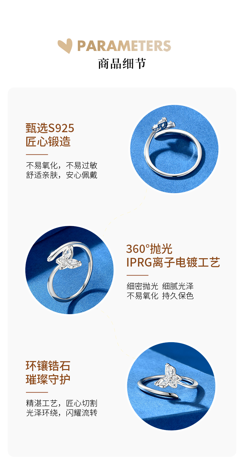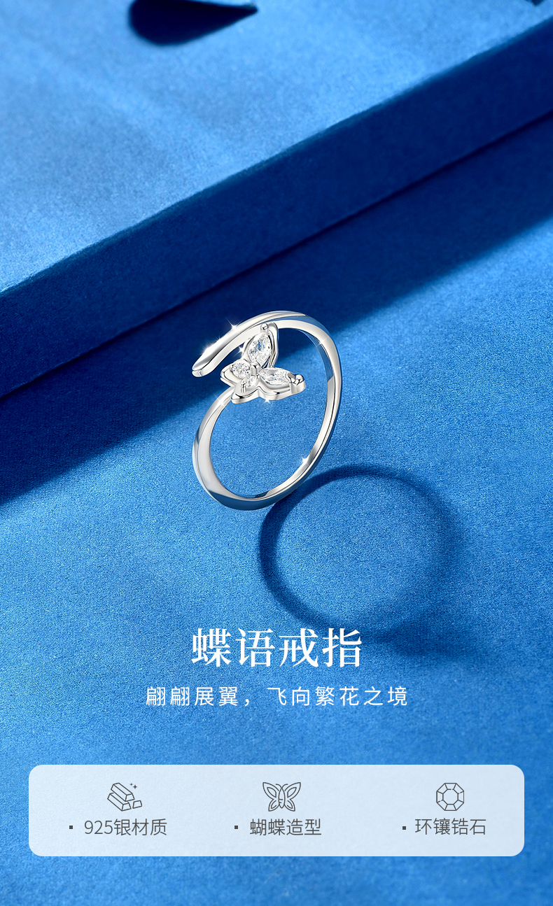 卡蒂罗/KADER 蝶语戒指 优雅蝴蝶造型大颗宝石闪钻吸睛可调节单戒一只 闪闪蝶舞温柔百搭女戒 925银