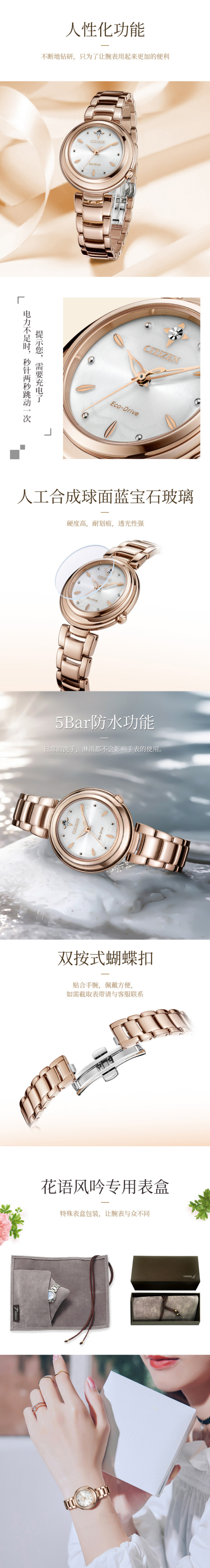 西铁城日本官方正品镶钻不锈钢镀樱花粉色光动能女表EM0583-84A