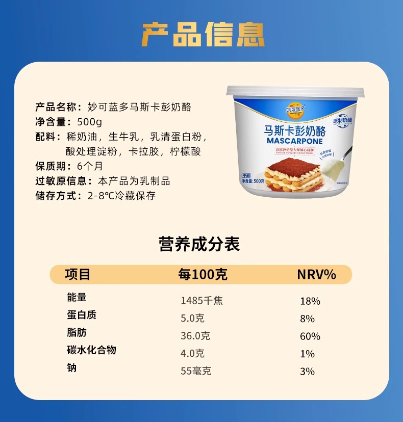500g 妙可蓝多 马斯卡彭奶酪 提拉米苏原料原制奶酪