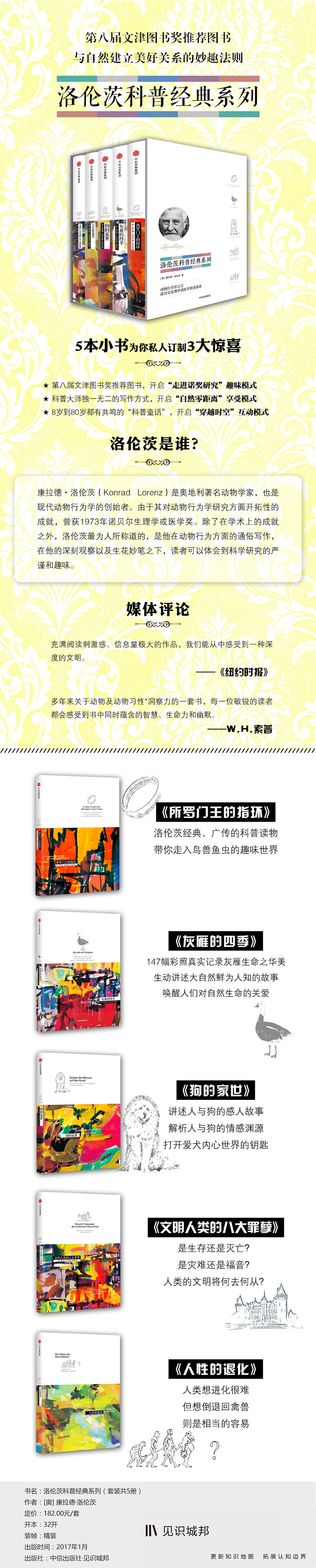 《洛伦茨科普经典系列》包含了《所罗门王的指环》《灰雁的四季》《狗的家世》《文明人类的八大罪孽》《人性的退化》5本,均为诺贝尔生物学或医学奖获得者康拉德?洛伦茨的经典科普著作,入选第八届文津奖推荐图书。分册简介如下: