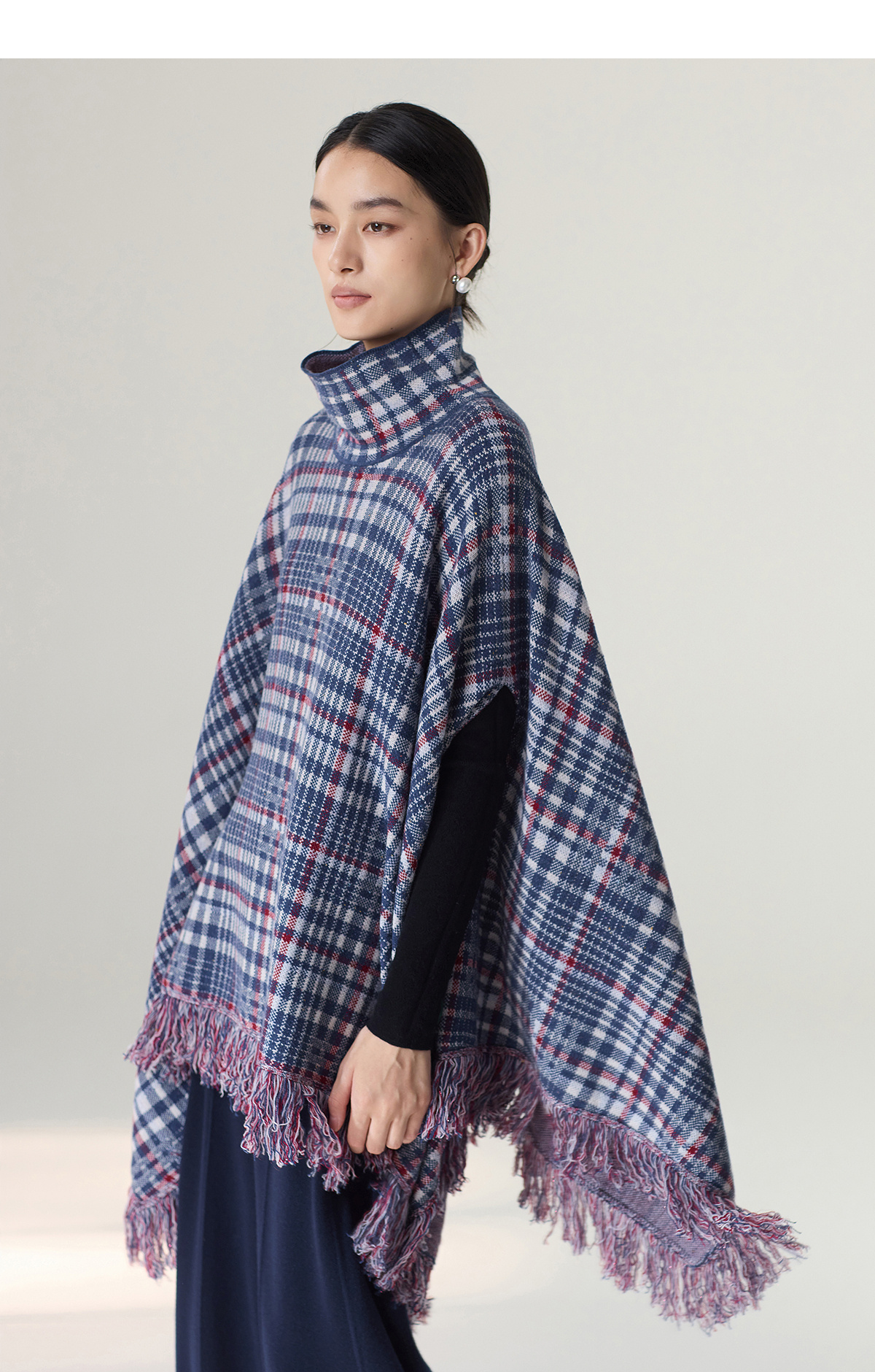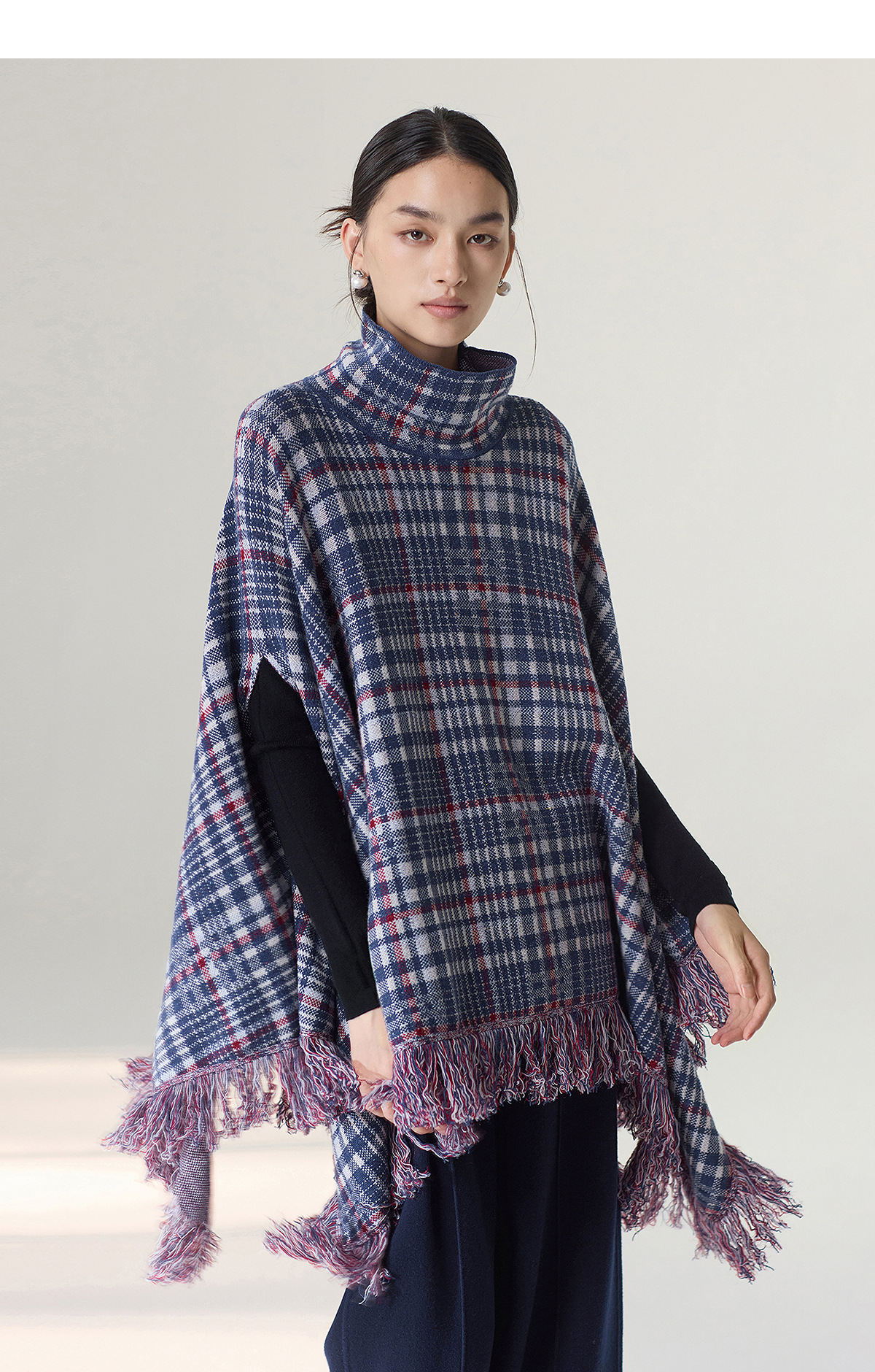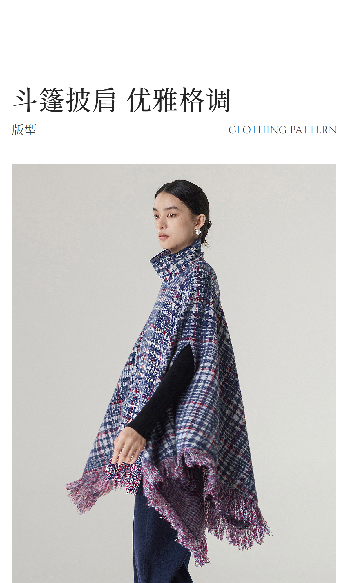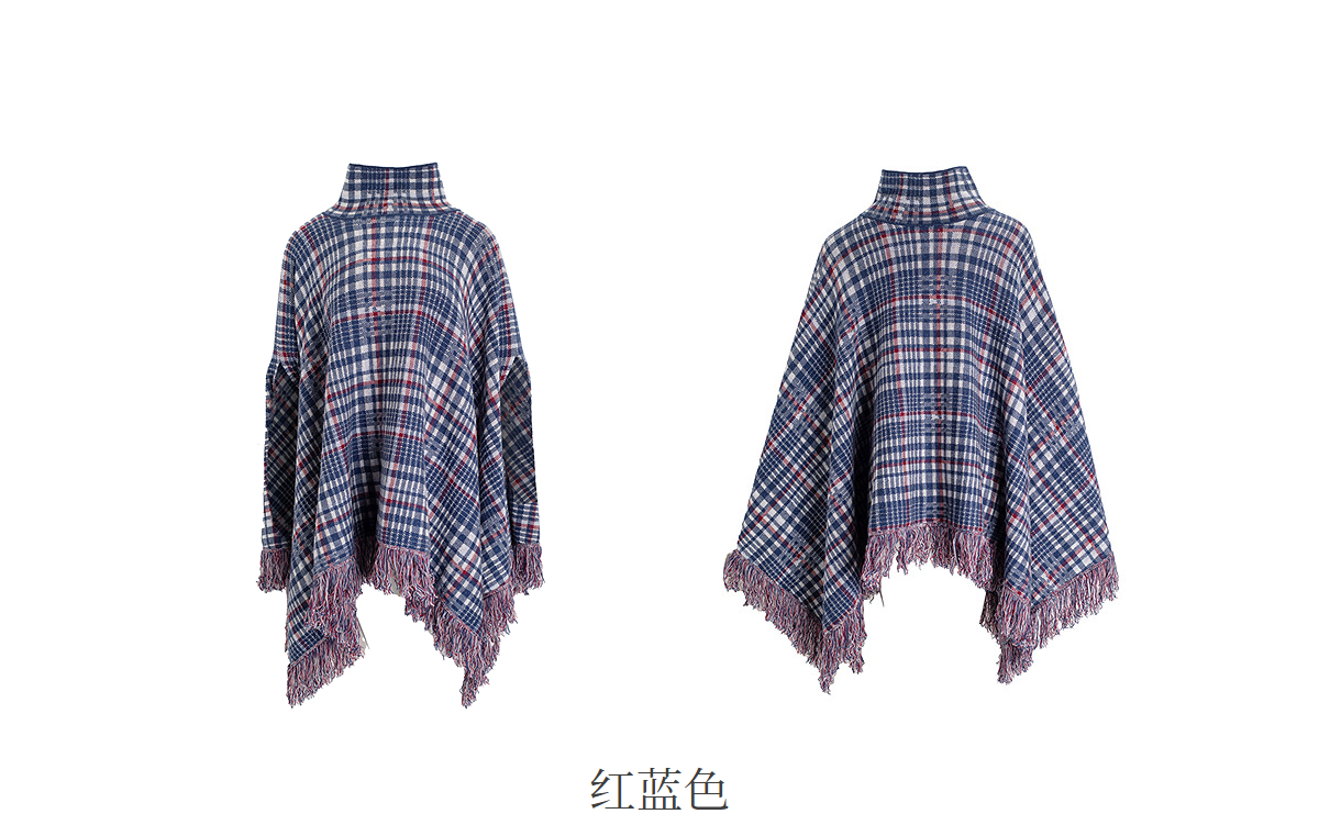 【林栖设计小店】格纹毛织披肩复古气质宽松高领2025秋冬新款流苏斗篷上衣2954006