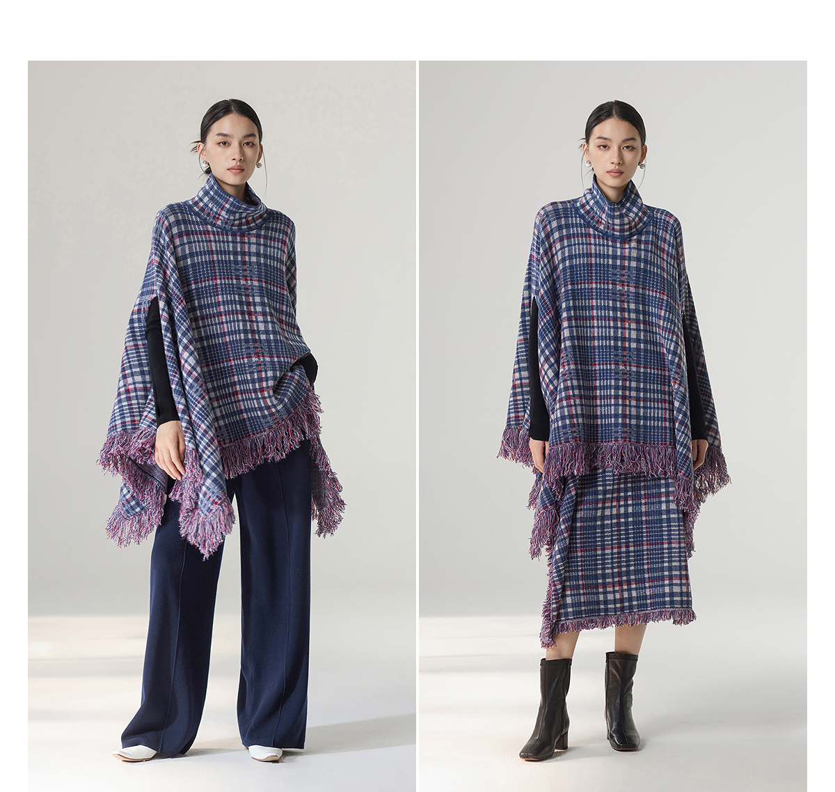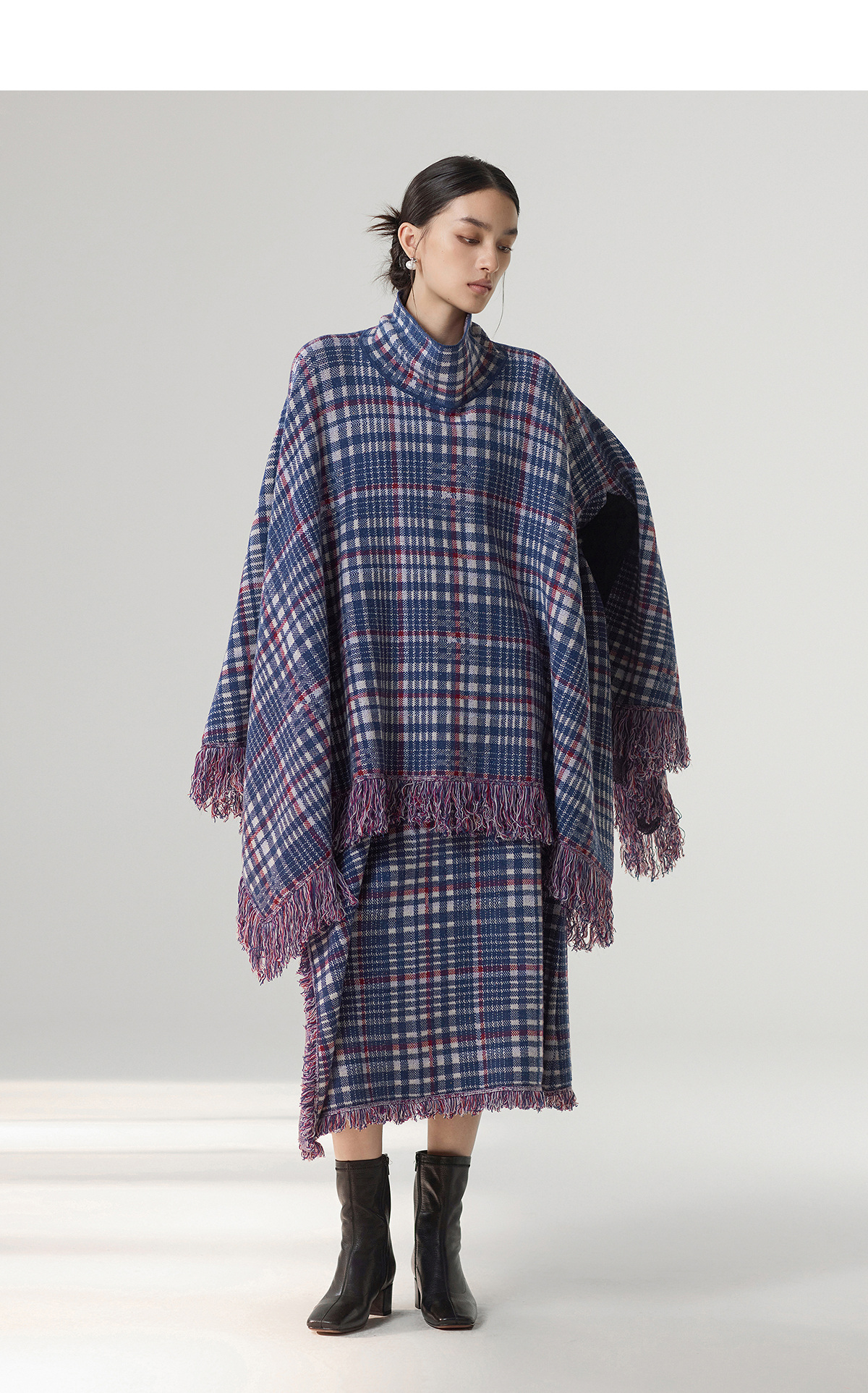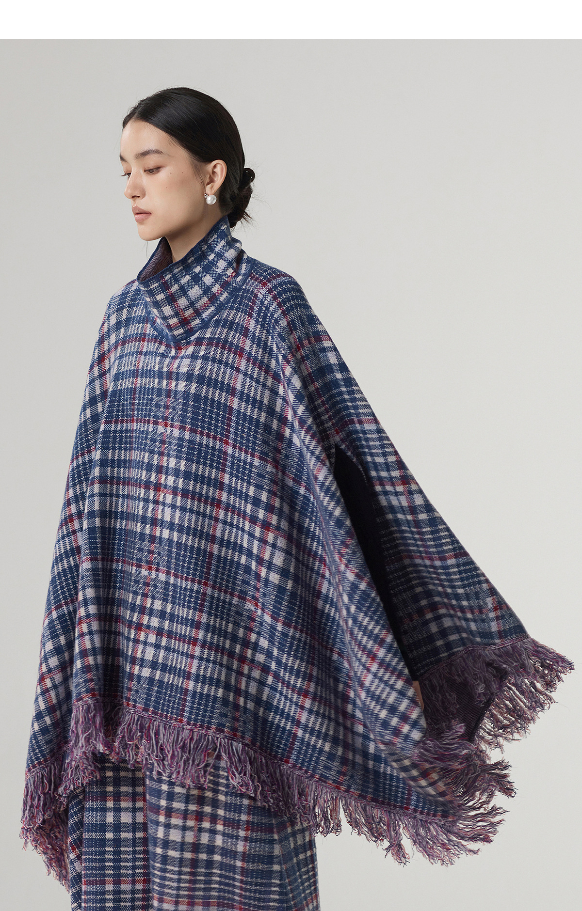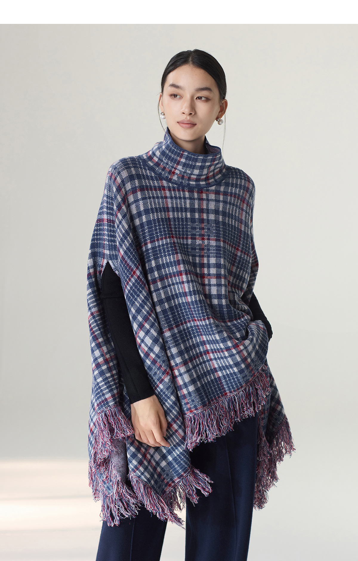 【林栖设计小店】格纹毛织披肩复古气质宽松高领2025秋冬新款流苏斗篷上衣2954006