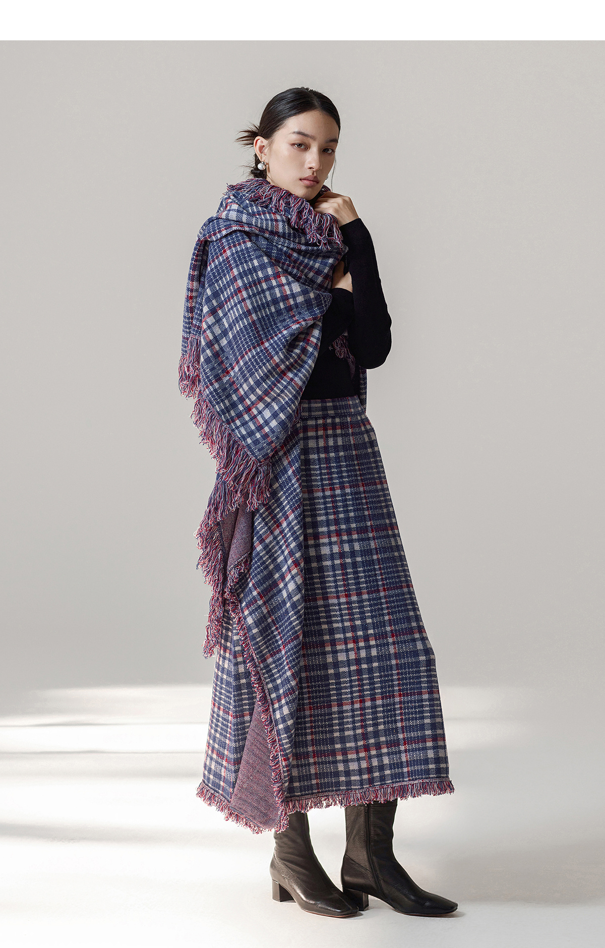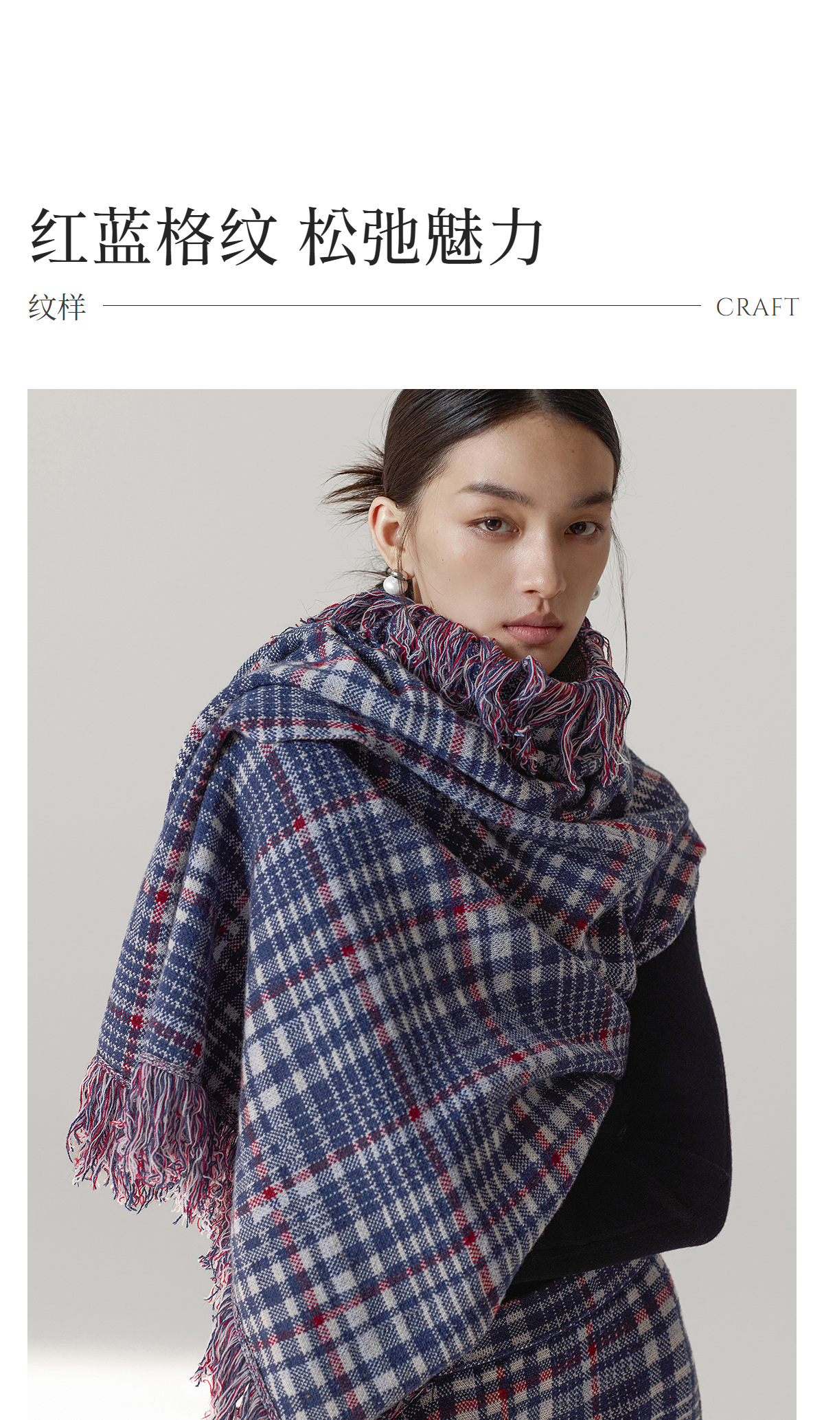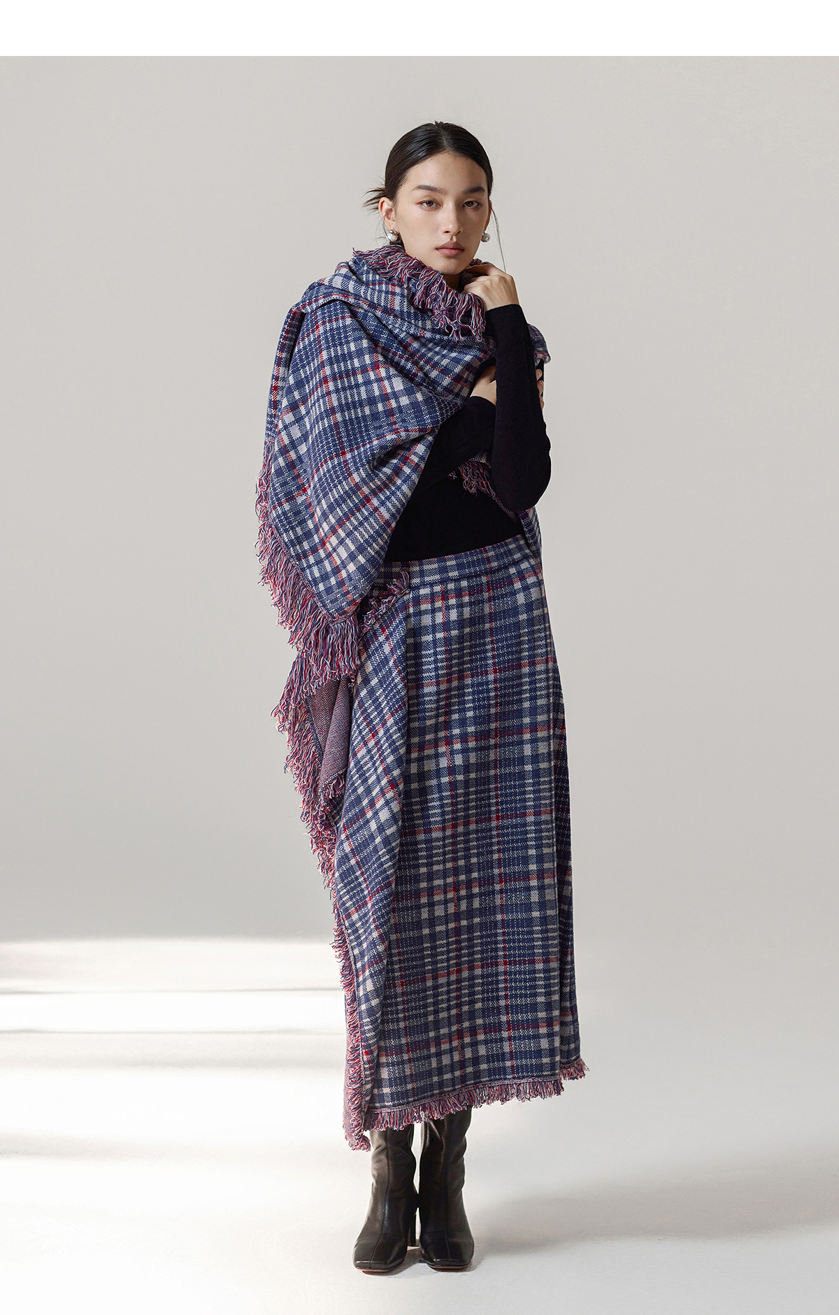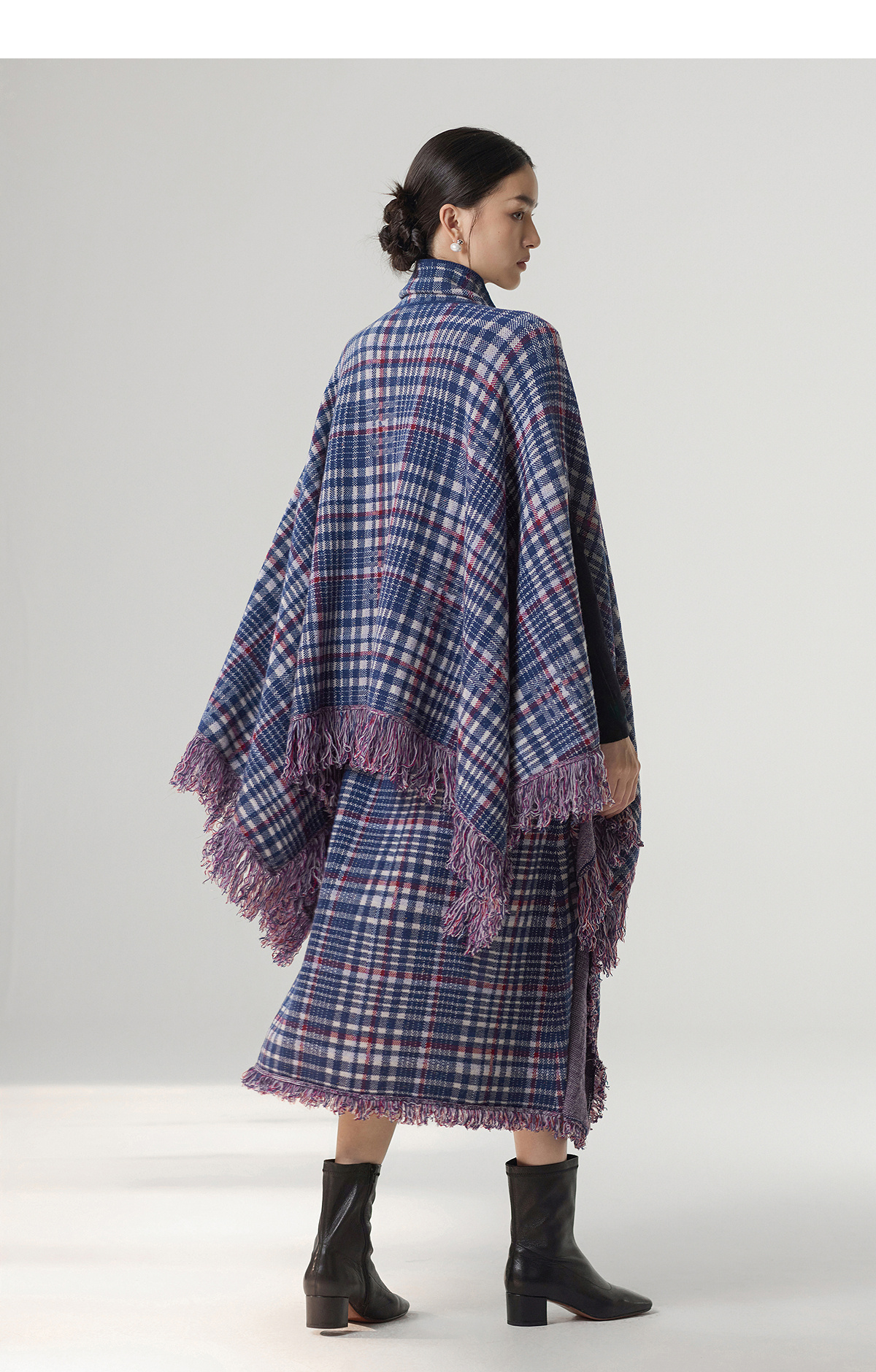 【林栖设计小店】格纹毛织披肩复古气质宽松高领2025秋冬新款流苏斗篷上衣2954006