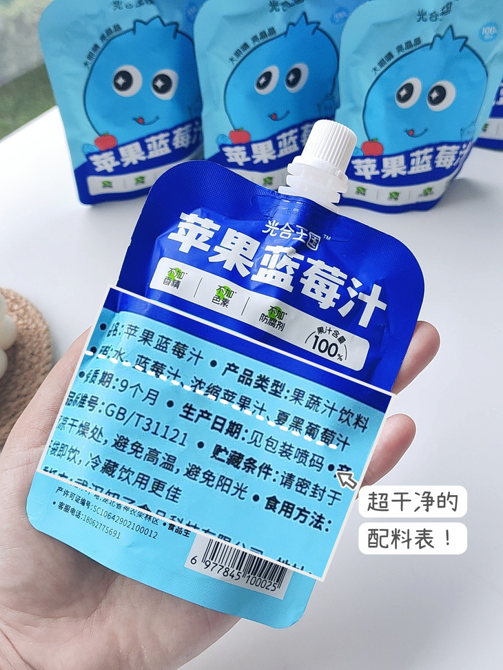 再来看看配料表🏷️屈指可数的成分❗巨干净❗ 只有水加上各种浓缩果汁而成 🈚添加任何🚫蔗糖🚫色素🚫防腐剂 100%纯果汁的含量~绿色又健康♻️ 凭实力直接碾压市面上的奶茶以及各种饮料 苹果➕蓝莓双重Buff叠加👋 花青素、叶黄素、维生素全家桶全都有 真的会让不爱喝水的娃👶🏻都瞬间爱上❣️
