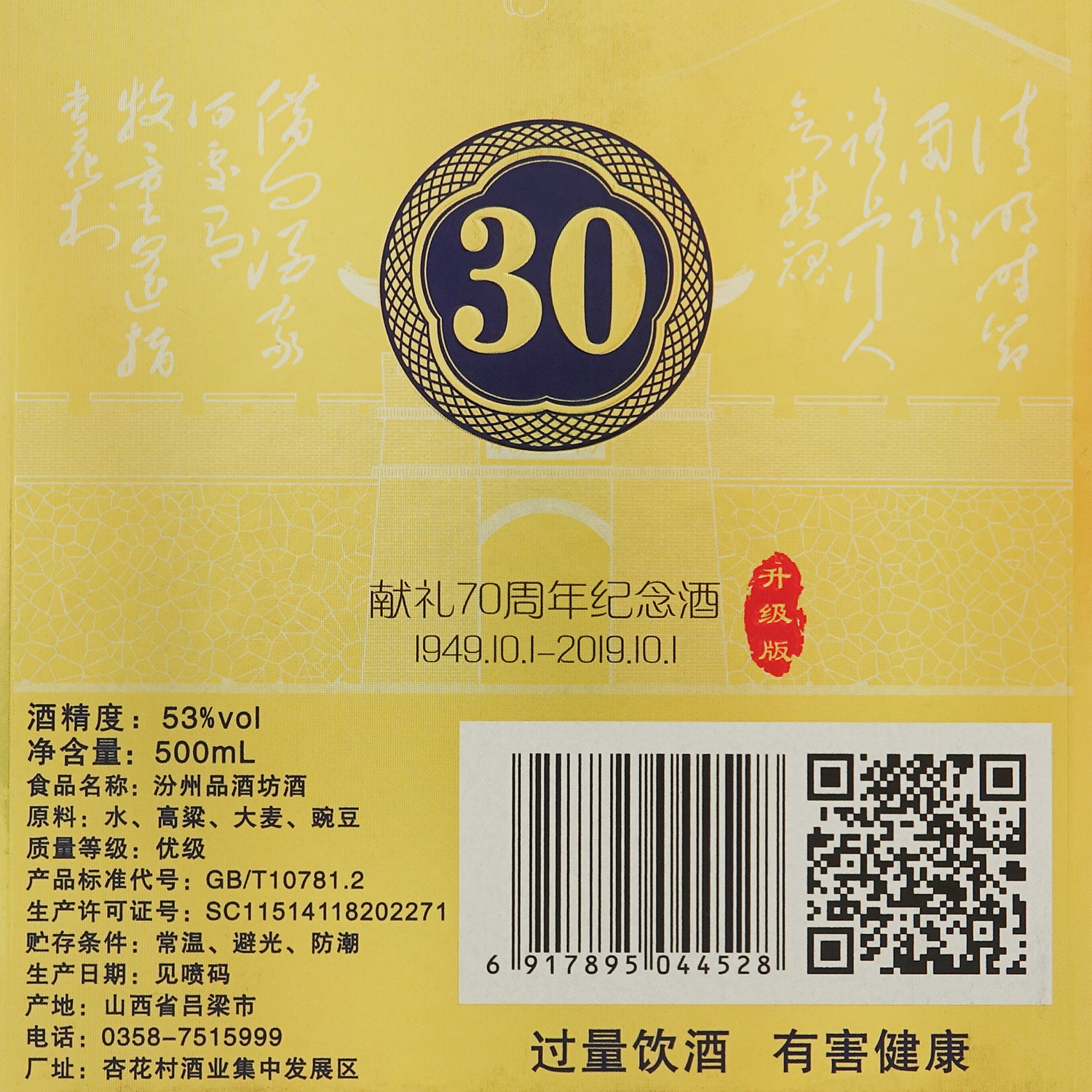 品酒坊30 汾阳市酒厂献礼70周年 纪念酒 53° 清香型