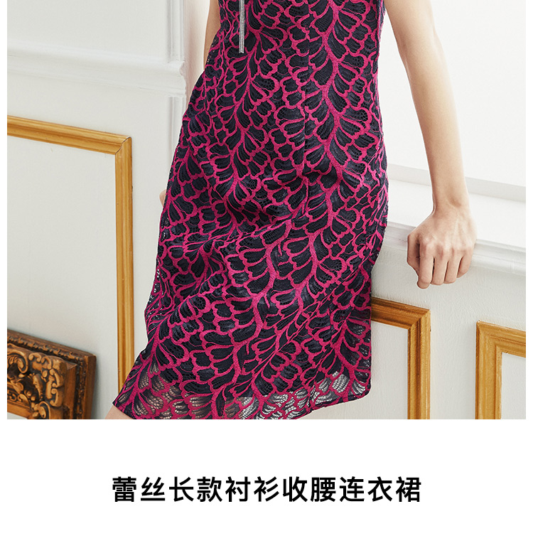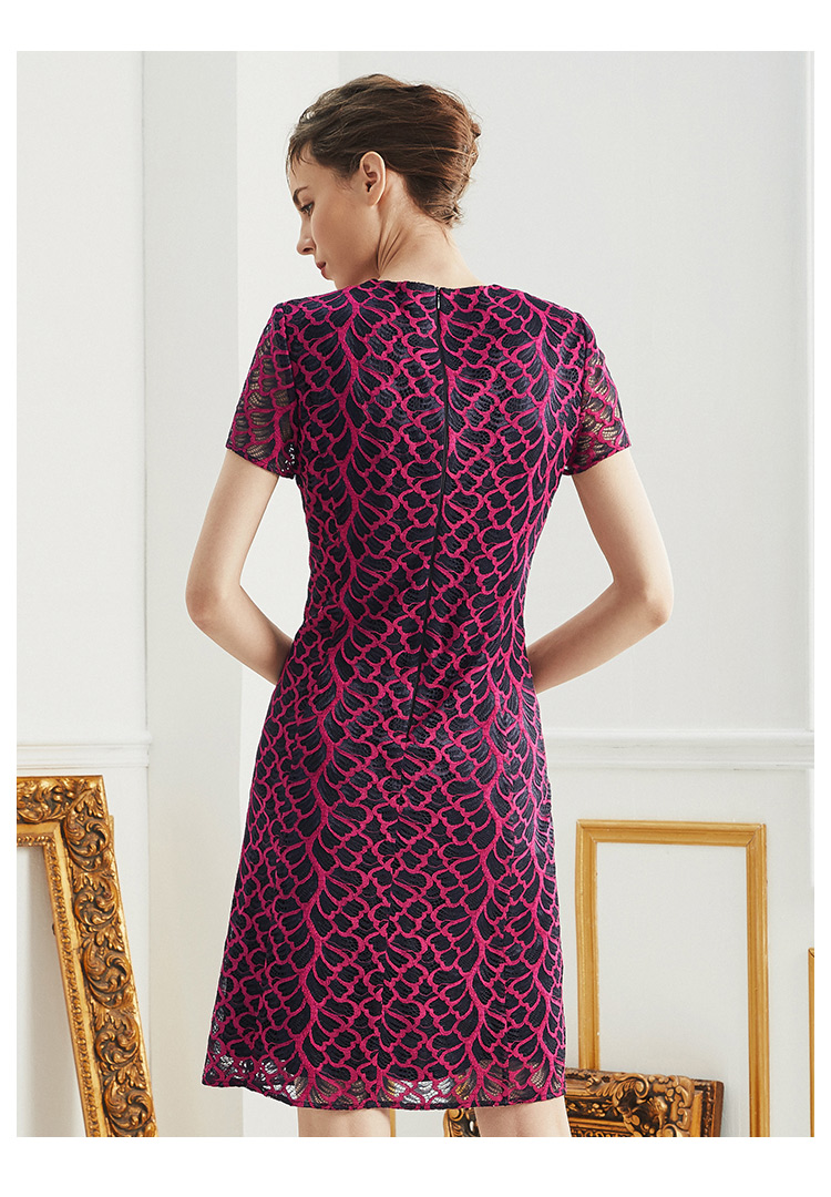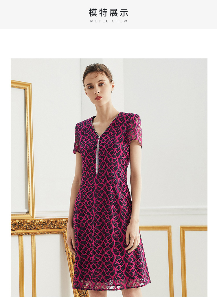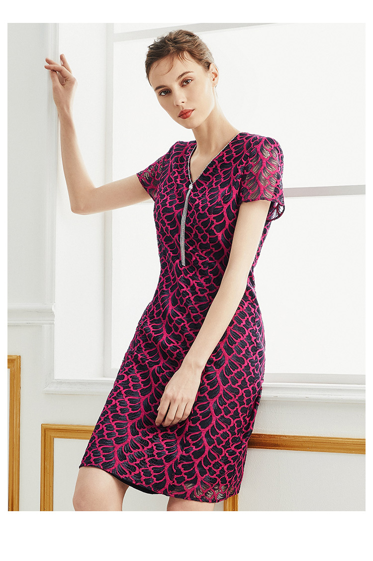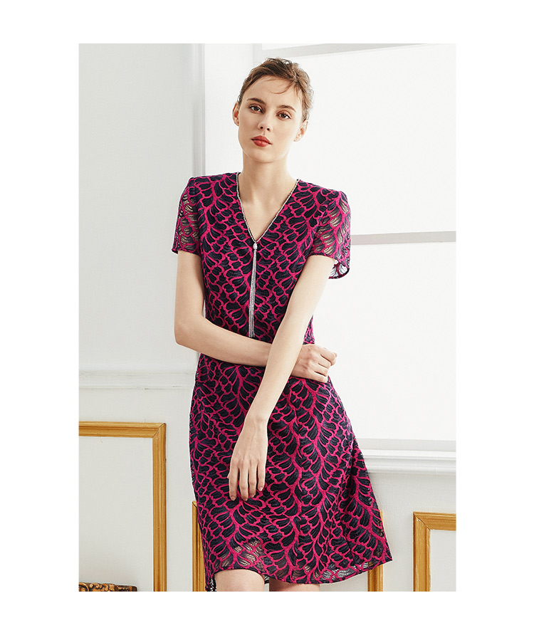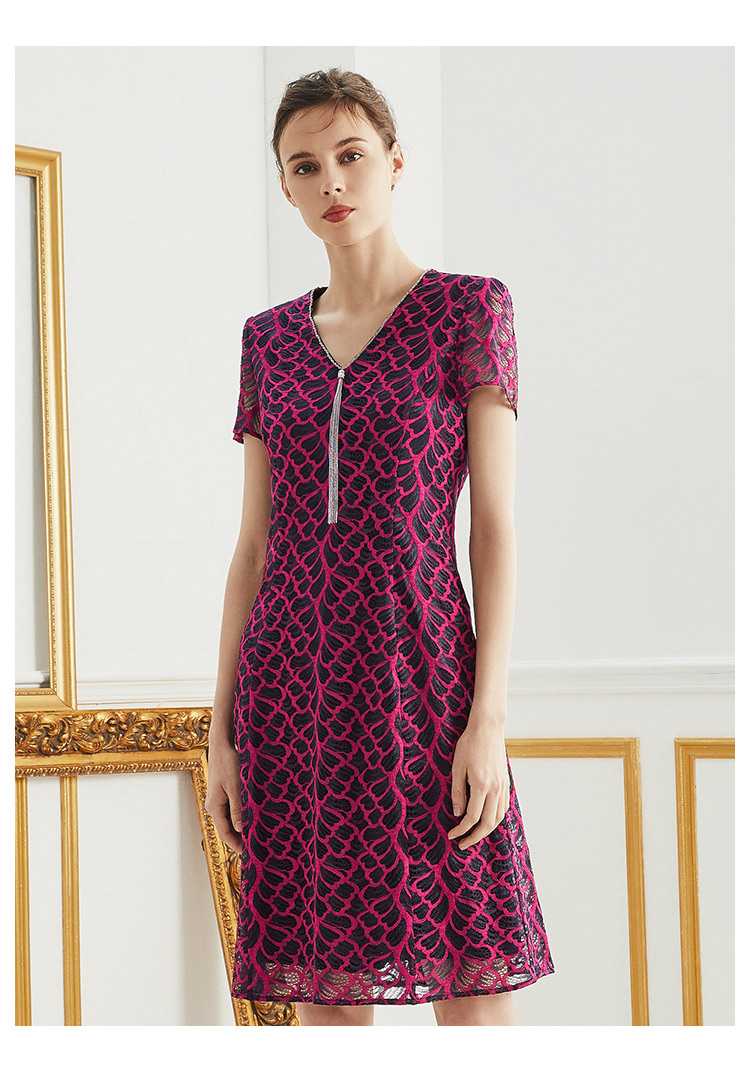 皮尔卡丹女装夏玫红色网纱袖V领短袖连衣裙A字裙P0200DS48D3