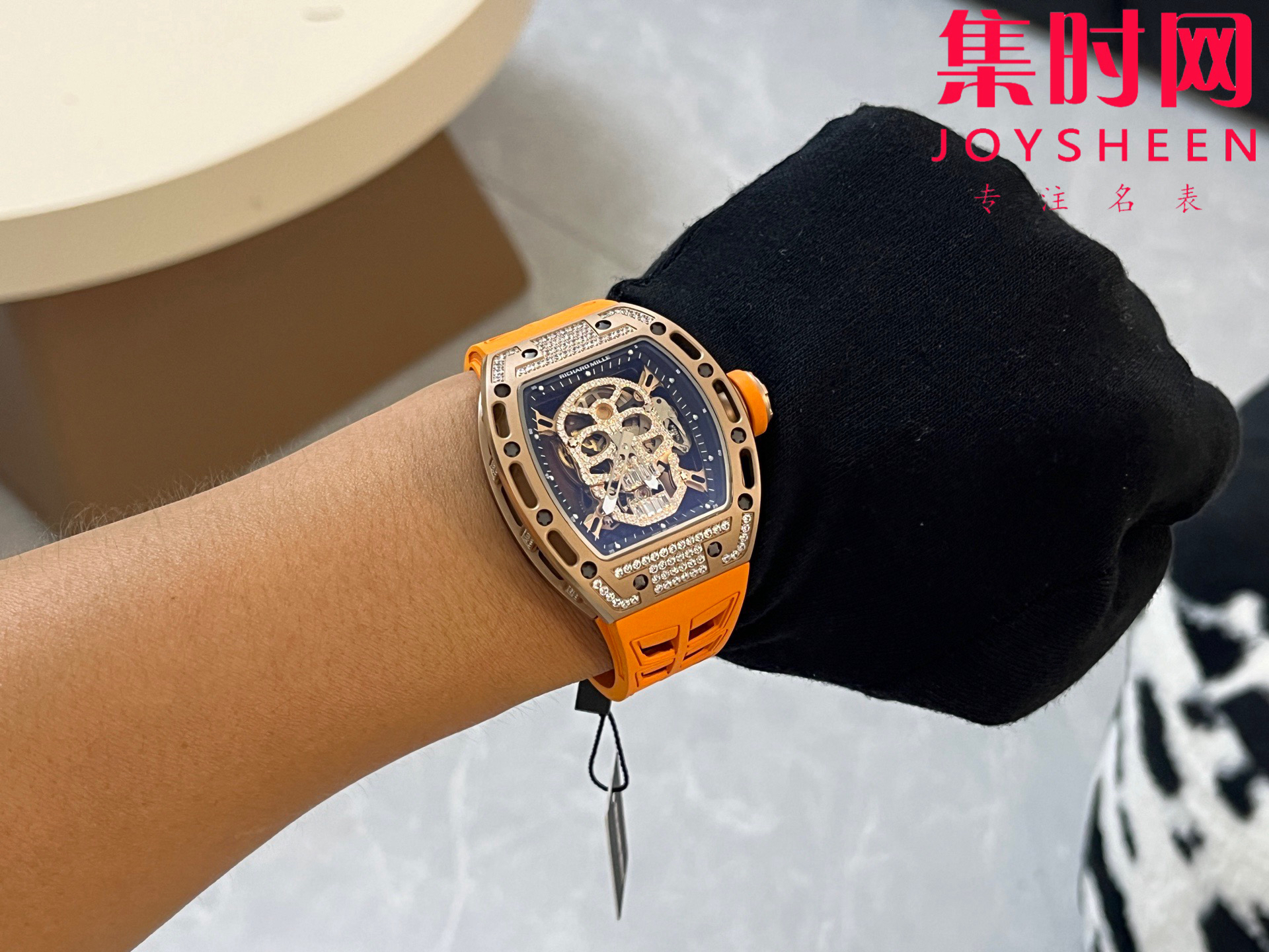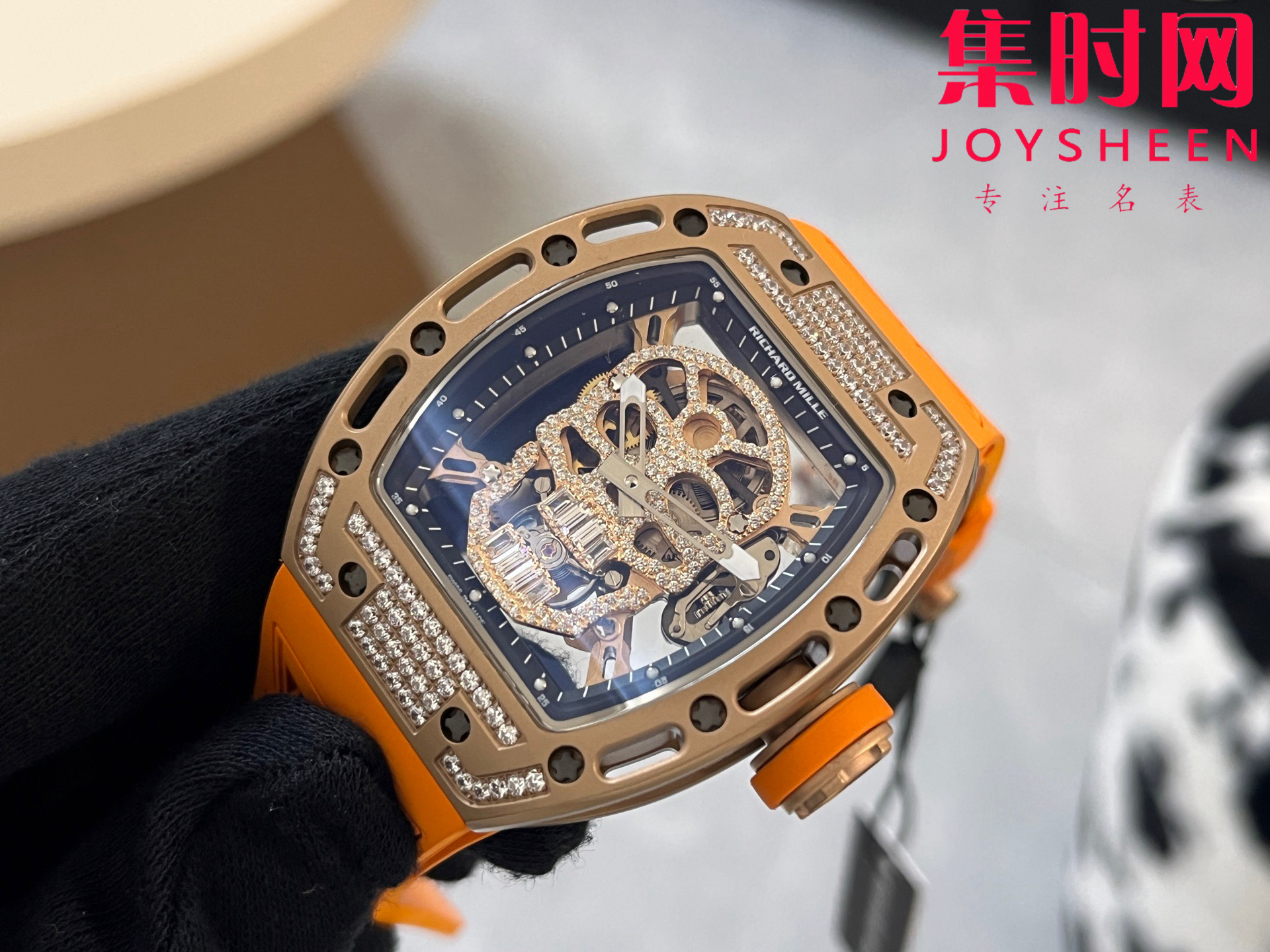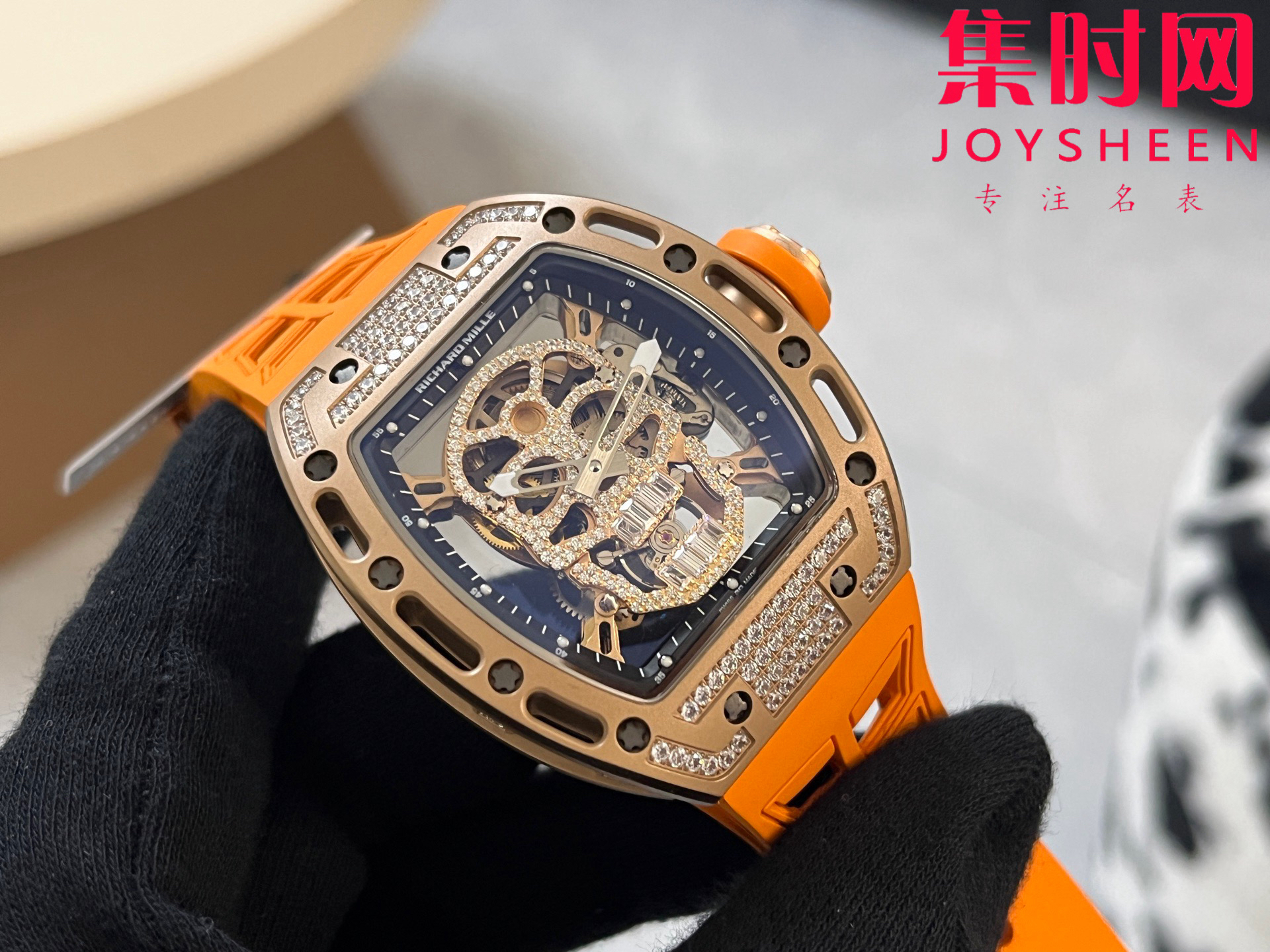 理查德米勒 RM052骷髅满天星 钻圈款 男士腕表 搭载定制一体手动上链机械机芯,鬼头经典传奇 镂空骷髅头腕表.骷髅头轮廓突出,造型霸气不羁,具有震撼人心的魅力。搭配艳耀色彩的橡轻便表带,更拉风,更前卫。腕间搭上鲜艳的表款,是不是很吸睛?表壳尺寸:43mmx50mm 真实展现!