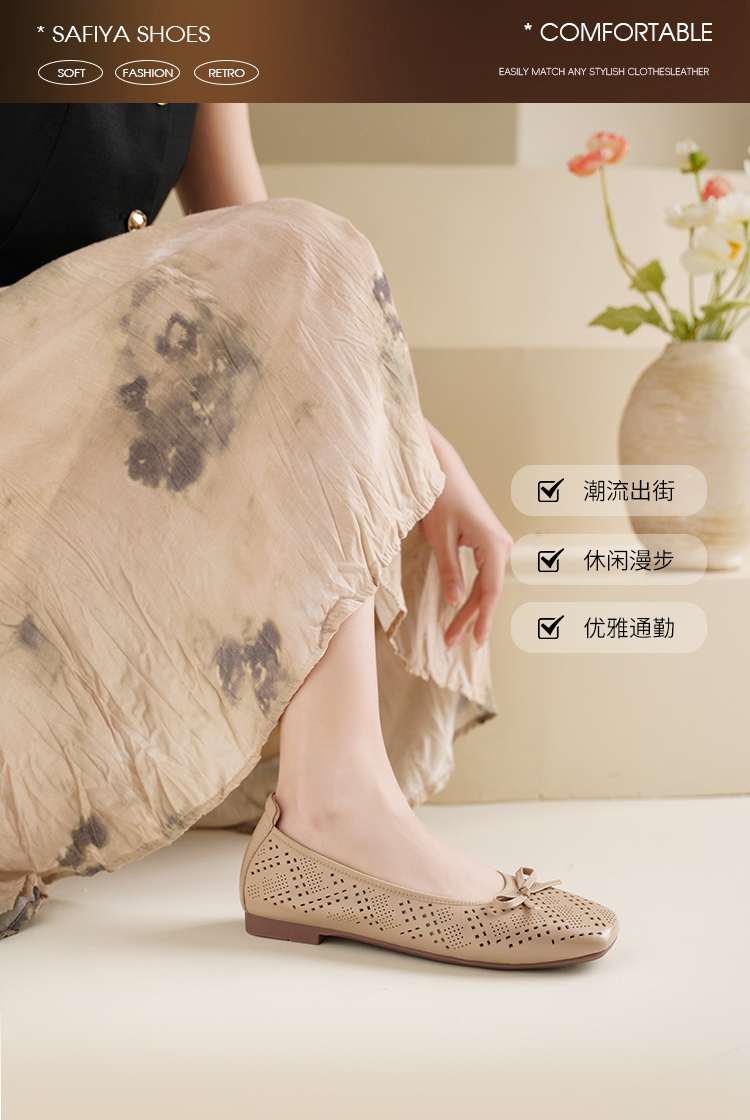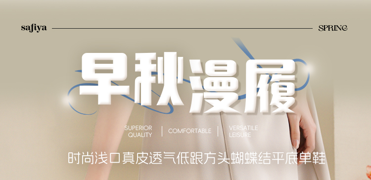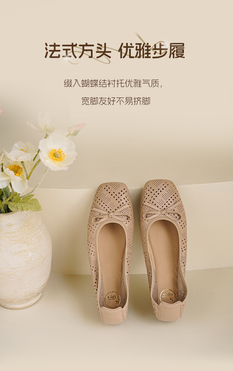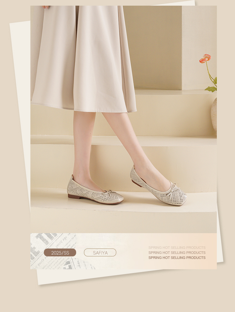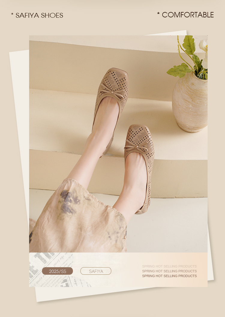 Safiya/索菲娅2025时尚浅口真皮透气低跟方头蝴蝶结平底单鞋SFD3111402