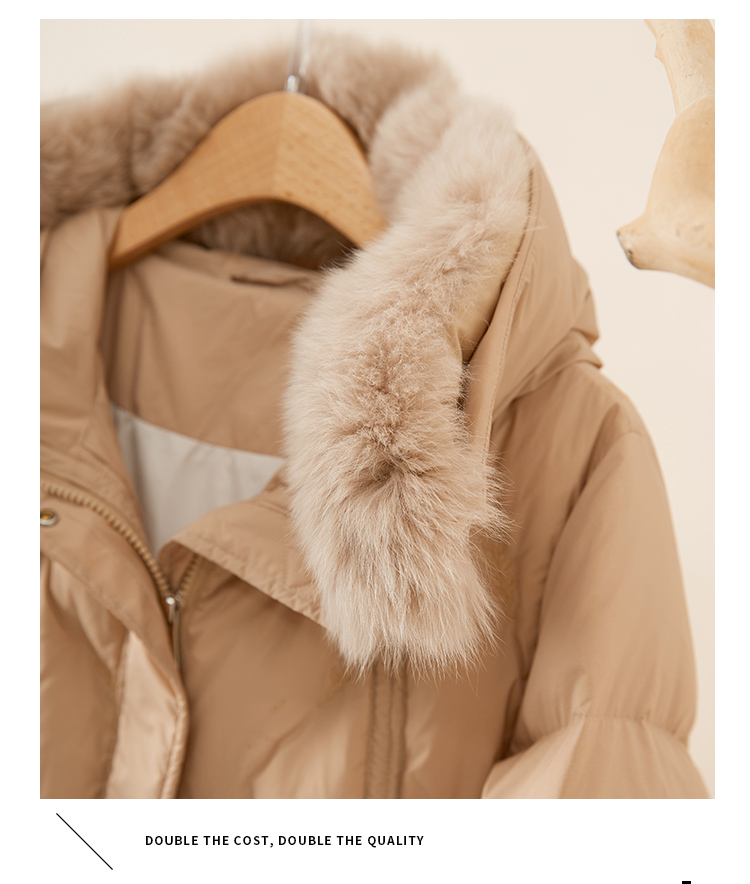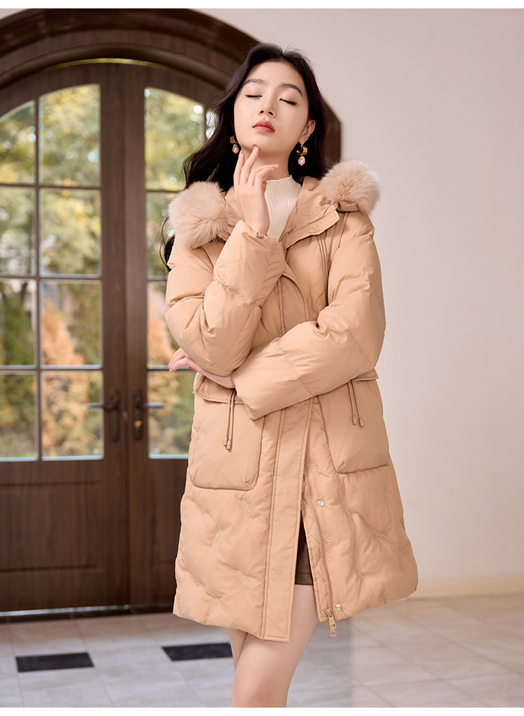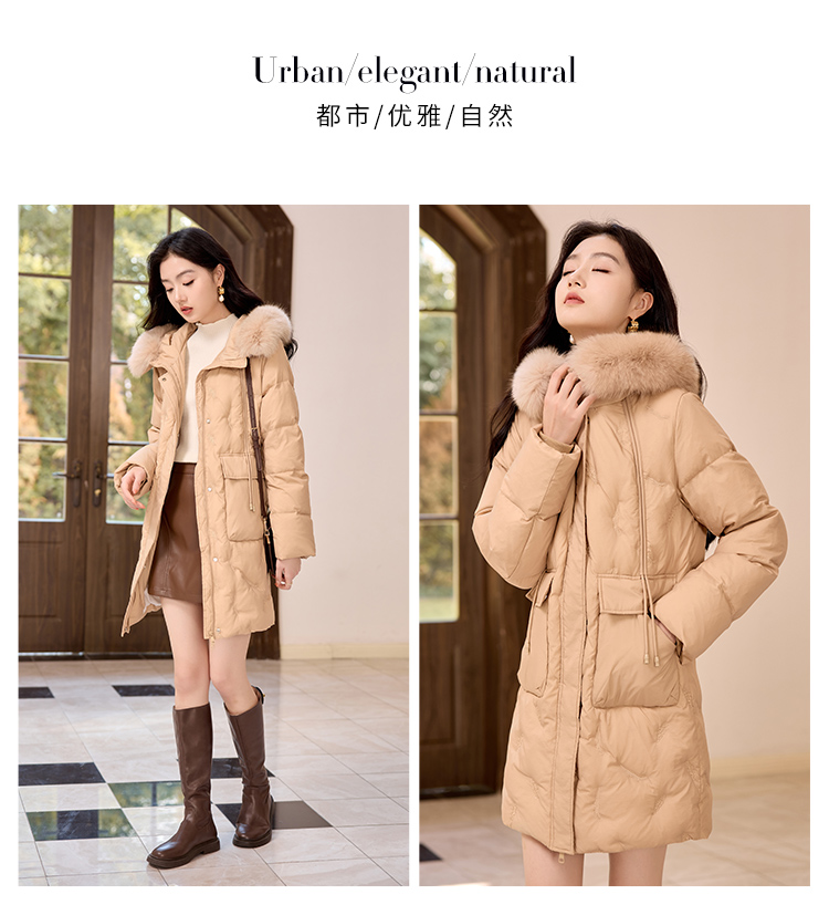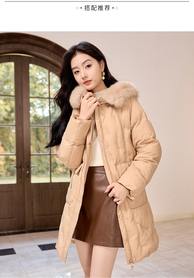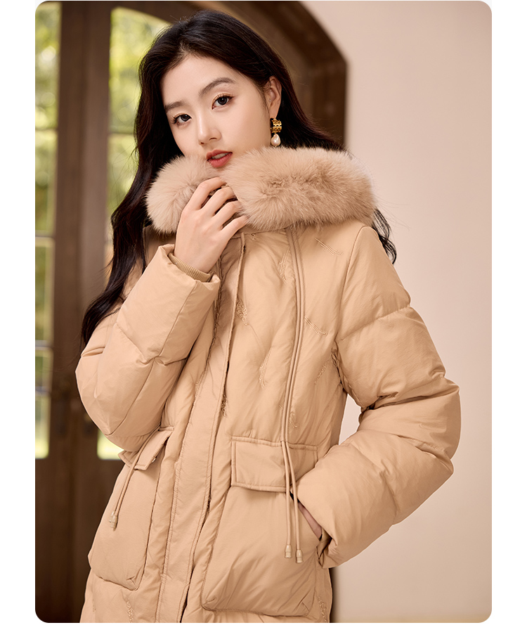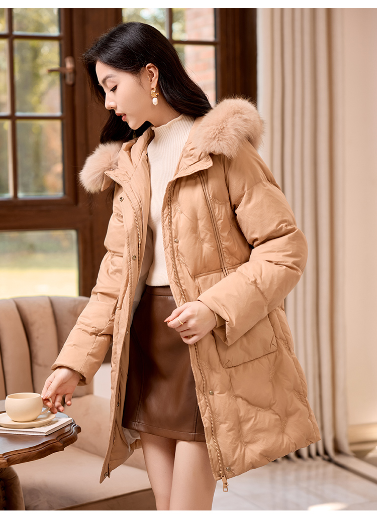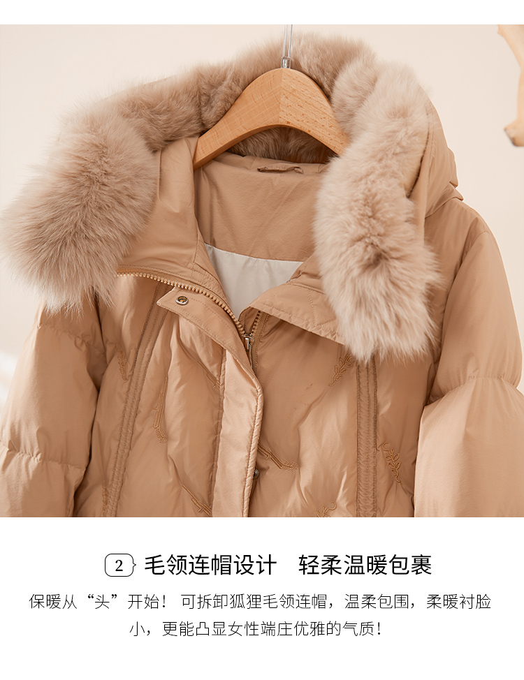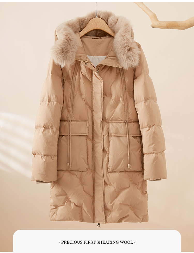 【年终特卖】熙世界2025新款时髦狐狸毛领羽绒服女士中长款白鸭绒连帽外套冬装