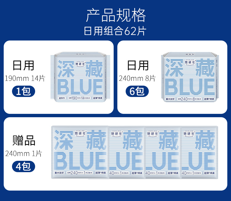 她研社深藏BLUE常规款日用组合7包62片 送4片同款日用 能吸且薄 透气舒适