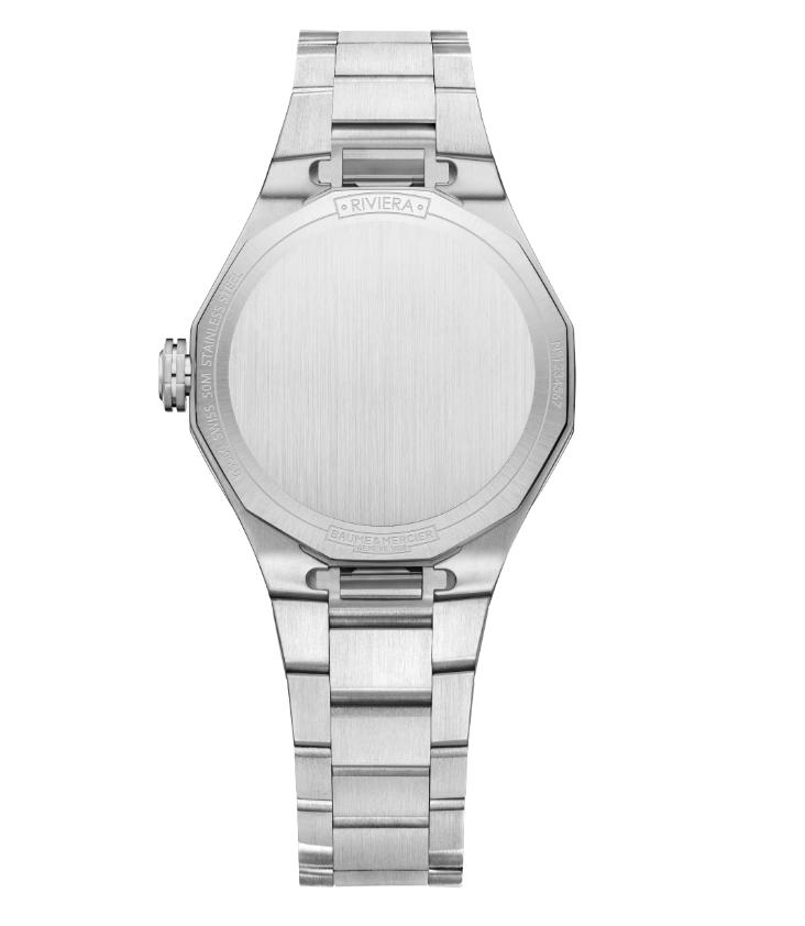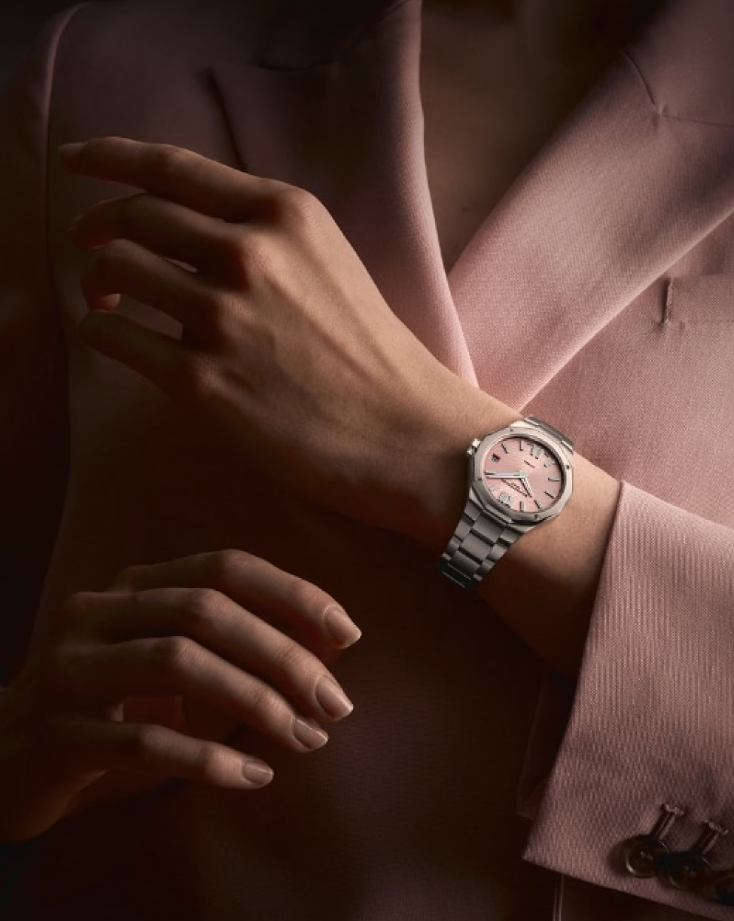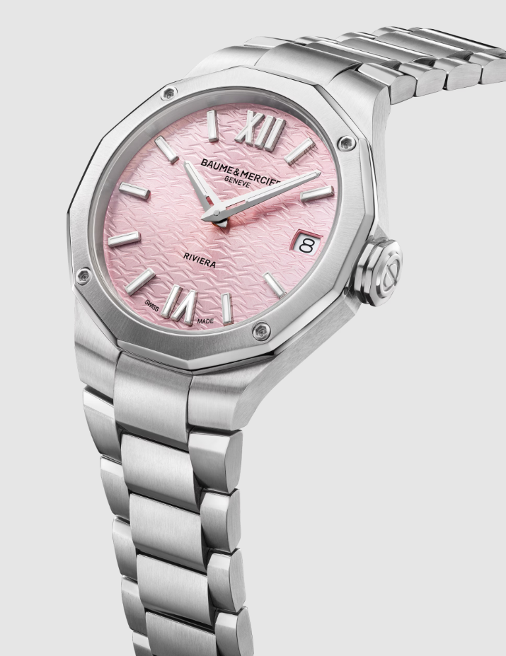利维拉系列 10812 腕表采用太阳缎面打磨粉色表盘饰有透明波浪纹,镀铑罗马数字和铆接时标涂有白色 Superluminova 夜光涂层。十二边形抛光缎面精钢表壳,八角形自由式表冠上压印有 Phi 徽标。可更换式精钢表链采用可靠的免工具快拆装置。
