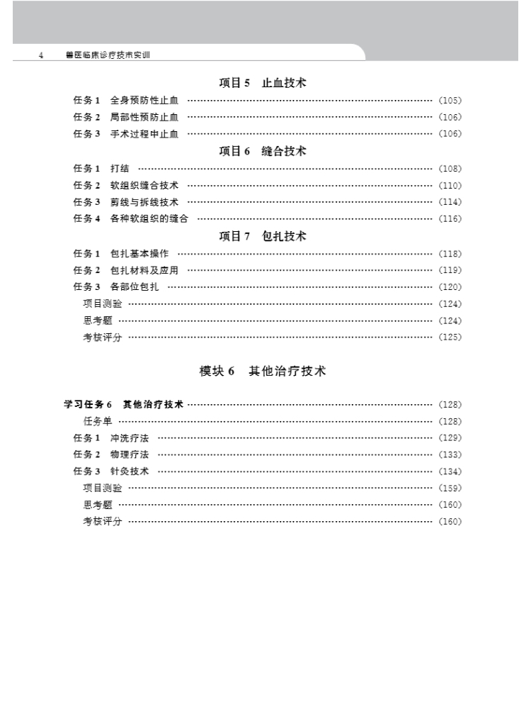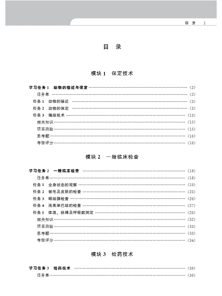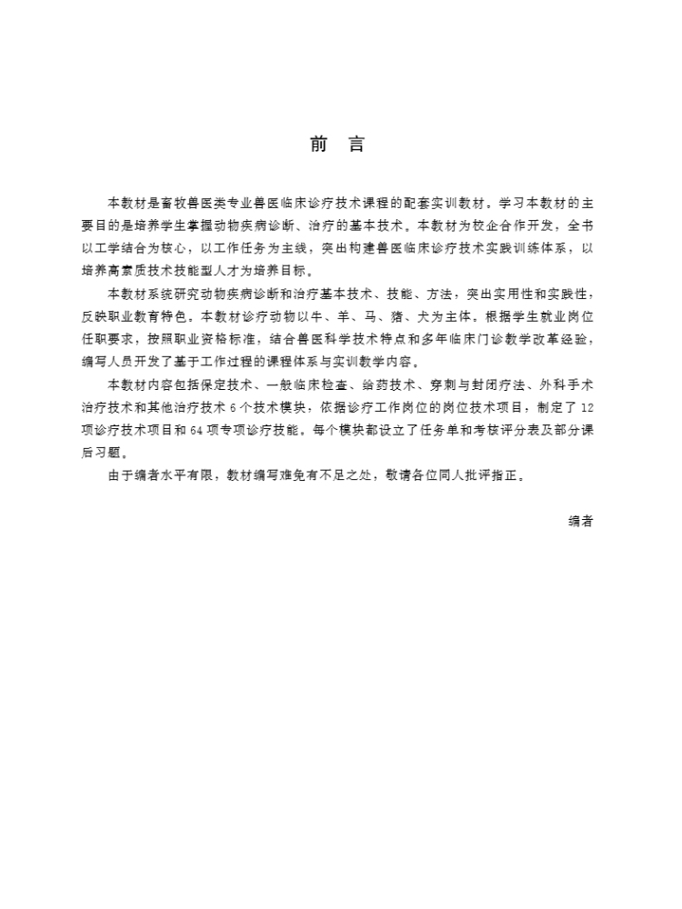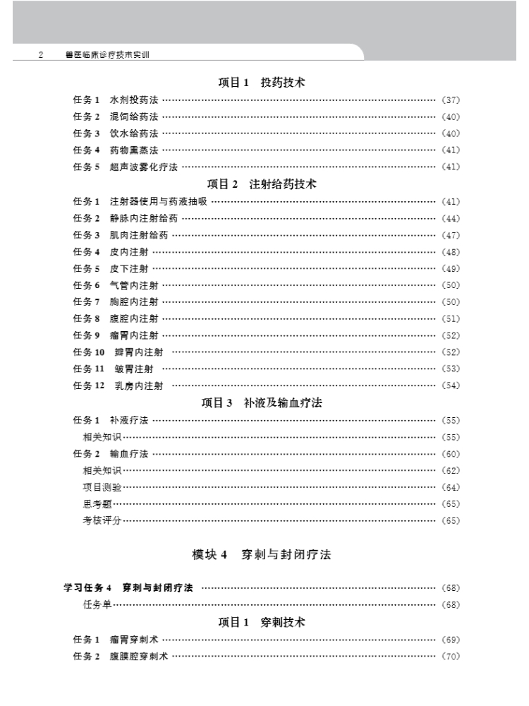 本教材为畜牧兽医专业基础课实训教材。全书包括保定技术、一般临床检查、临床治疗技术、外科手术治疗技术四个模块,主要内容有动物的接近与保定、一般临床检查、穿刺术、补液、普鲁卡因封闭疗法、输血疗法、灌肠法、注射给药法、投药技术、常用外科手术器械识别及其使用、手术前的准备、麻醉技术、组织分离技术、止血技术、缝合技术、包扎技术、针灸技术等。全书设立了大量的“二维码”,通过扫描二维码学生可获取相关内容的教学课件、微课视频等数字资源。本教材适合高等职业教育动物医学、畜牧兽医、宠物医疗技术、宠物养护与训导类相关专业的学生使用,也可作为从事相关行业技术人员的参考用书。