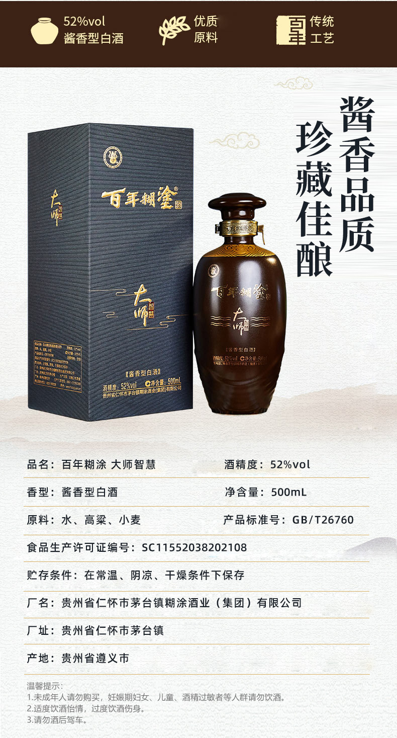 【官方自营正品】百年糊涂大师智慧52度酱香型白酒【咨询客服享限时折扣】