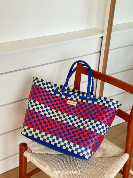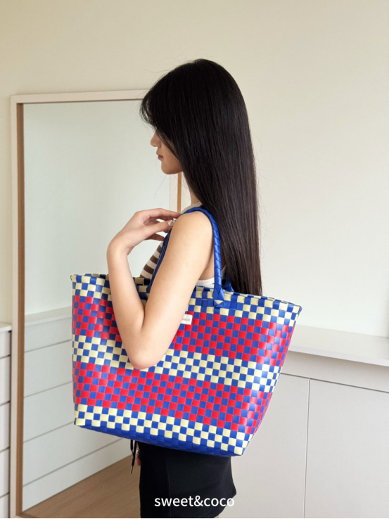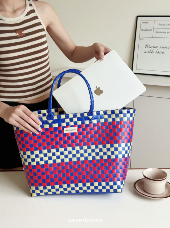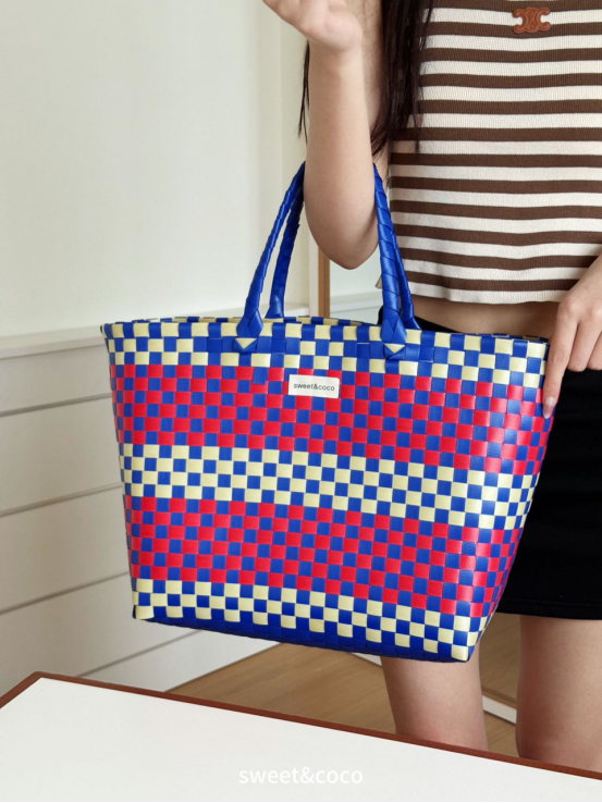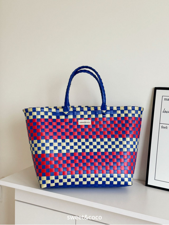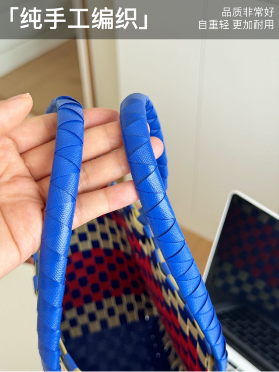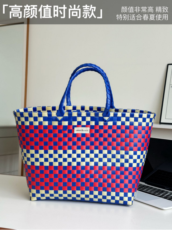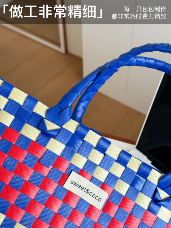 第三款:红蓝拼色款: 美式复古yyds!红与蓝的碰撞超吸睛 走在街上回头率爆表 编织纹路错落有致,细节感满分 用来装书本 逛街囤货都超合适 满满的复古学院风 活力又俏皮 绝绝子!