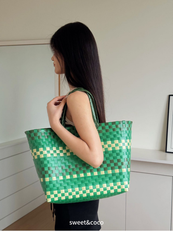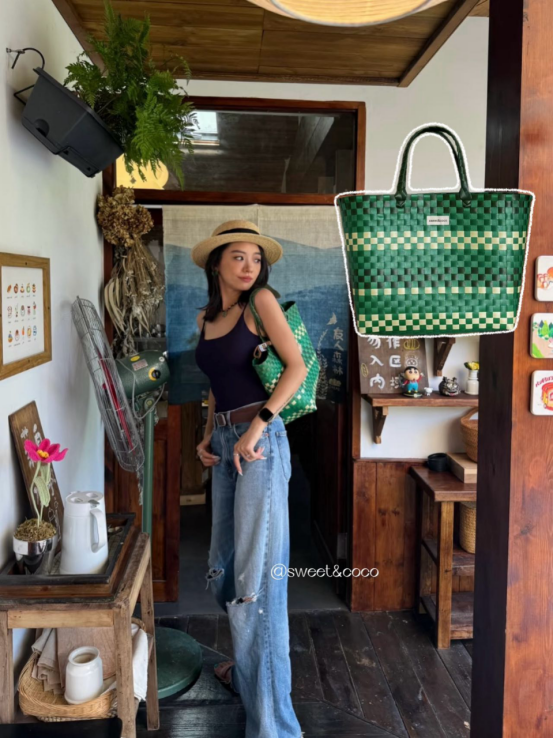 第二款:绿色 把春天背在身上的感觉!! 绿色调温柔又治愈 手工编织的纹理带着自然的气息 无论是去花市还是周末野餐🧺 它都能轻松融入 妥妥的氛围感神器!