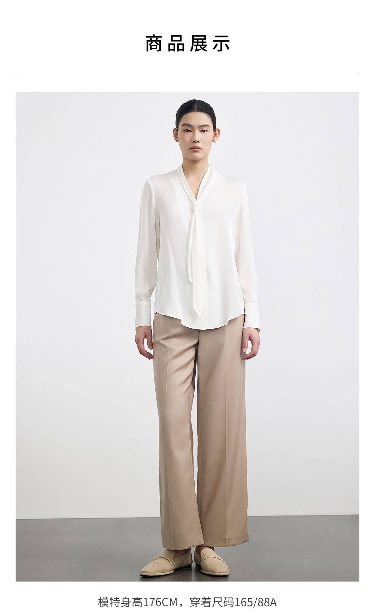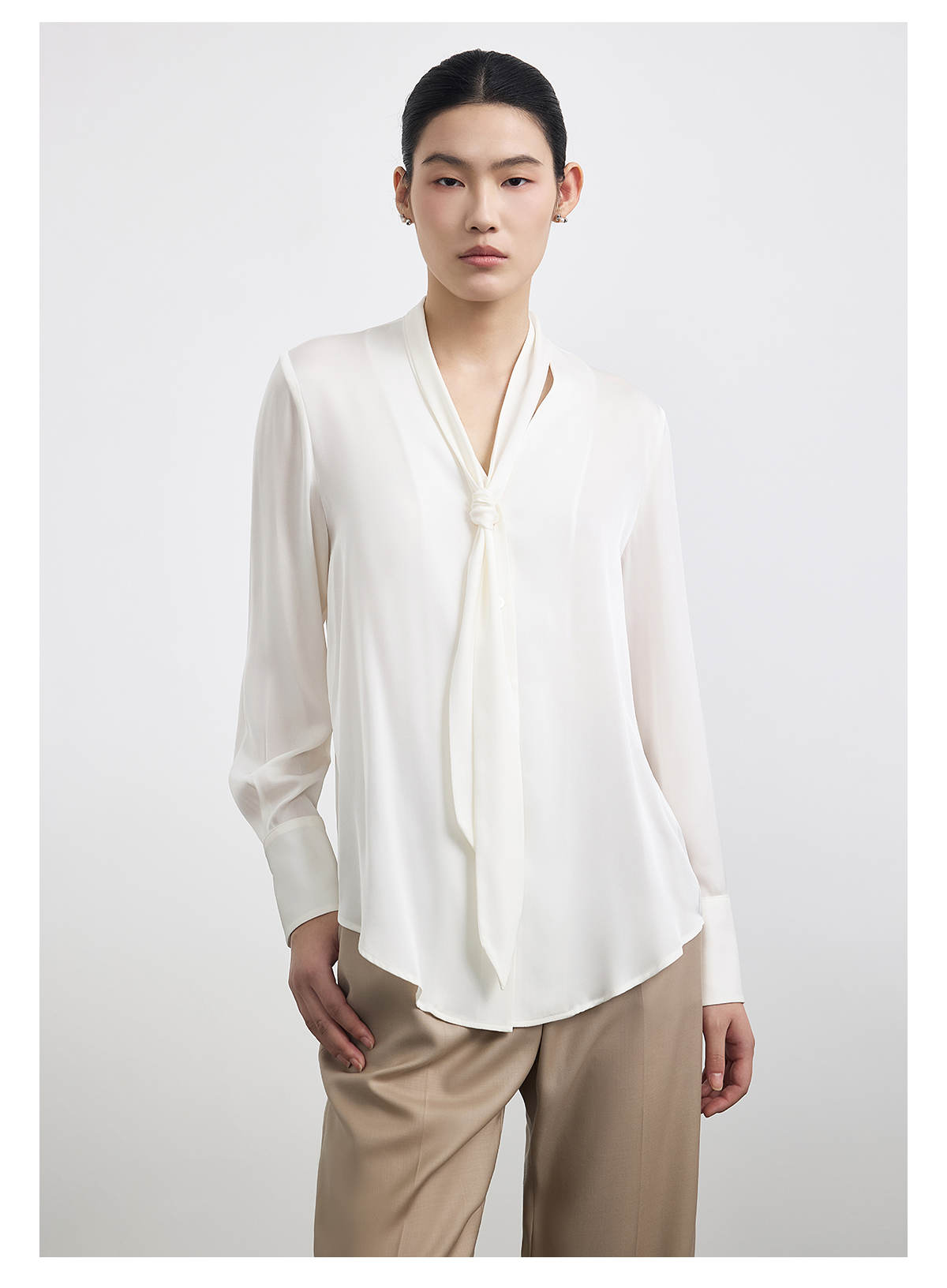 PURE TOUCH 白色飘带V领真丝衬衫