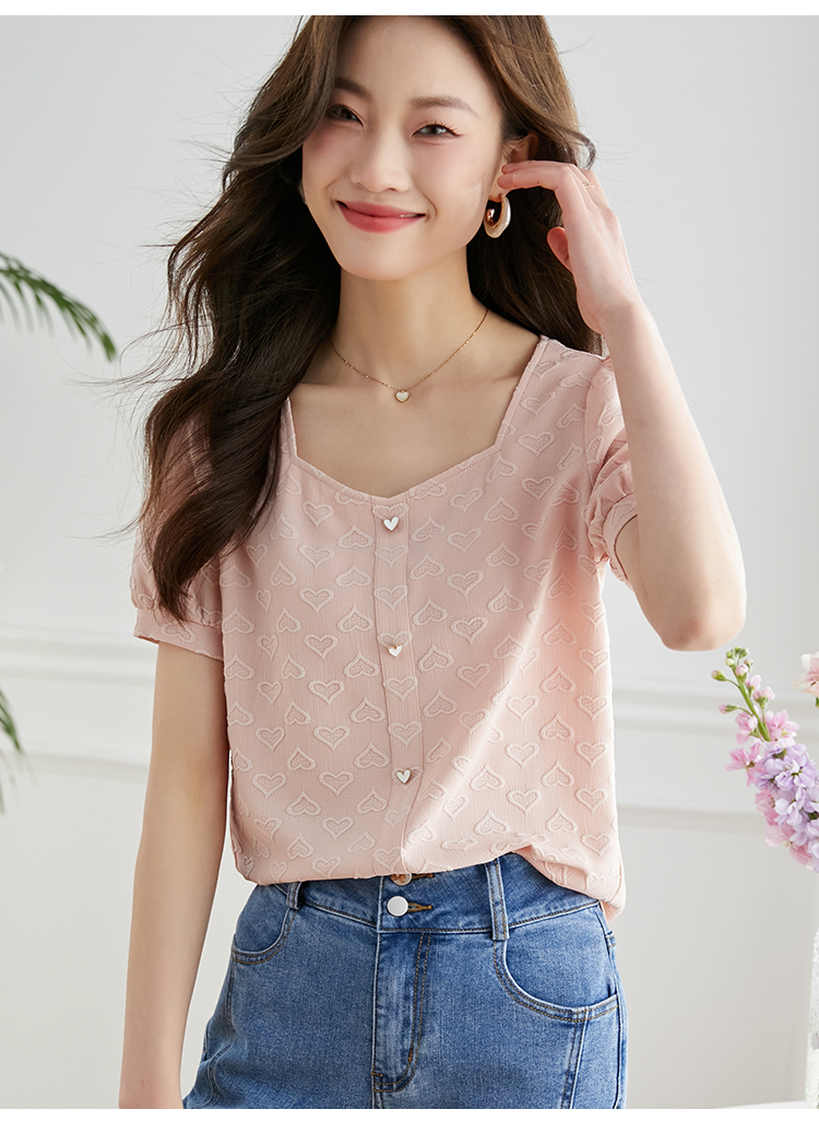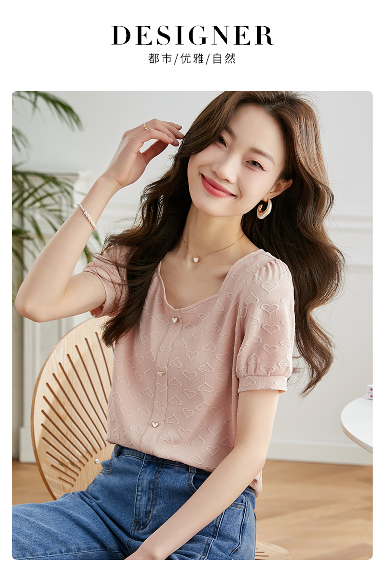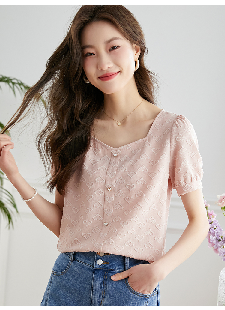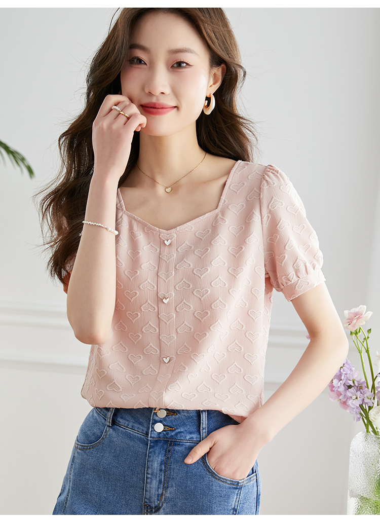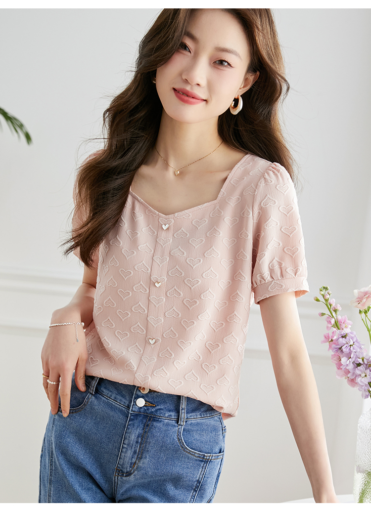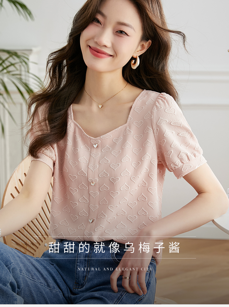 【专属特价】熙世界重磅银丝爱心印花雪纺衬衫女夏季甜美风泡泡袖法式方领上衣