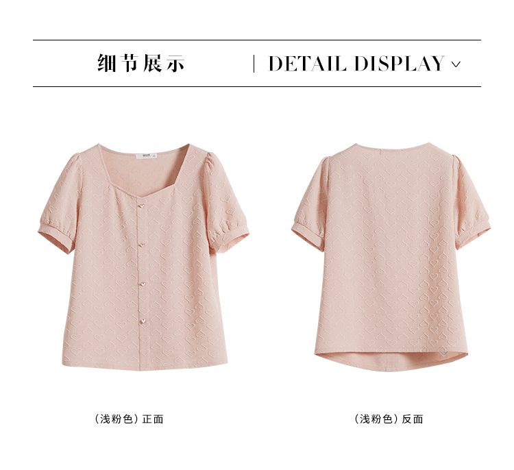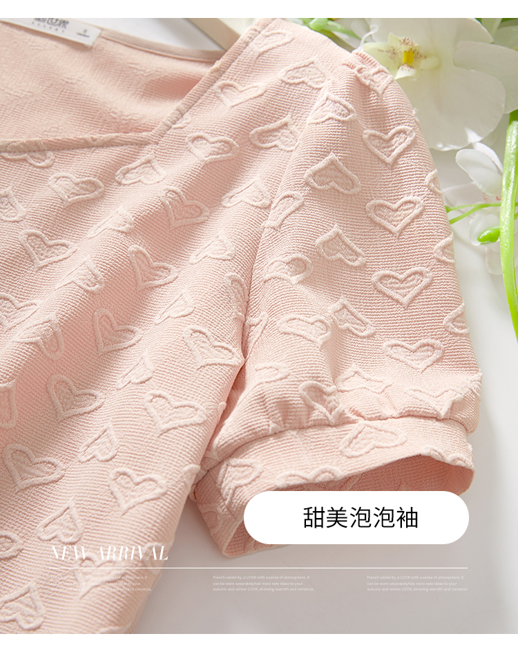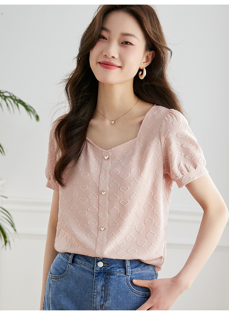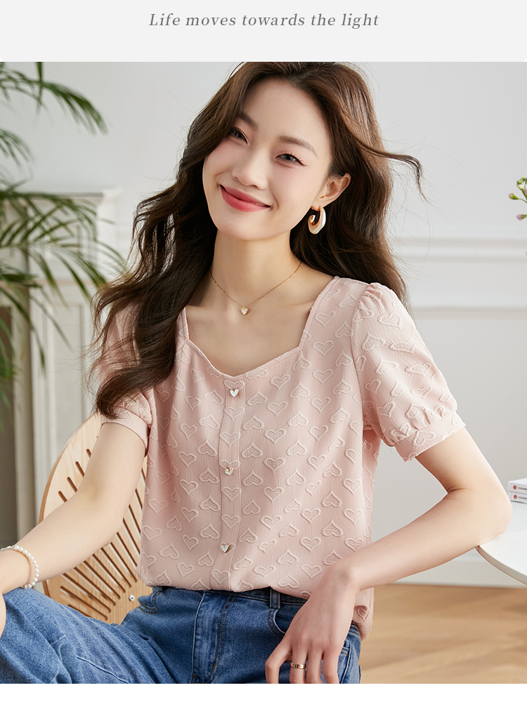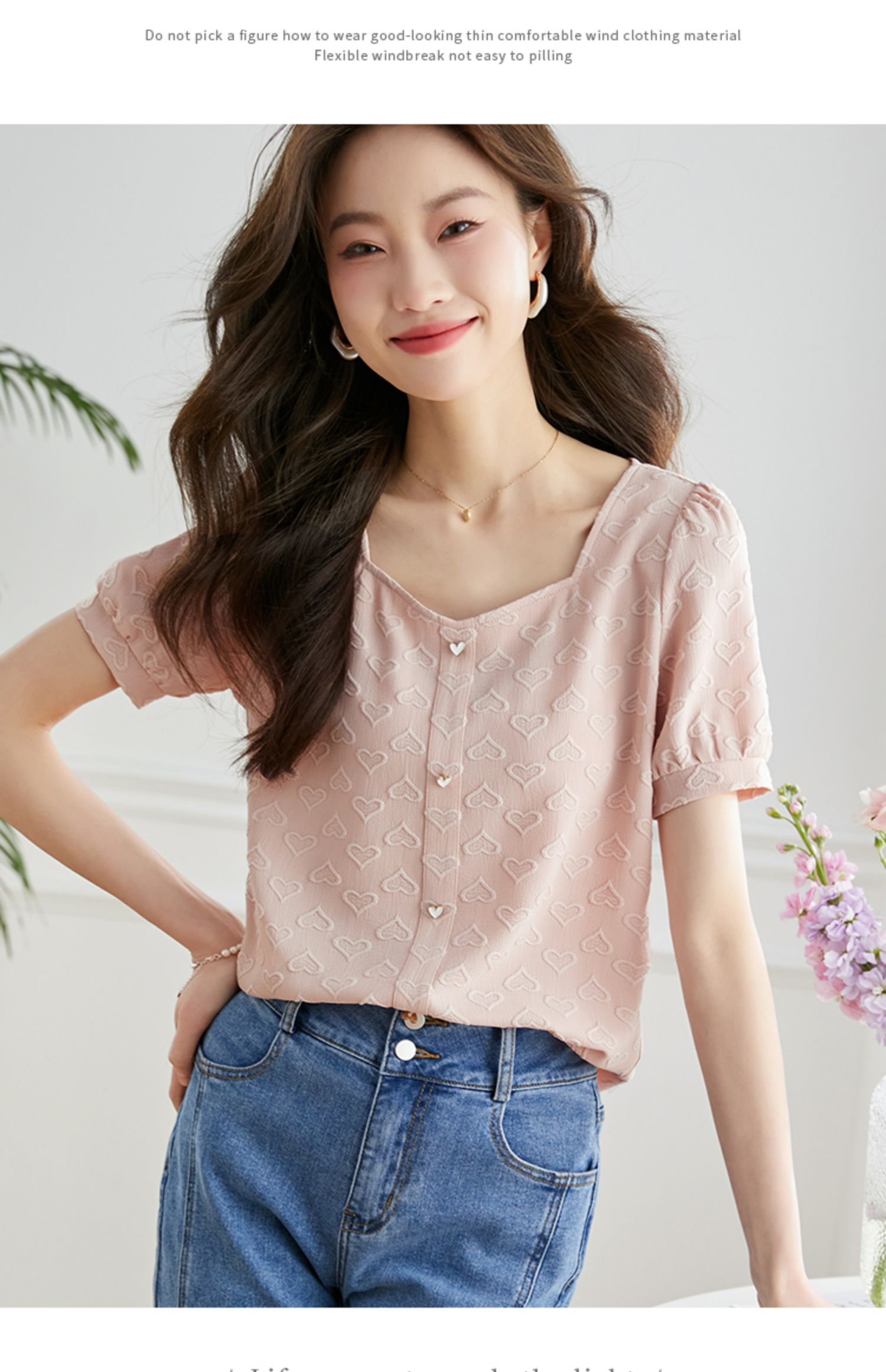 【专属特价】熙世界重磅银丝爱心印花雪纺衬衫女夏季甜美风泡泡袖法式方领上衣