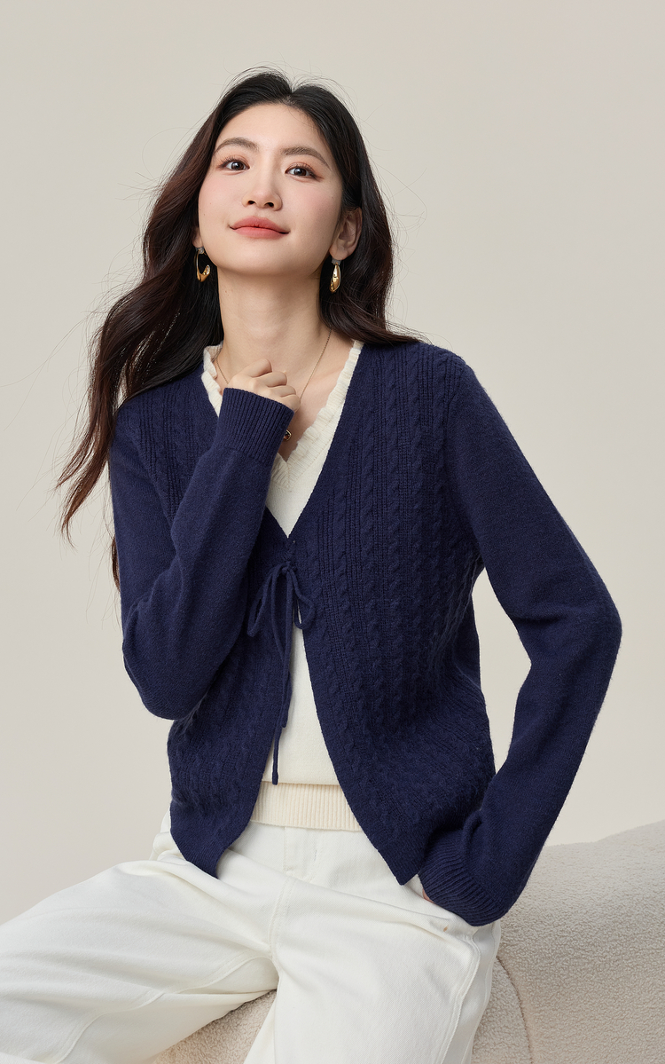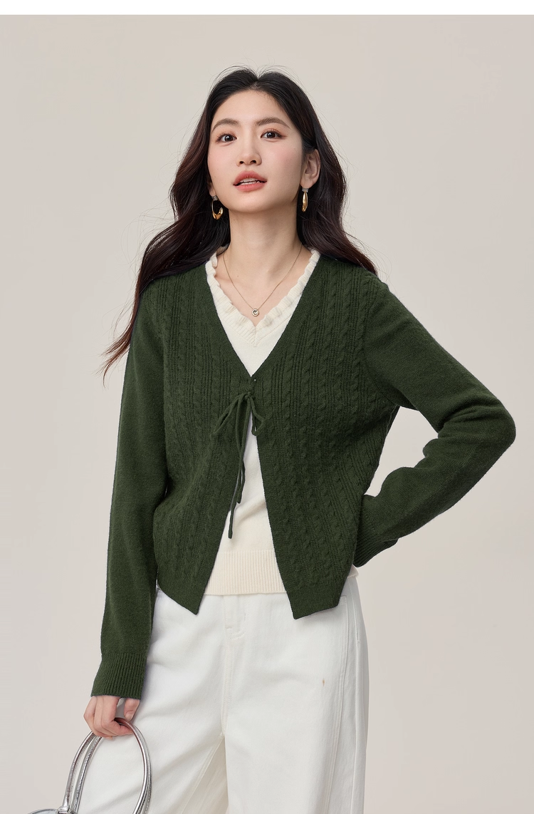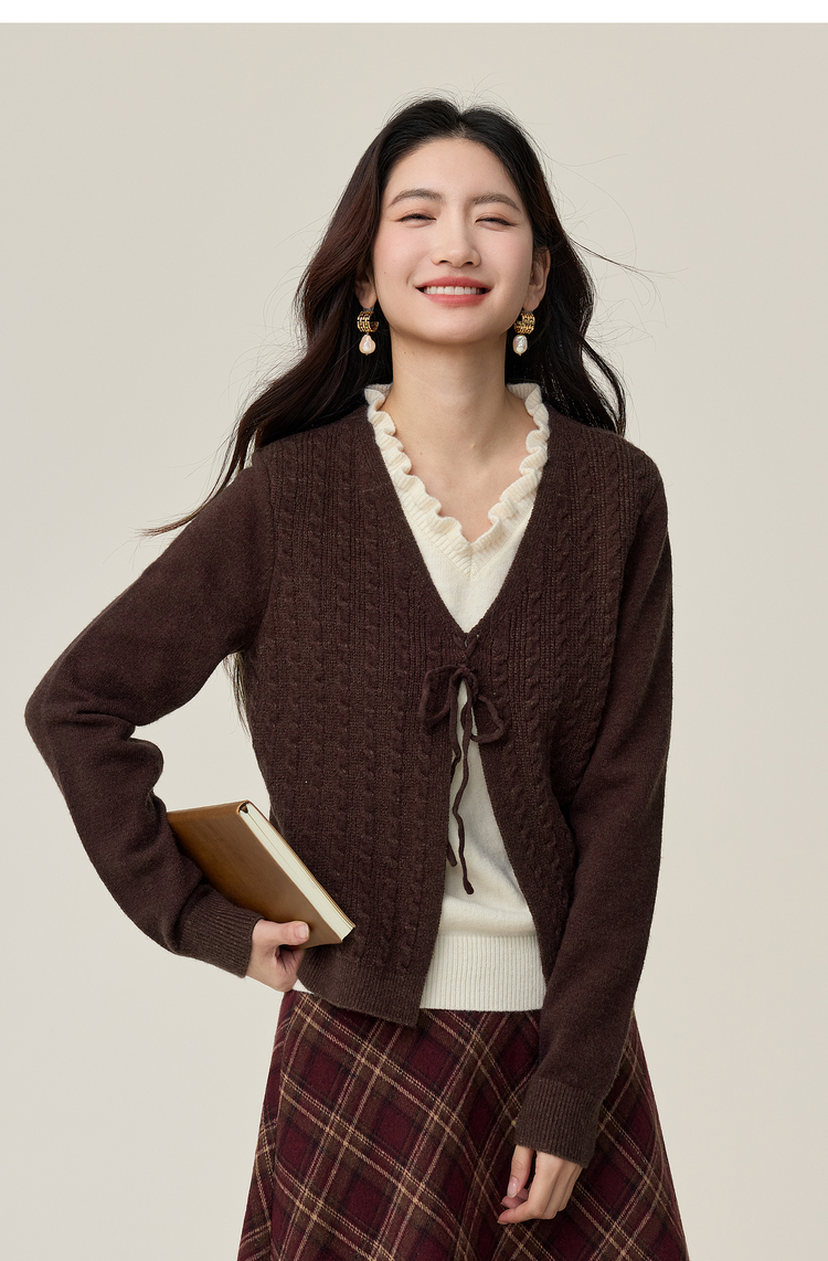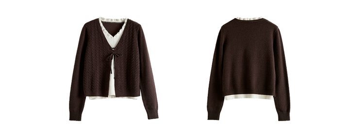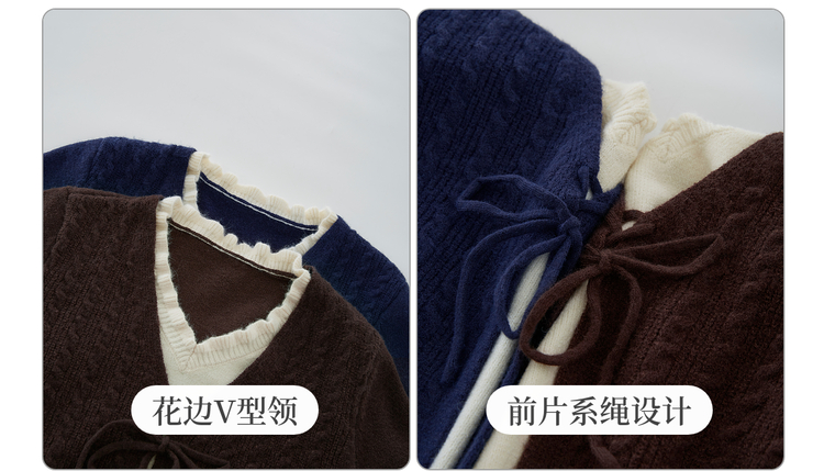 【年货节】熙世界复古假两件绞花长袖毛衣女2025秋冬新款撞色花边V领针织衫