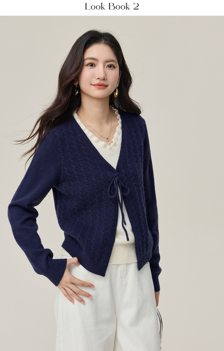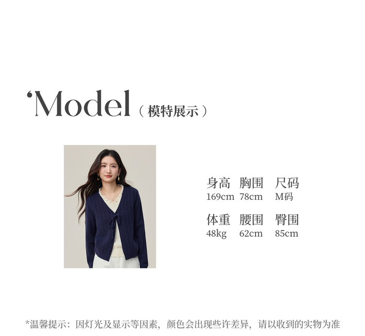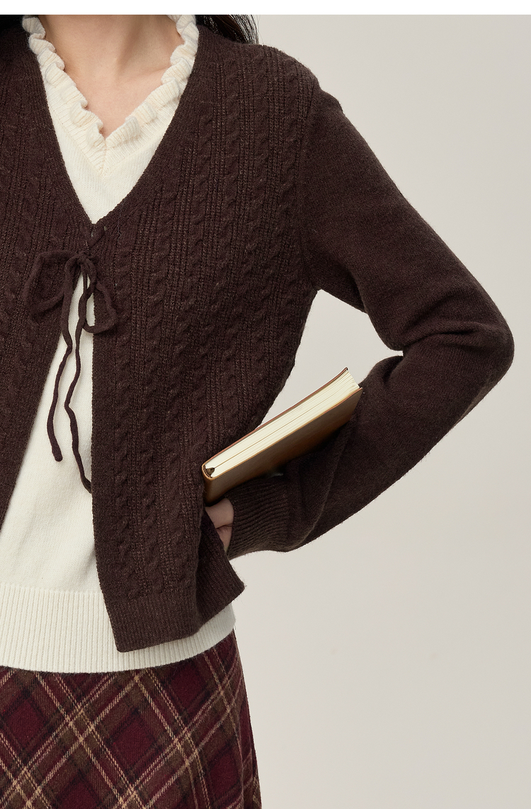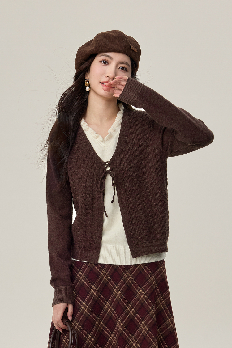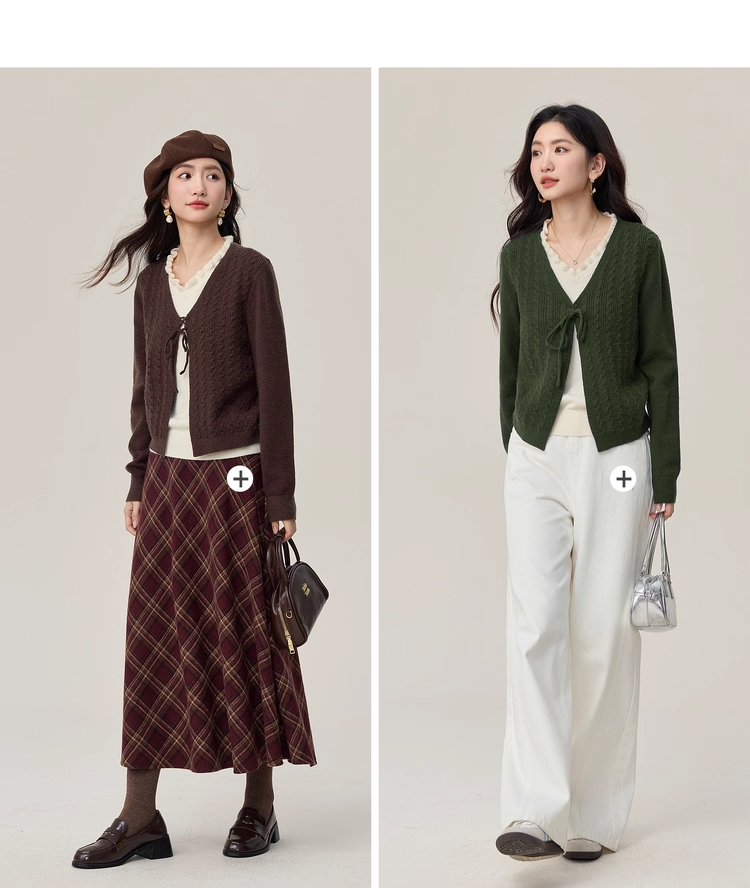 【年货节】熙世界复古假两件绞花长袖毛衣女2025秋冬新款撞色花边V领针织衫