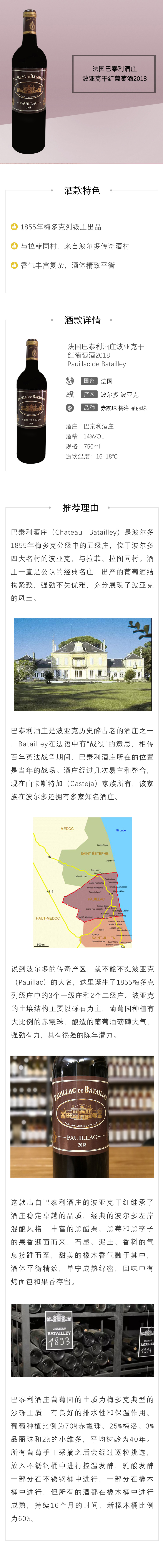 波尔多列级庄出品!法国巴泰利酒庄波亚克干红葡萄酒2018