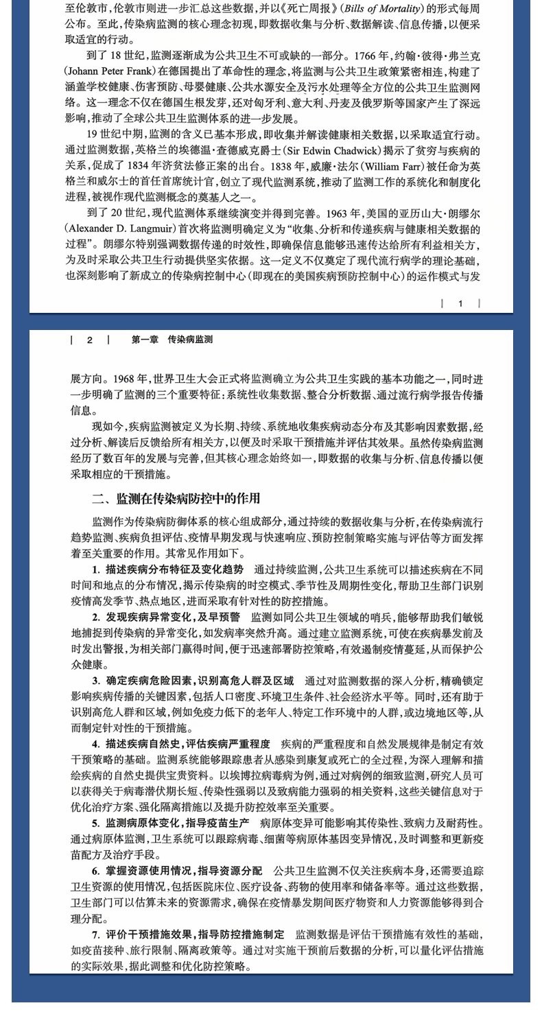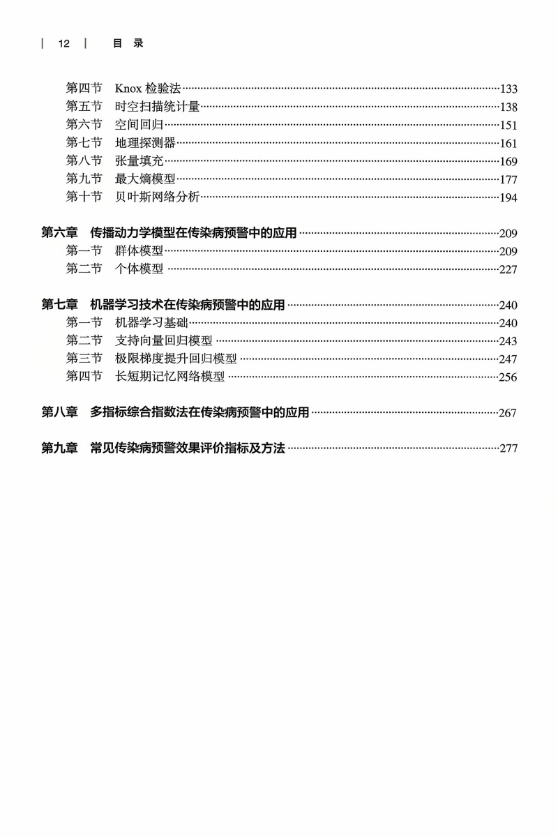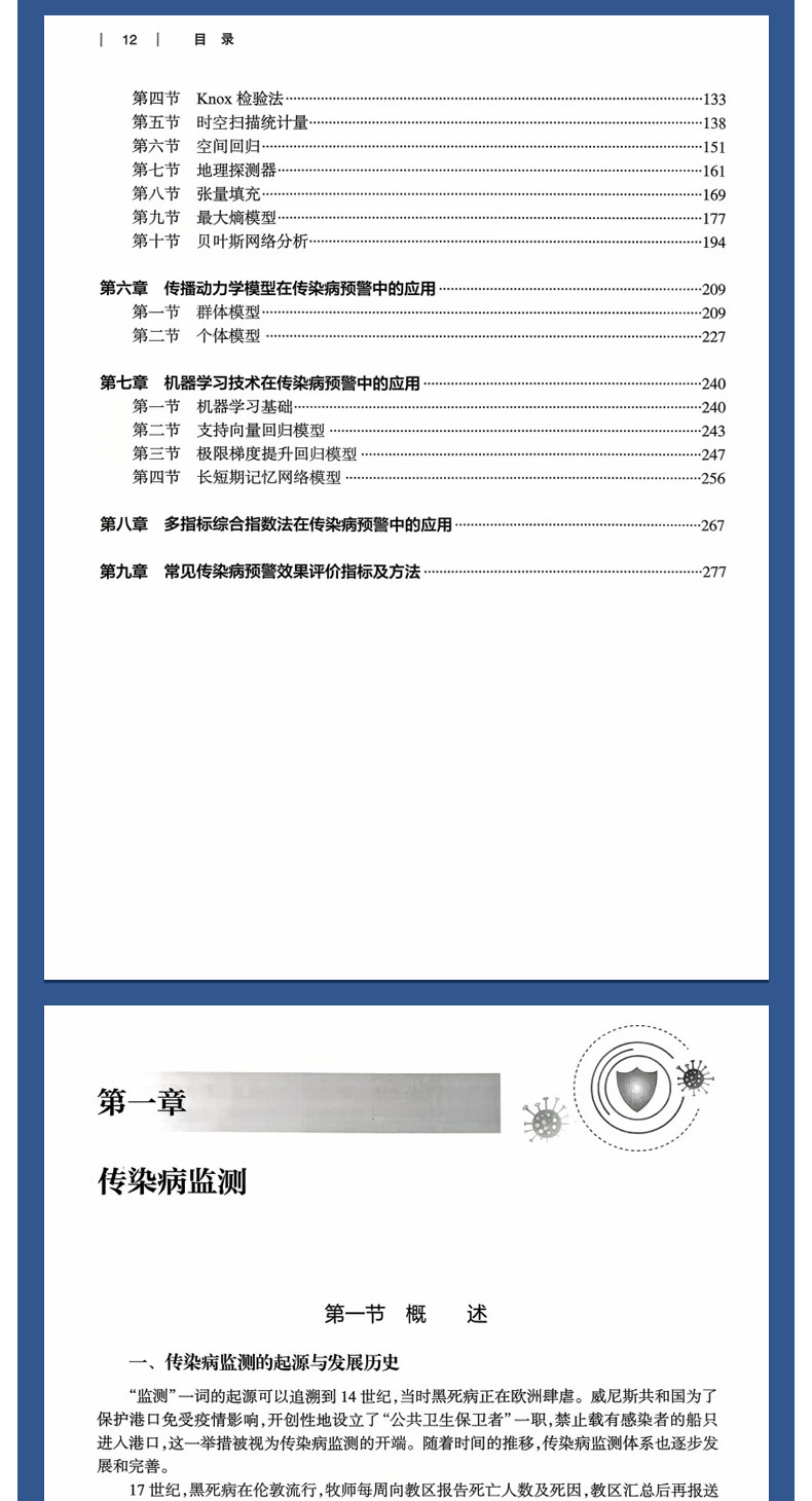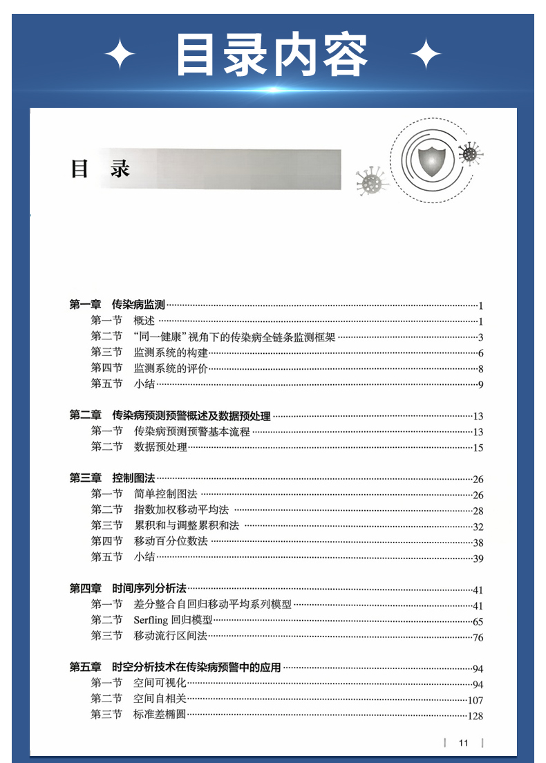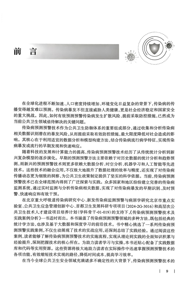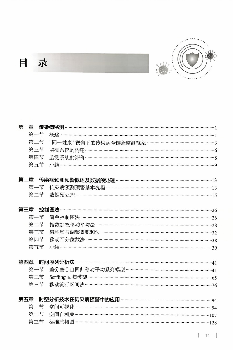 本书全面系统地介绍了传染病预测与预警的多种先进方法,涵盖传播动力学模型、统计预测模型、人工智能方法以及空间分析技术,为深入理解病原体传播规律提供理论支撑,从而实现精确预测疫情趋势,为防控决策提供科学依据。 1.预测:本书深入探讨了传统的传播动力学模型、现代的差分自回归移动平均(ARIMA)模型、前沿的深度学习模型,展现了预测技术的演进与革新,帮助准确判断疫情发展趋势,为疫情防控提供有力支持 2.预警:本书介绍了指数加权移动平均(EWMA)、累积和(CUSUM)等经典方法,以及调整Serfling模型、移动流行区间法(MEM)等创新技术。这些预警方法能够快速响应疫情变化,提前发现潜在风险,为及时采取防控措施赢得时间。